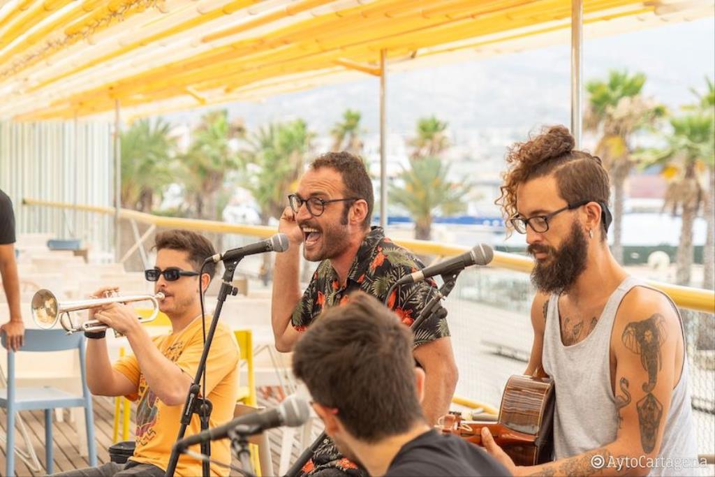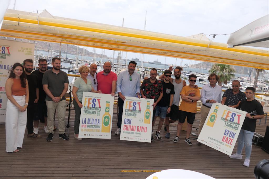 El festival anuncia una segunda edición que aumenta de una a tres las jornadas de celebración en septiembre en la explanada del centro comercial de La Rambla, destacando las actuaciones de La M.O.D.A., OBK, Chimo Bayo y, entre otros, los cartageneros DJ Javi y DJ Pipe, además de la banda Karmacadabra, a la que se observa en la foto durante su actuación esta mañana, en el acto de presentación del festival.