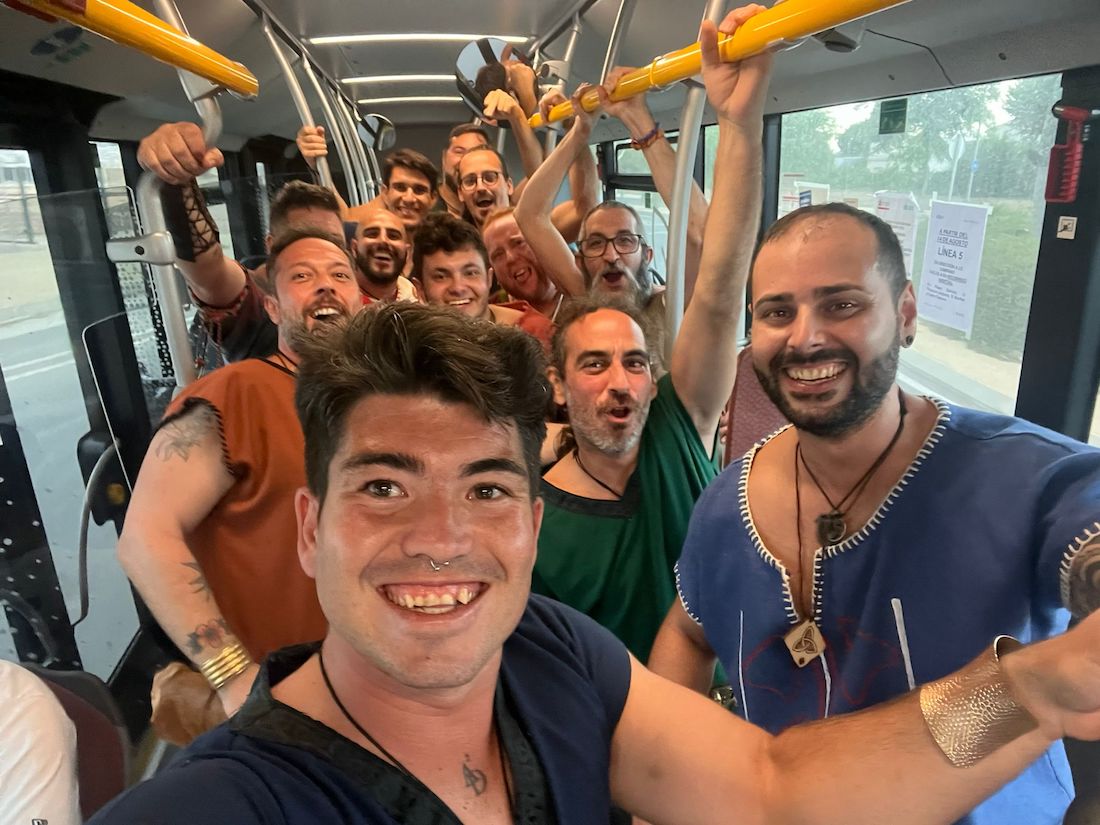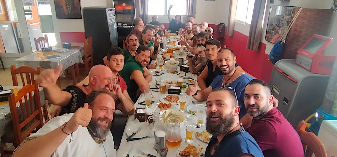 La tropa carthaginesa inspirada en los jinetes lusitanos que lucharon con Aníbal Barca incorpora once jóvenes este año, en el que han mejorado la infraestructura de su recinto de campamento. En la foto se observa a parte del grupo en el 'Día del hombre lusitano' que incluyó un almuerzo en el Bar-Tapería de la Casa de la Cultura de Molinos Marfagones.