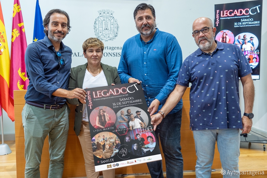 El evento LegadoCT Fest contará con las actuaciones de Elure, Aires de la Calle, Lydia Martín, Hombretuerca y Santi DJ. “Tenemos a lo mejor de nuestros artistas cartageneros emergentes en este festival. Cartagena es una cantera de grandes bandas, a las que estamos acostumbrados de ver crecer, como Arde Bogotá”, ha explicado durante la presentación la edil delegada de Turismo, Belén Romero. La banda de rock alternativo Elure, que incluso actuó en el festival Rock Imperium, iniciará LegadoCT Fest a las 21:30 horas. Después, sobre las once de la noche, será el turno de Aires de la Calle, que impregnan de alma rumbera su música. La cantante Lydia Martín presentará su último trabajo en exclusiva destilando pop con melodías pegadizas. A partir de las una y veinte de la madrugada se subirá al escenario la banda de rock Hombretuerca. Y el rey de la madrugada será Santi DJ.