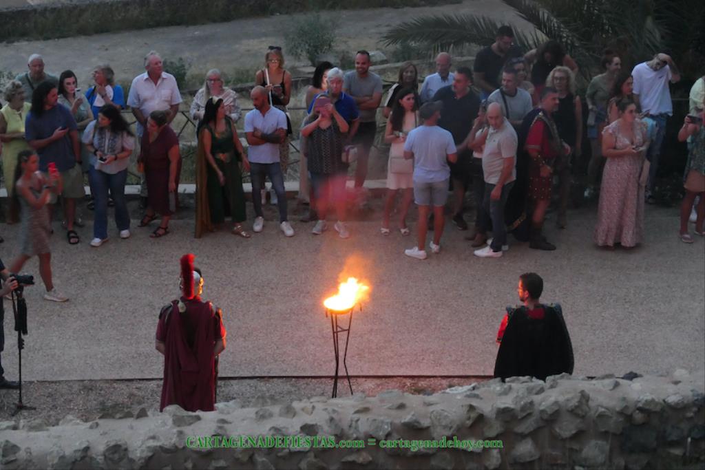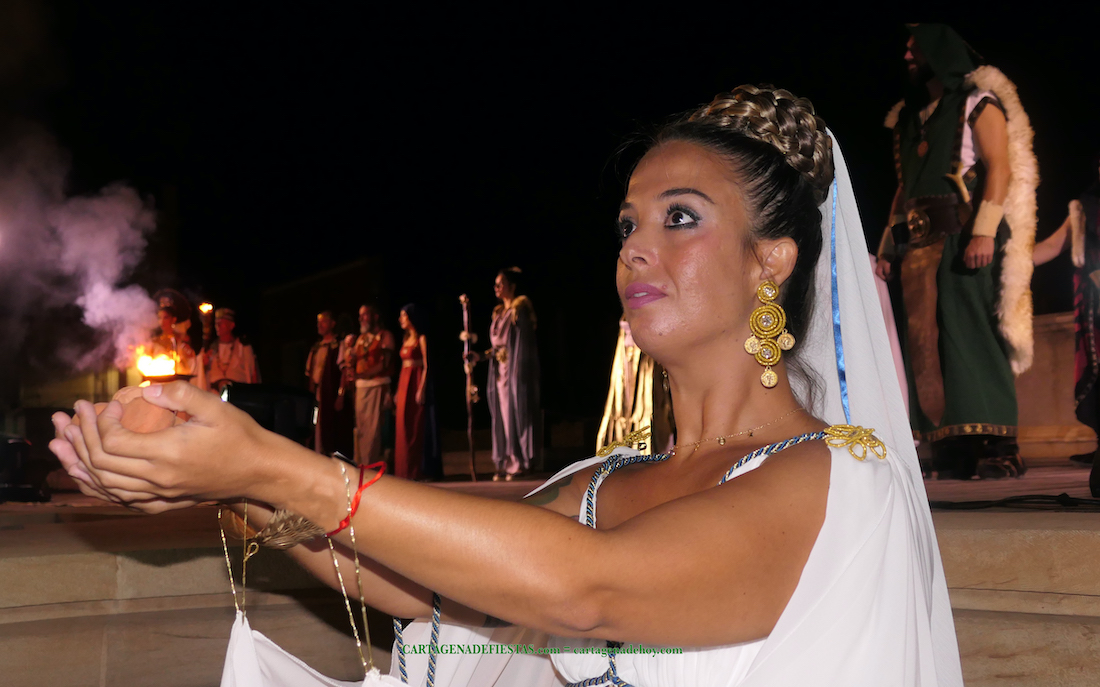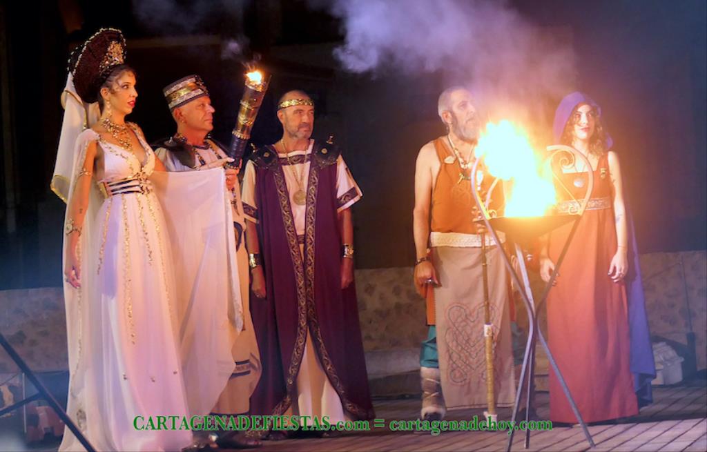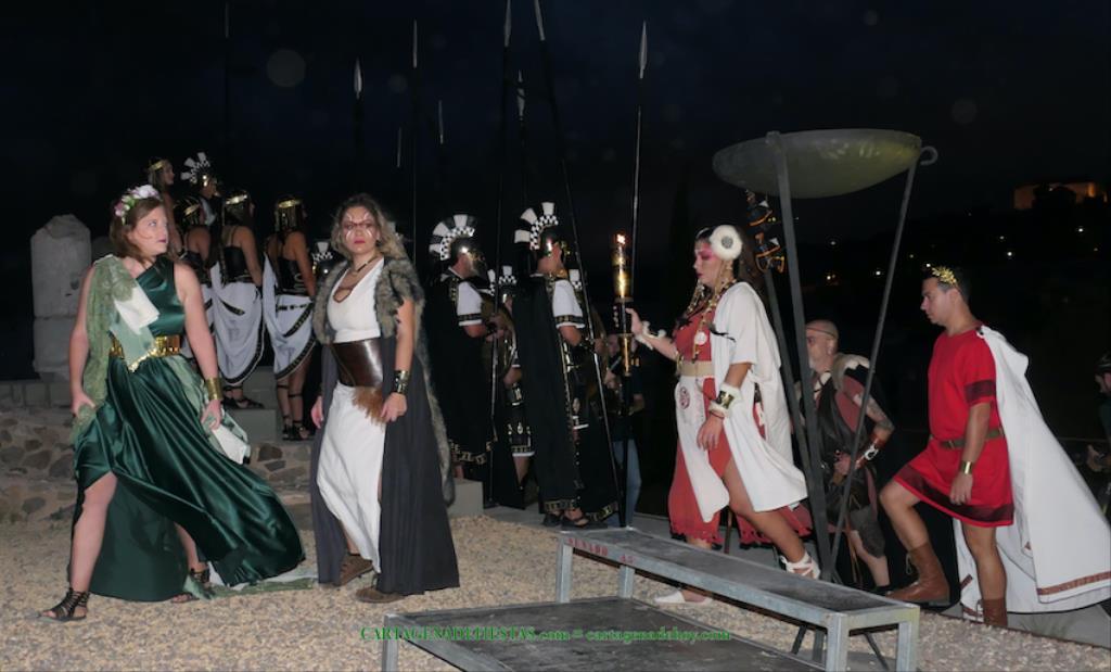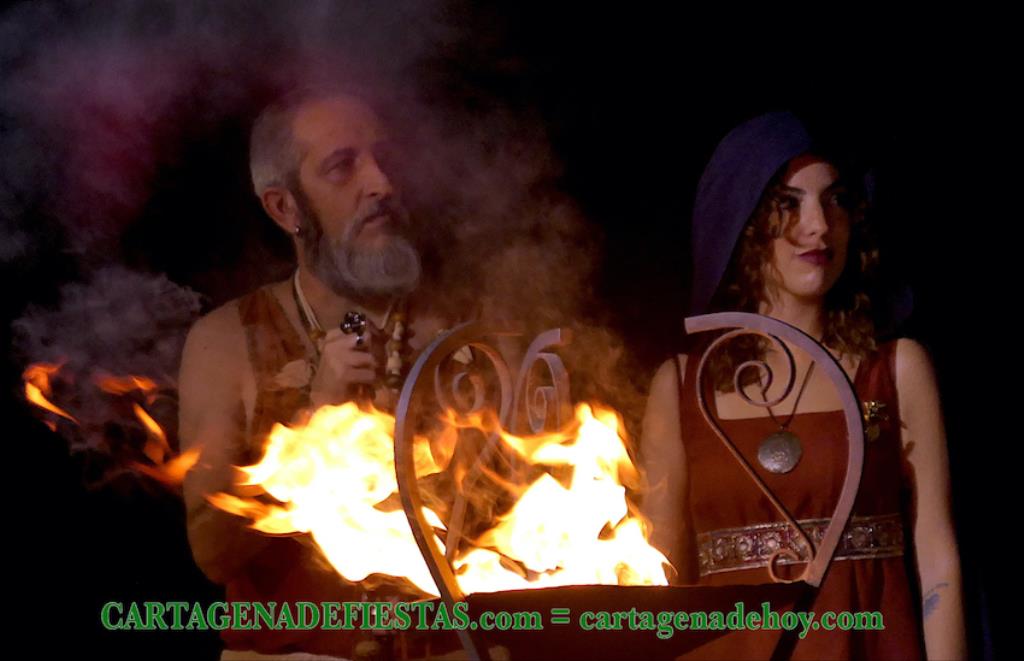 La llamada sagrada ha llegado al Molinete, donde ha aparecido sin invitación 'Eolo', el dios del viento, pero, aunque ha apagado varias veces el fuego, no ha conseguido deslucir un ágil y bello acto de inicio de Carthagineses y Romanos, que después se ha enriquecido con otro en el Teatro Romano.