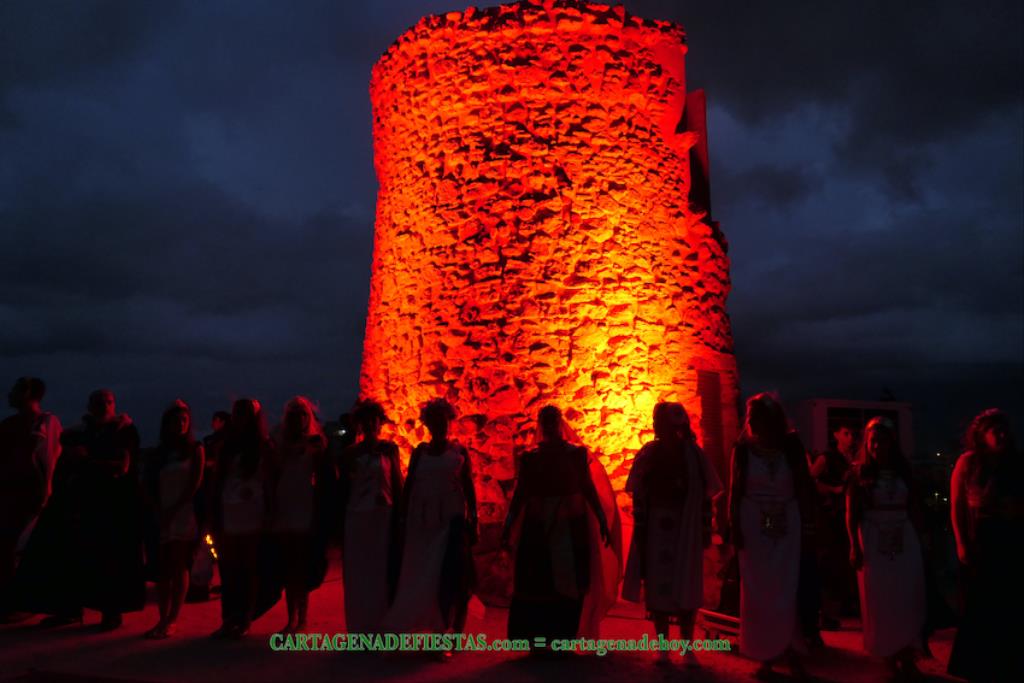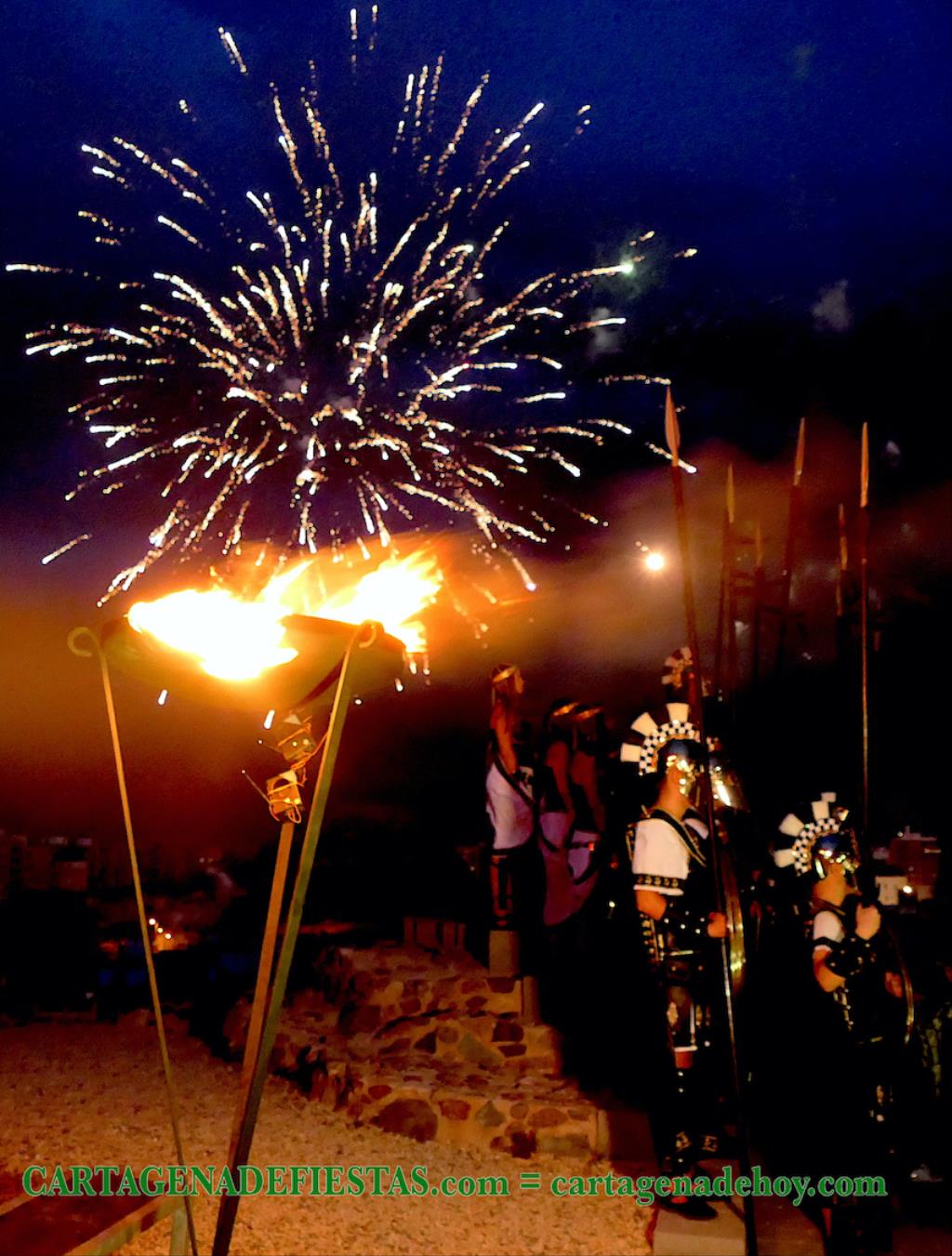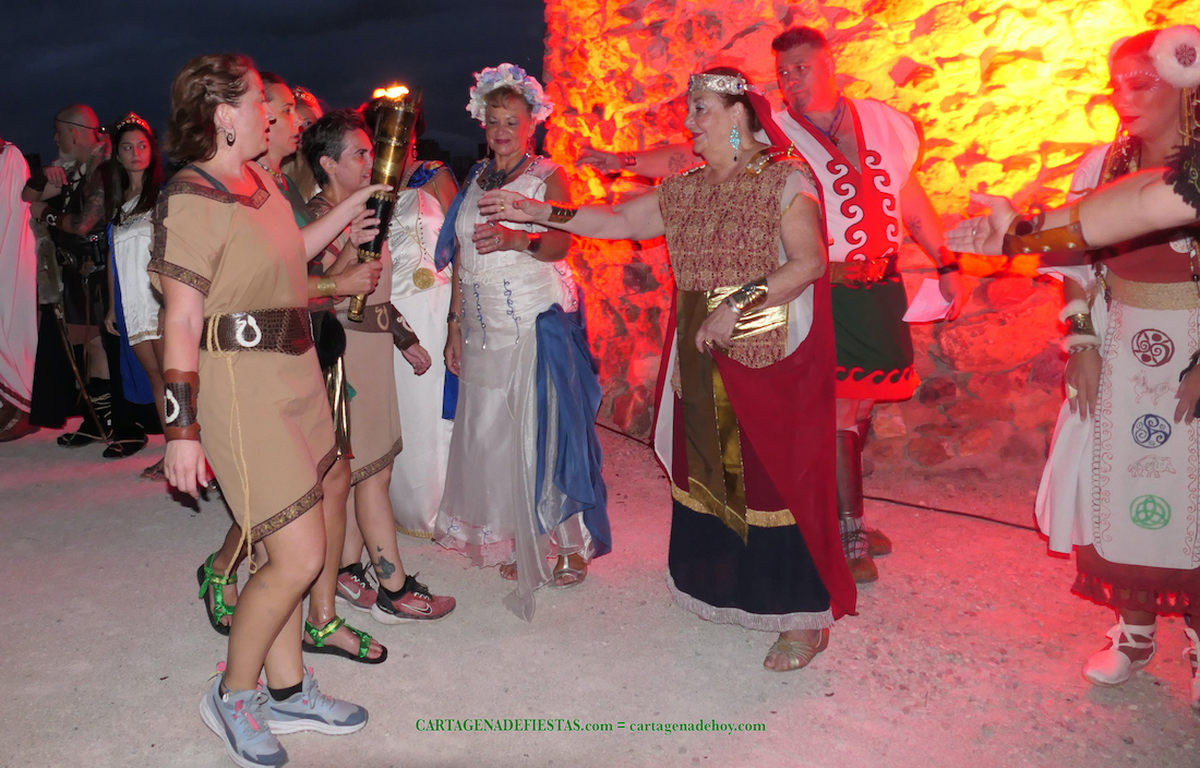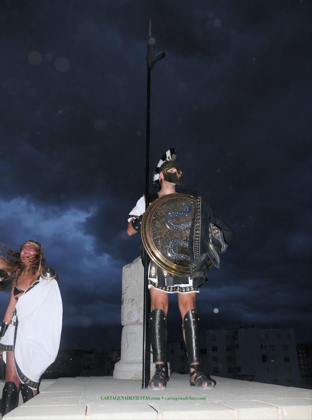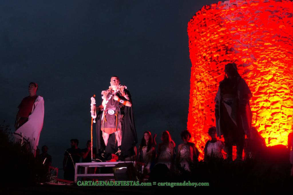 El punto de destino era el Molinete (Mons Arx Asdrúbalis) donde se ha encontrado con un cielo cargado de rayos y ráfagas de fuerte viento que ha provocado que, al menos tres veces, hubiese que volver a encender la llama. Por cierto, también 'Eolo' ha fastidiado algunos encendidos de las otras cuatro colinas. Allí, junto a las ruinas del molino, muy llamativo con el torno rojizo aplicado por los focos, ha tenido lugar un ágil acto en el que se ha dado la bienvenida al fuego, para después una sacerdotisa encender el pebetero que custodiaban los lanceros hoplitas, mientras que una amplia representación de tropas y legiones formaban un círculo alrededor de una escena contemplada por muchos cartageneros y visitantes. Muy bien organizado ha estado este capítulo.