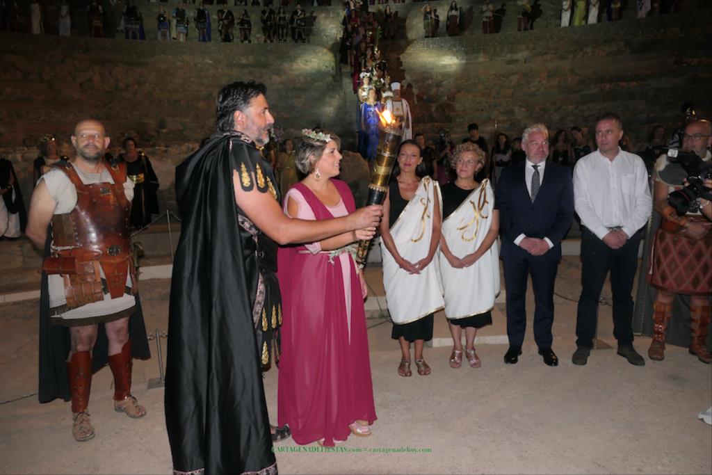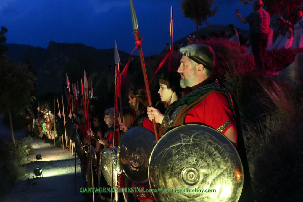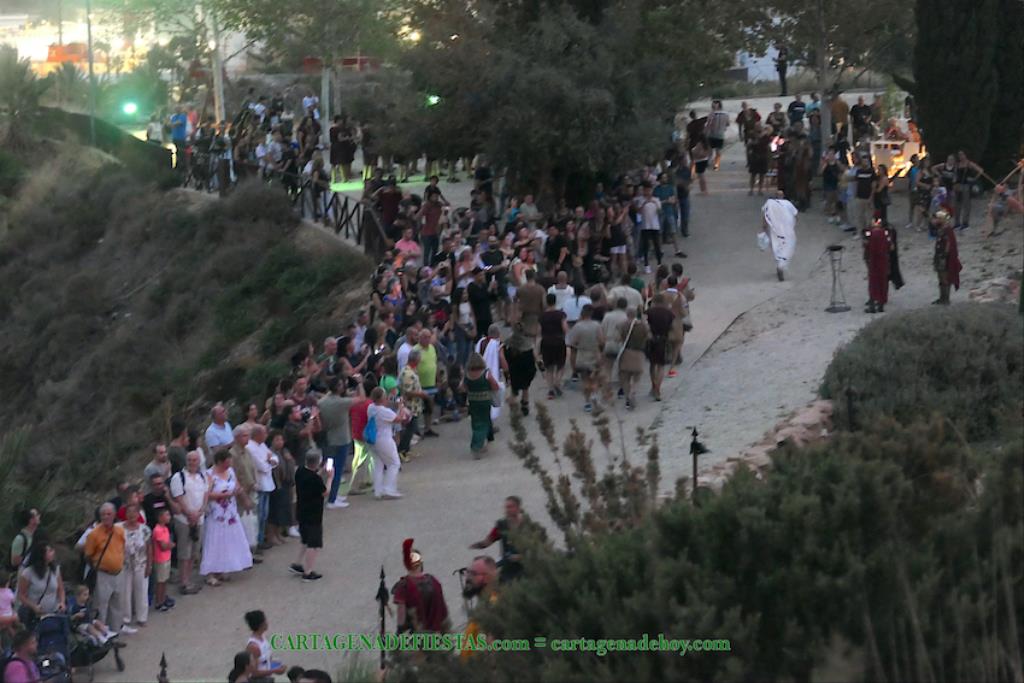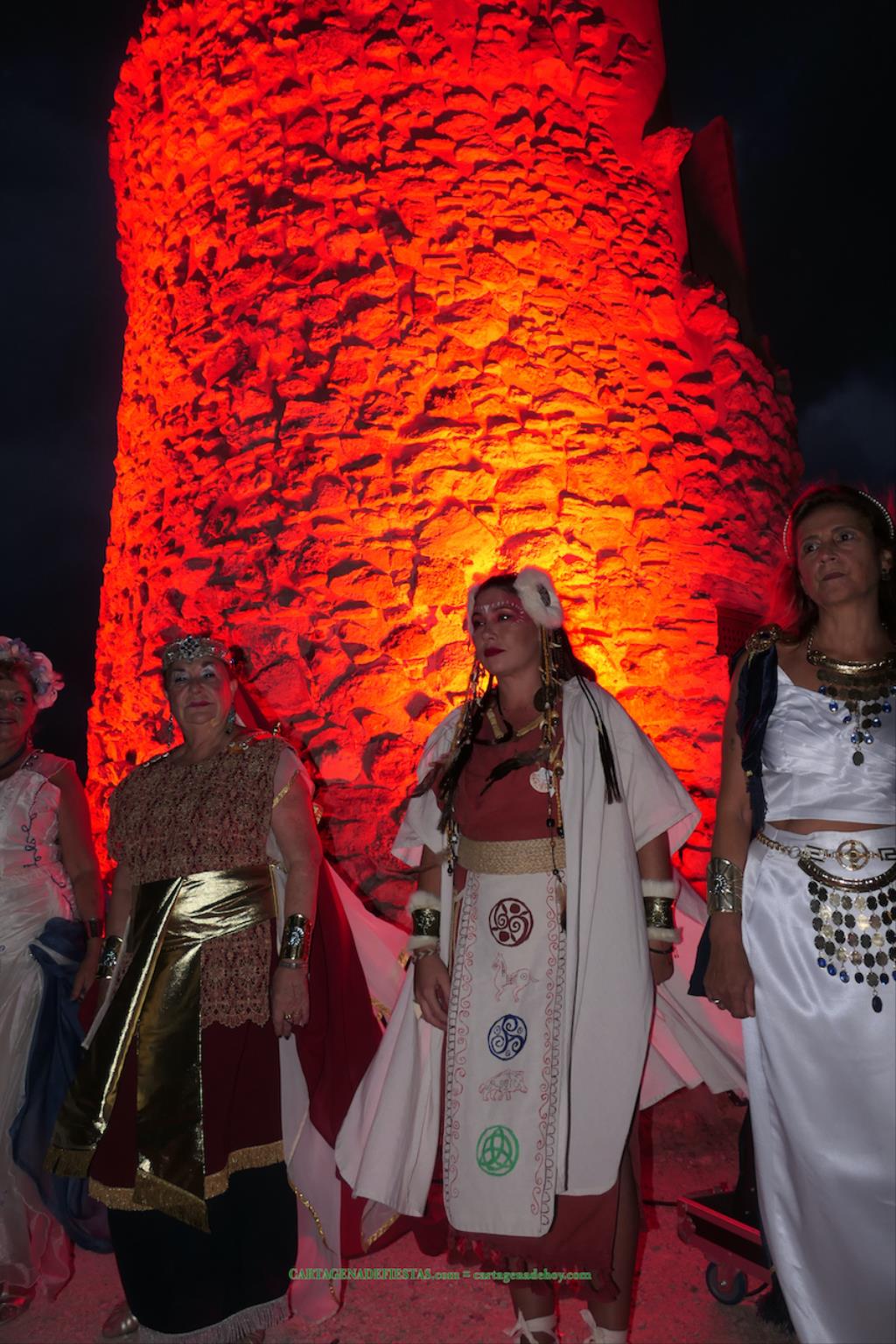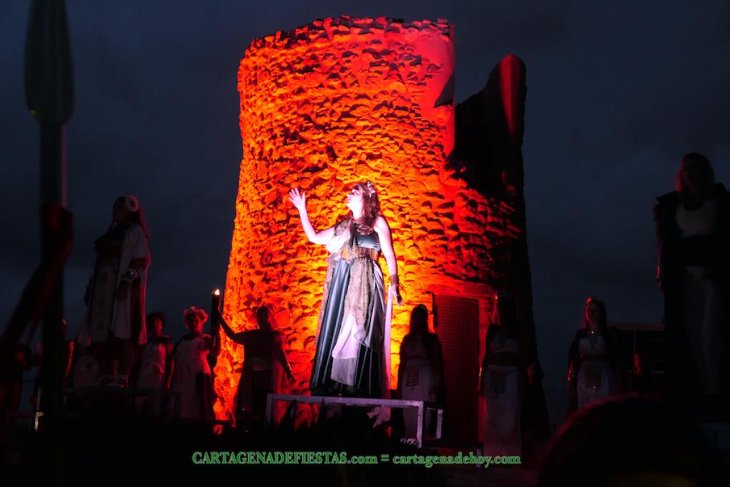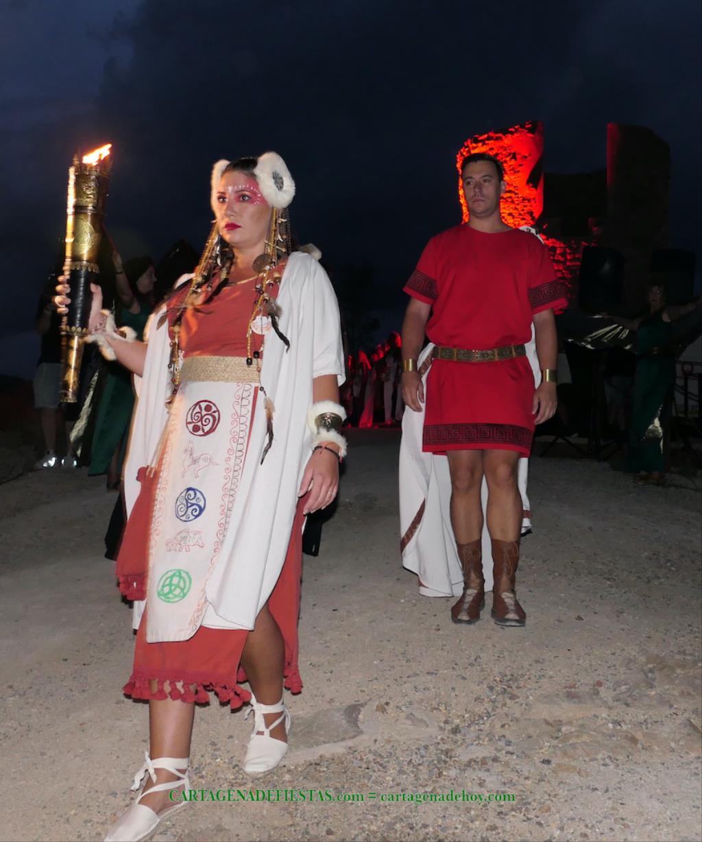 El punto de destino era el Molinete (Mons Arx Asdrúbalis) donde se ha encontrado con un cielo cargado de rayos y ráfagas de fuerte viento que ha provocado que, al menos tres veces, hubiese que volver a encender la llama. Por cierto, también 'Eolo' ha fastidiado algunos encendidos de las otras cuatro colinas. Allí, junto a las ruinas del molino, muy llamativo con el torno rojizo aplicado por los focos, ha tenido lugar un ágil acto en el que se ha dado la bienvenida al fuego, para después una sacerdotisa encender el pebetero que custodiaban los lanceros hoplitas, mientras que una amplia representación de tropas y legiones formaban un círculo alrededor de una escena contemplada por muchos cartageneros y visitantes. Muy bien organizado ha estado este capítulo.