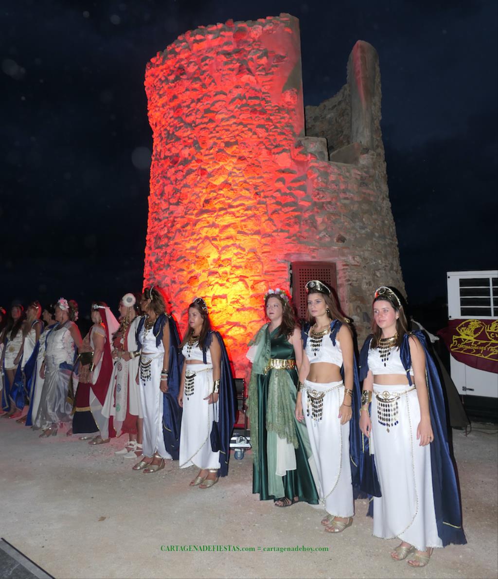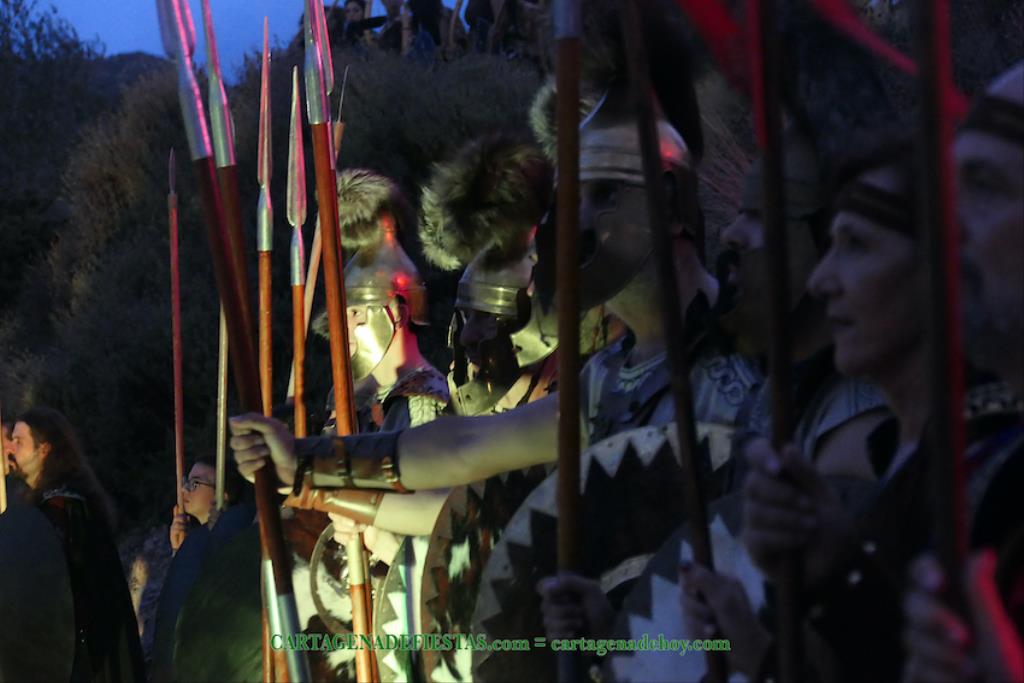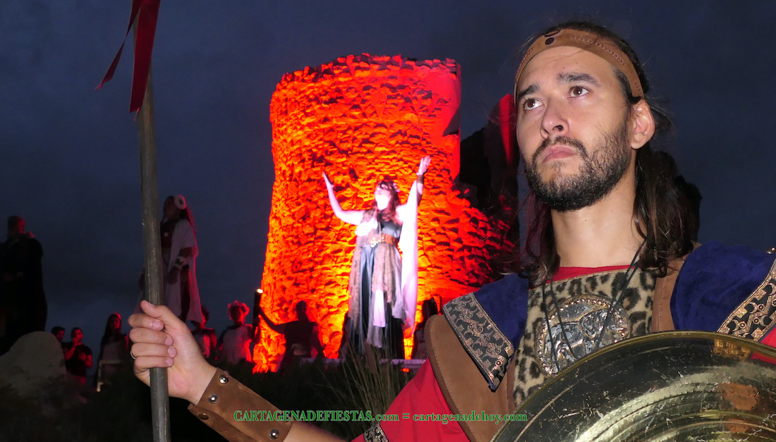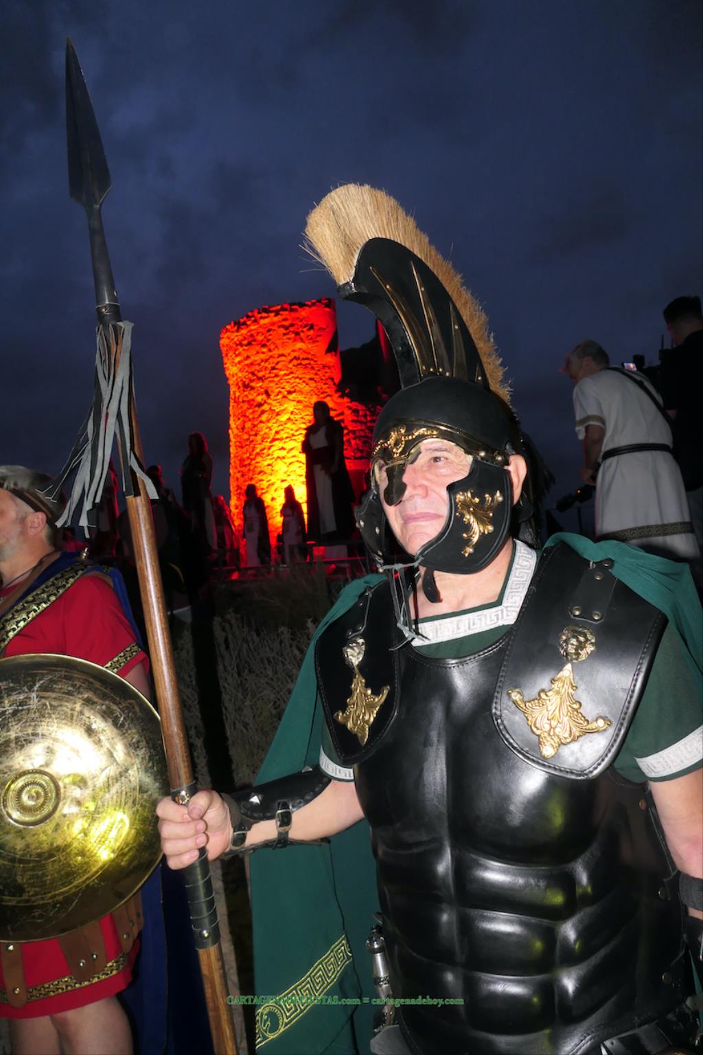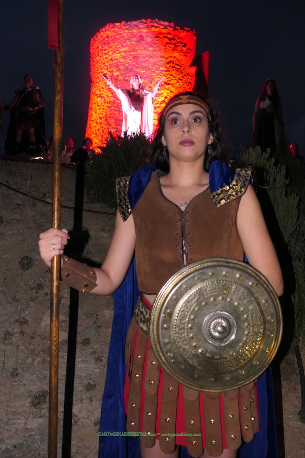 El punto de destino era el Molinete (Mons Arx Asdrúbalis) donde se ha encontrado con un cielo cargado de rayos y ráfagas de fuerte viento que ha provocado que, al menos tres veces, hubiese que volver a encender la llama. Por cierto, también 'Eolo' ha fastidiado algunos encendidos de las otras cuatro colinas. Allí, junto a las ruinas del molino, muy llamativo con el torno rojizo aplicado por los focos, ha tenido lugar un ágil acto en el que se ha dado la bienvenida al fuego, para después una sacerdotisa encender el pebetero que custodiaban los lanceros hoplitas, mientras que una amplia representación de tropas y legiones formaban un círculo alrededor de una escena contemplada por muchos cartageneros y visitantes. Muy bien organizado ha estado este capítulo.