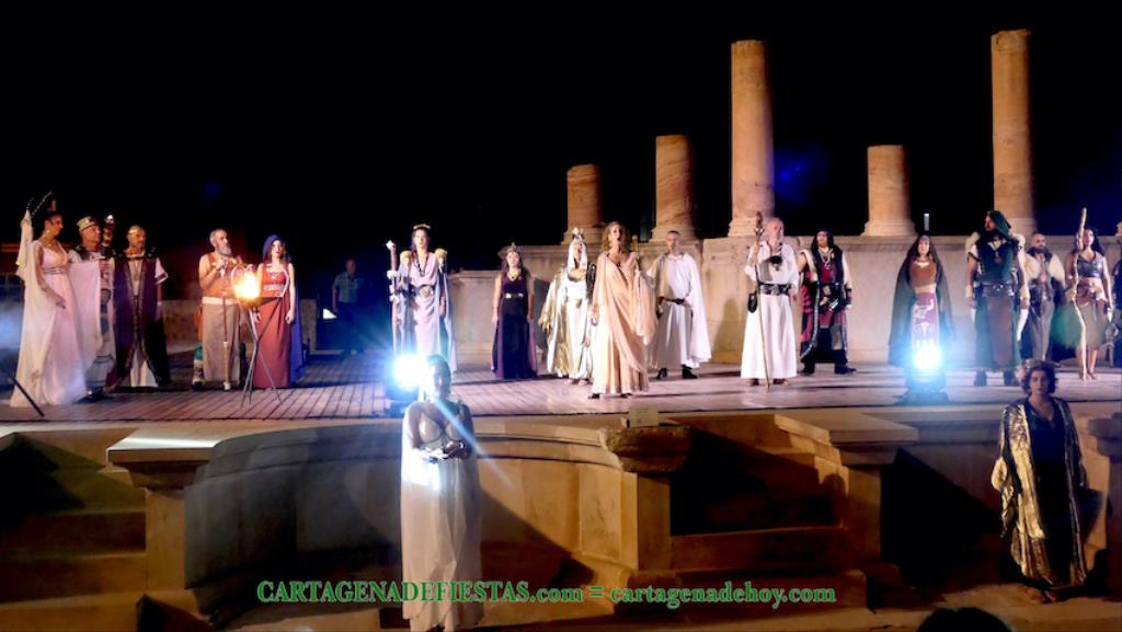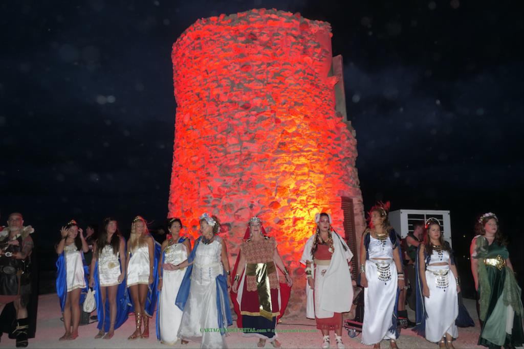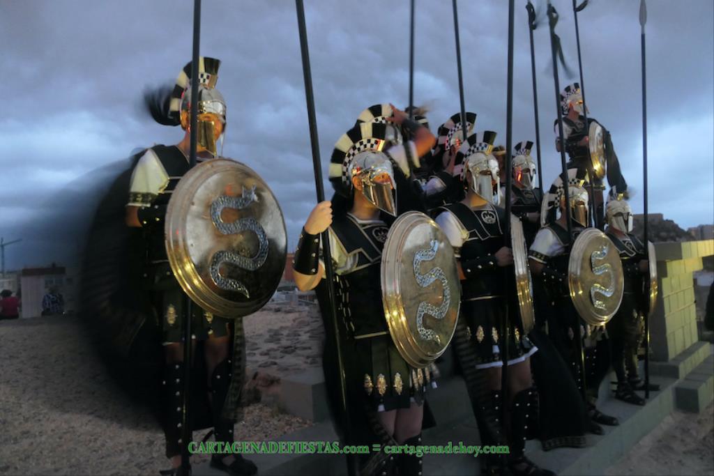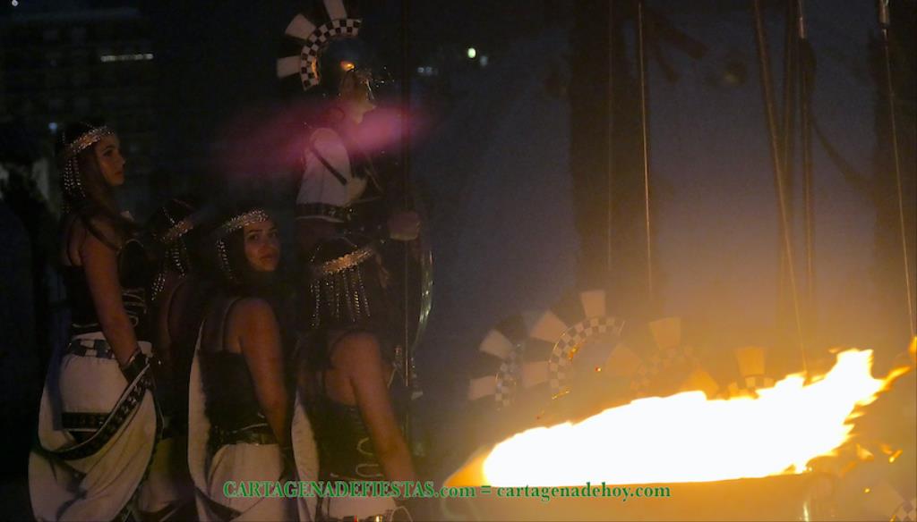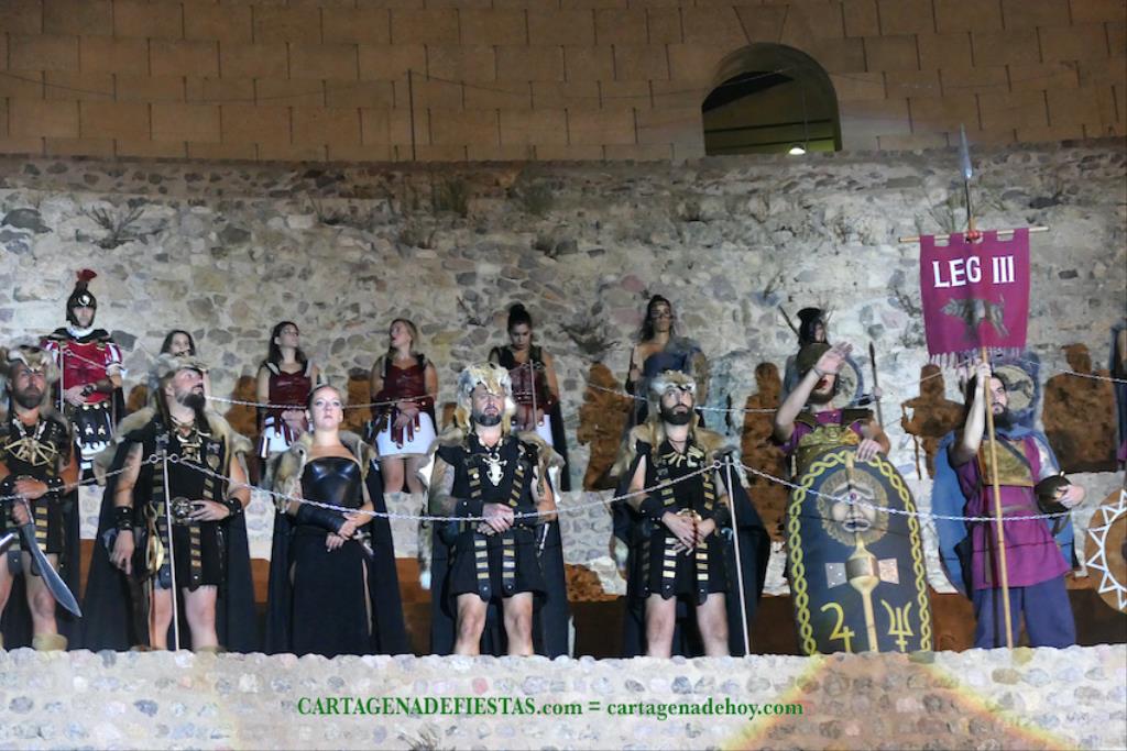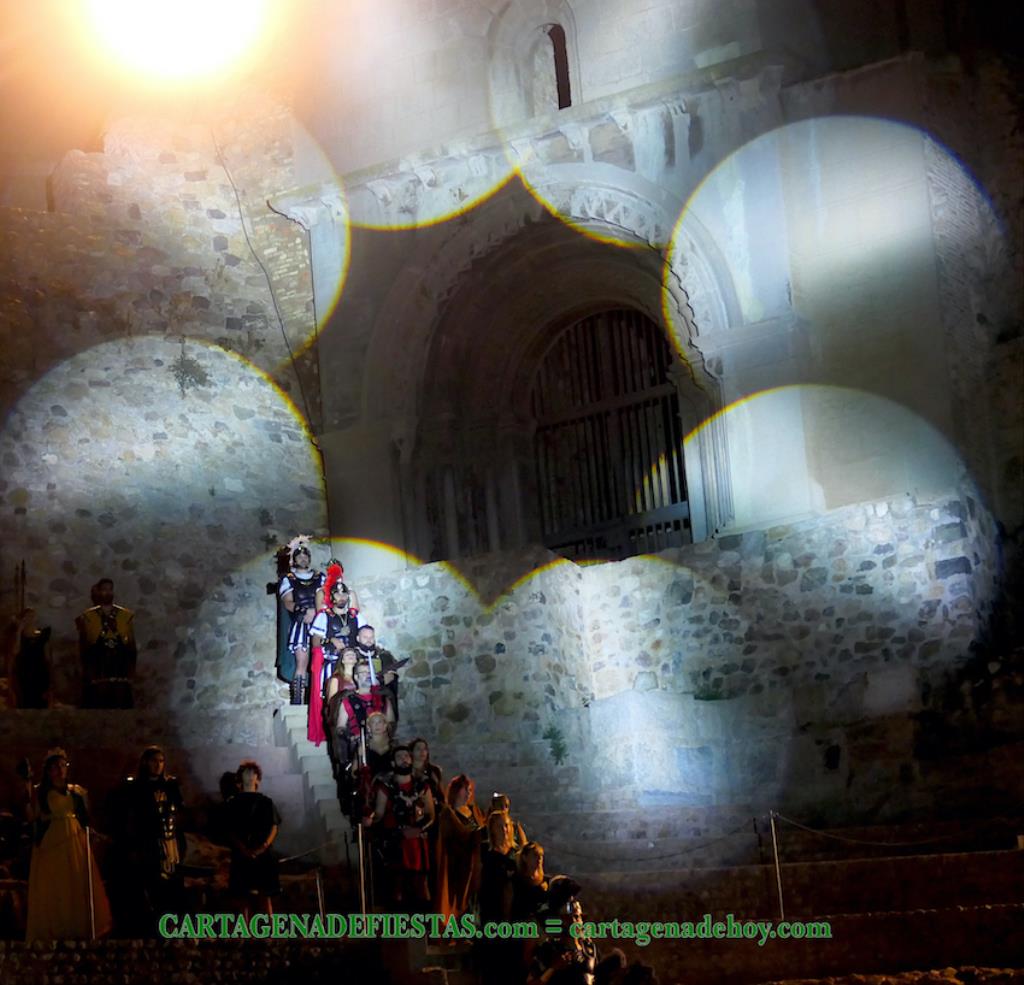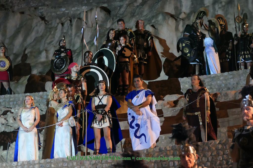 El punto de destino era el Molinete (Mons Arx Asdrúbalis) donde se ha encontrado con un cielo cargado de rayos y ráfagas de fuerte viento que ha provocado que, al menos tres veces, hubiese que volver a encender la llama. Por cierto, también 'Eolo' ha fastidiado algunos encendidos de las otras cuatro colinas. Allí, junto a las ruinas del molino, muy llamativo con el torno rojizo aplicado por los focos, ha tenido lugar un ágil acto en el que se ha dado la bienvenida al fuego, para después una sacerdotisa encender el pebetero que custodiaban los lanceros hoplitas, mientras que una amplia representación de tropas y legiones formaban un círculo alrededor de una escena contemplada por muchos cartageneros y visitantes. Muy bien organizado ha estado este capítulo.