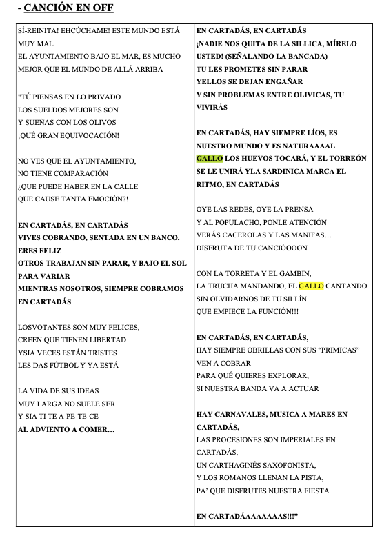 En cuanto a las caracterizaciones, todas tuvieron buena acogida entre el público, como se reflejó en los aplausos. La primera en salir fue la 'Barbinica' en su caja de muñecas, después fue la 'Sí-Reinita' con una coreografía en la que también estaba 'Gallo' (MC) y un gambón, siendo la letra de la canción la que figura en el cuadro adjunto.