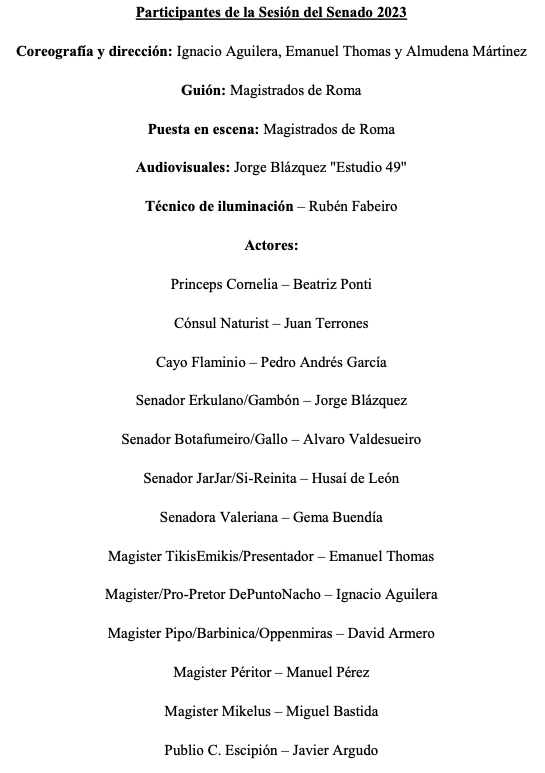 Cerró Miguel Bastida, el único que queda de esta sesión desde su origen. Y lo hizo con el tradicional: "Senado y pueblo de Roma, así lo habéis oído y sois testigos de lo que aquí ha ocurrido, id y propagarlo por todo el imperio. Carthago Delenda Est". Bastida ha sido durante años también el Princeps de la sesión, papel que desde 2022 encarna, por vez primera, una senadora: Beatriz Ponti. El segundo más veterano de la sesión es Juan Terrenos, quien lleva unos veinte años como 'Cónsul Naturist'. En cuanto a público, bastantes cientos teniendo en cuenta que era una tarde con chispeos de lluvia.