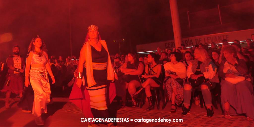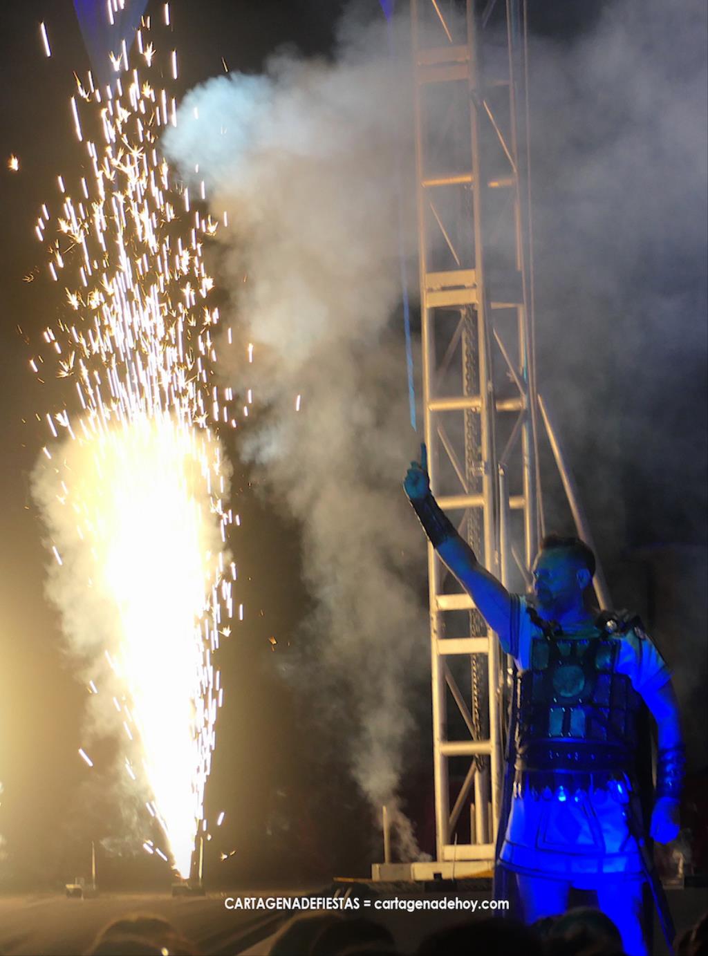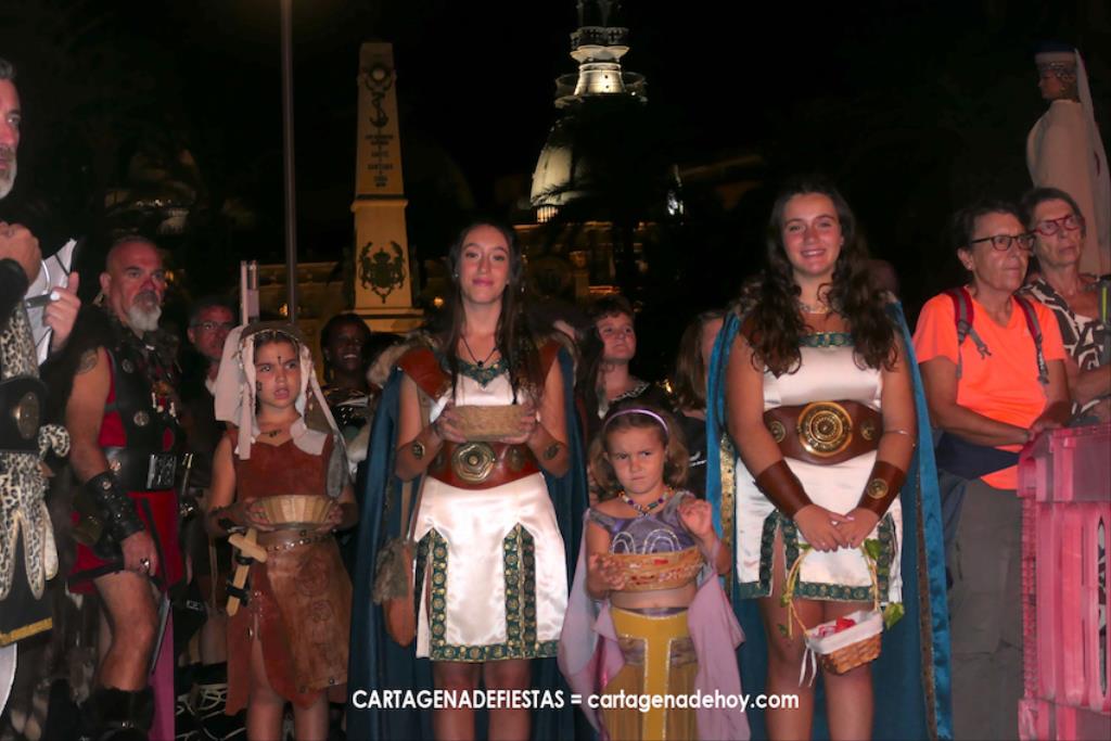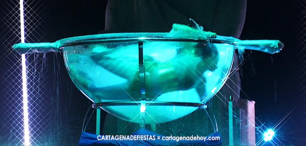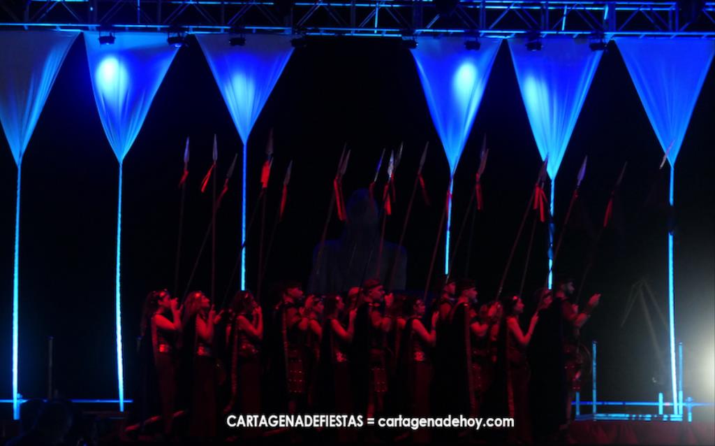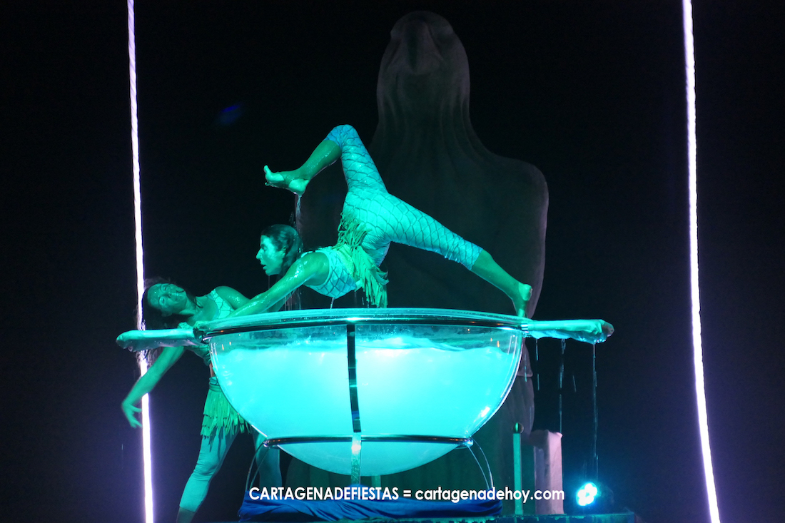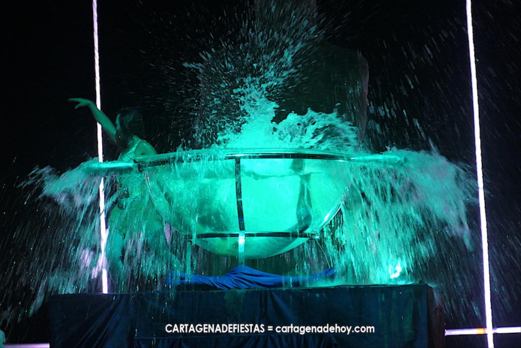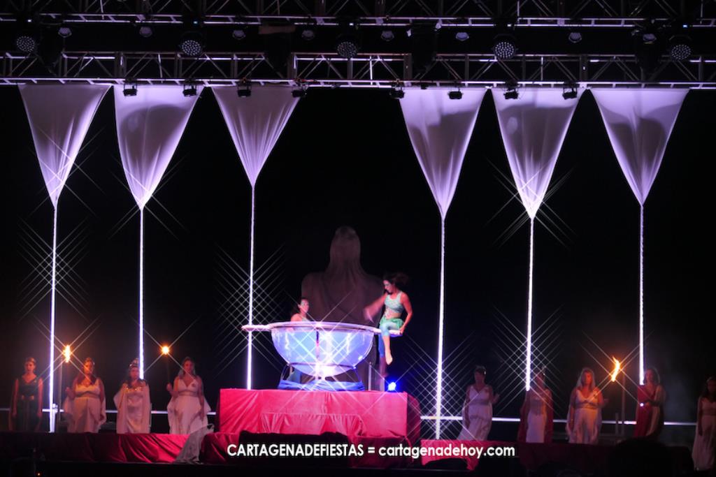 Otra novedad fue la danza en una gran copa de agua del dúo 'Crus Crus'. Tan maravillosa que cautivó a todos los presentes. También tenemos que referirnos a Amílcar Barca 'El Rayo', el papá de 'la camada del león', cuya aparición está vez tras el sonoro rayo es por encima de la cabeza del dios Baal, bajo un fuerte aroma a pólvora.