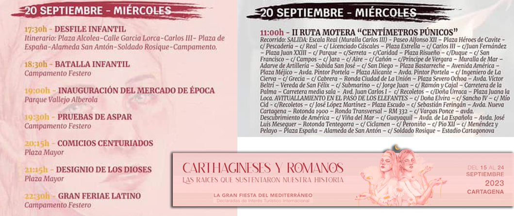 Las motos de la segunda ruta ‘Centímetros púnicos’ rugirán por la mañana, mientras que la tarde tiene varios capítulos. El primero es infantil con desfile y batalla más las ‘Pruebas de Aspar’, el segundo es la apertura del mercado época y el tercero es romano con el nuevo guión de la obra ‘Comicios centuriados’ (en la foto un grupo de sus actores) y el ‘Designio de los dioses’ de la legión Extraordinarii. Después, en el campamento, la gran feria de viandas, brebajes y actuaciones en la calle de ‘los hijos de la loba’.