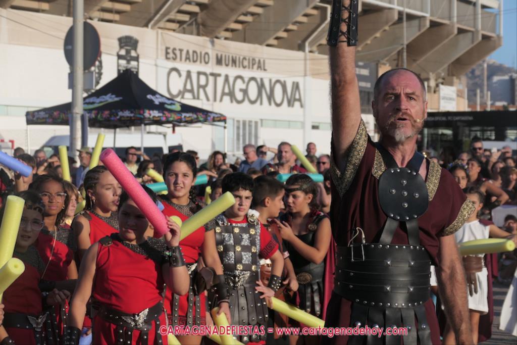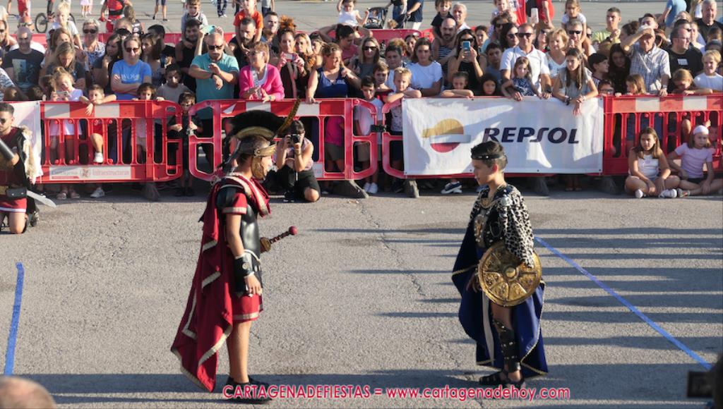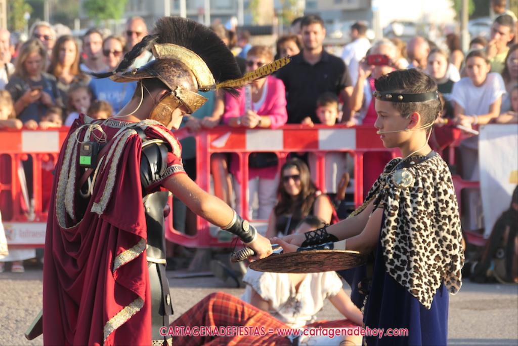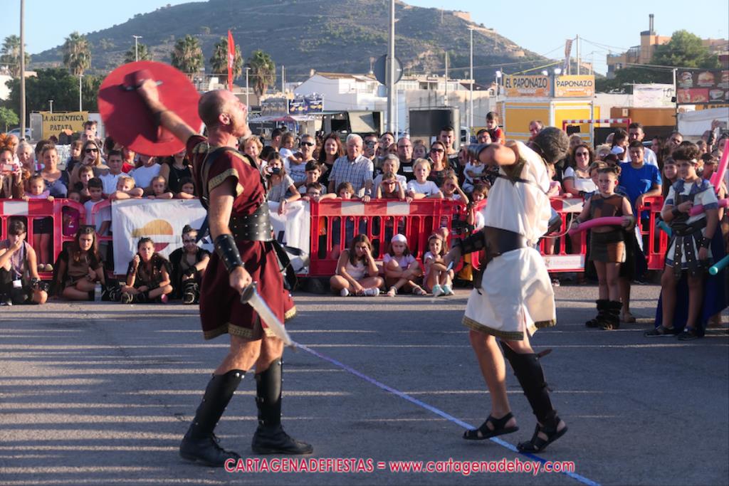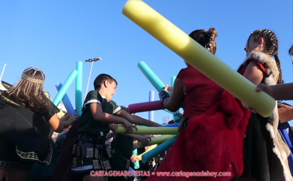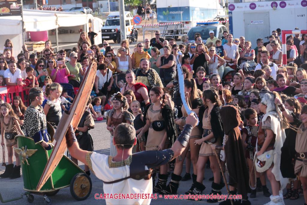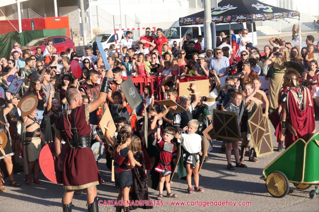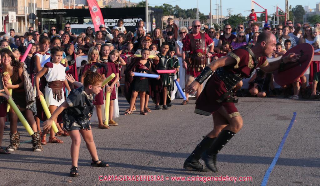 Un servidor conoce Carthagineses y Romanos desde su origen y ha sido testigo de cómo ha evolucionado la gran batalla entre ambos bandos desde que se inició en la escalera de Carlos III de la Muralla del Mar, para después pasar a la entonces explanada de tierra que estaba enfrente, donde el público rodeada en pie a los combatientes. Pues bien, ayer, la batalla infantil me recordó mucho aquellos momentos, pero cambiando a los guerreros y legionarios mayorcitos por zagalicos. En esta ocasión el campo de batalla era de asfalto ante la fachada del campamento, lo que era novedad con respecto a la edición del estreno en 2022. Además, se ha ganado en coordinación y estructura con movimientos claros y marcas en el suelo para que unos y otros mostrasen bien al espectador su rol en el combate.