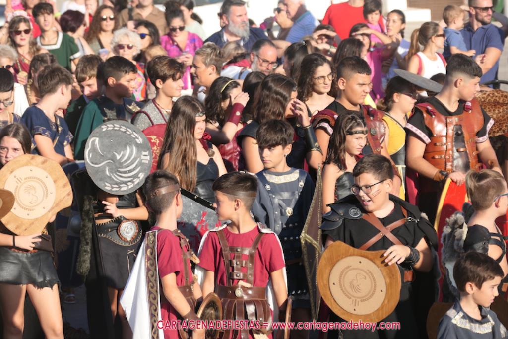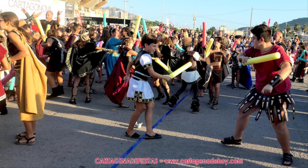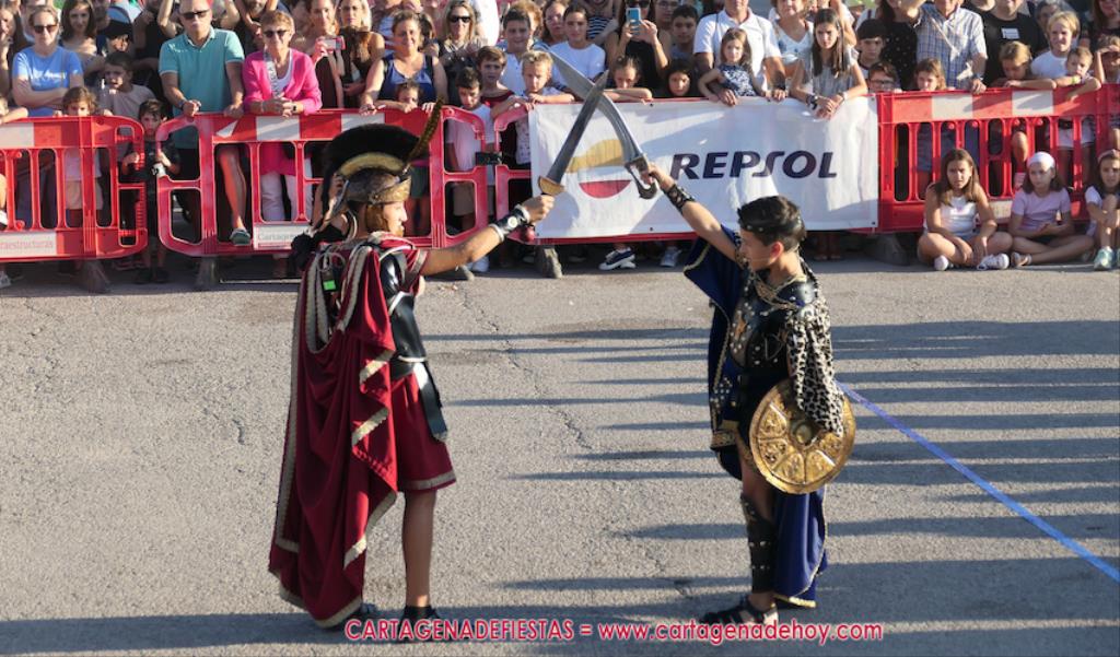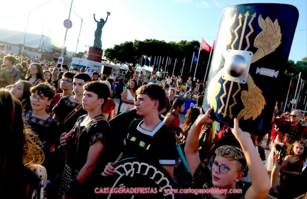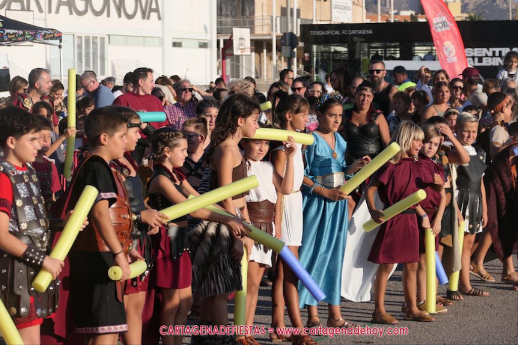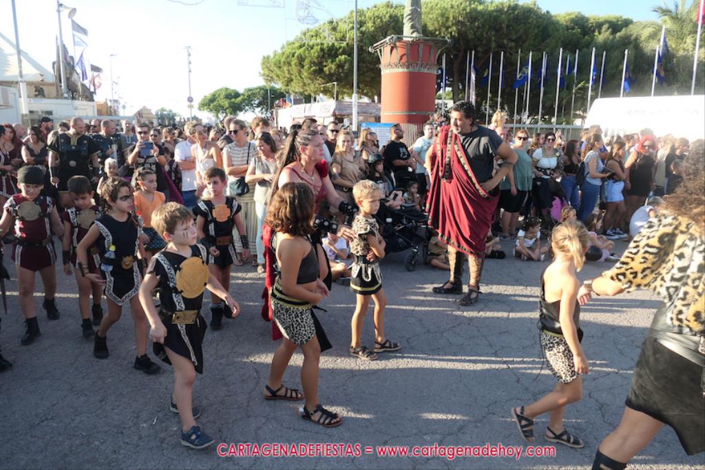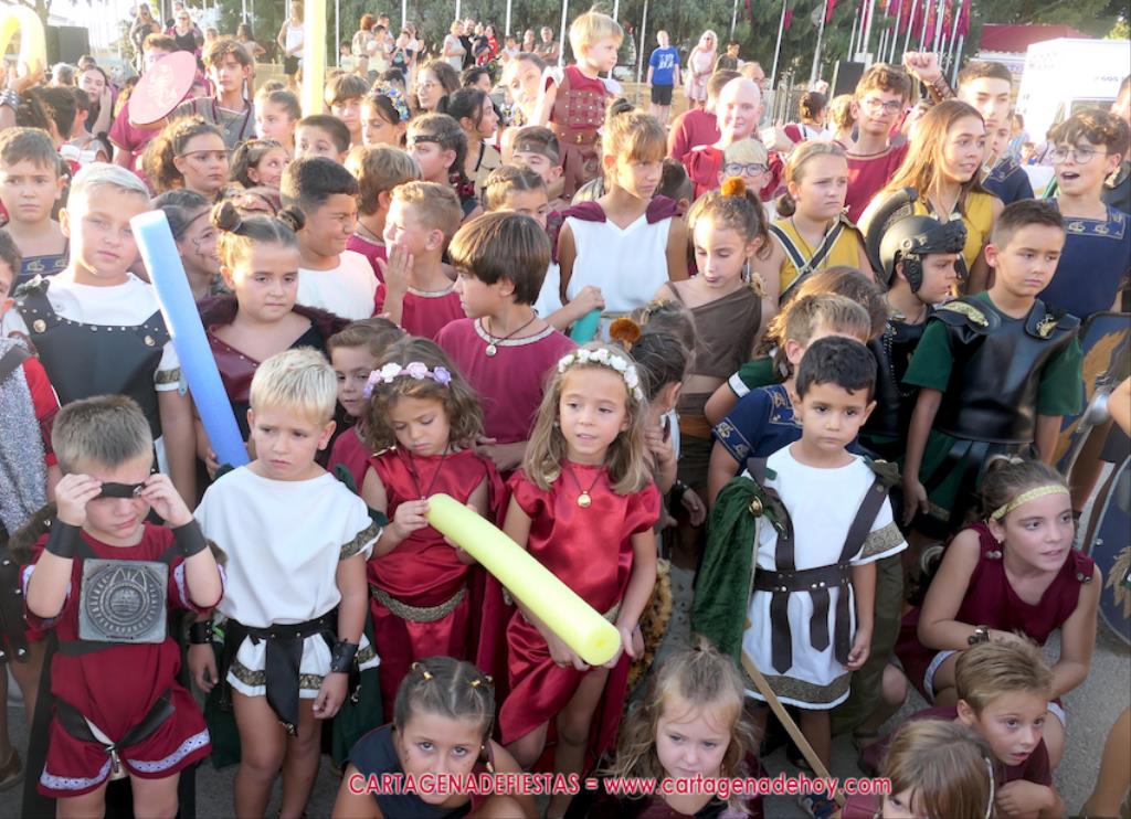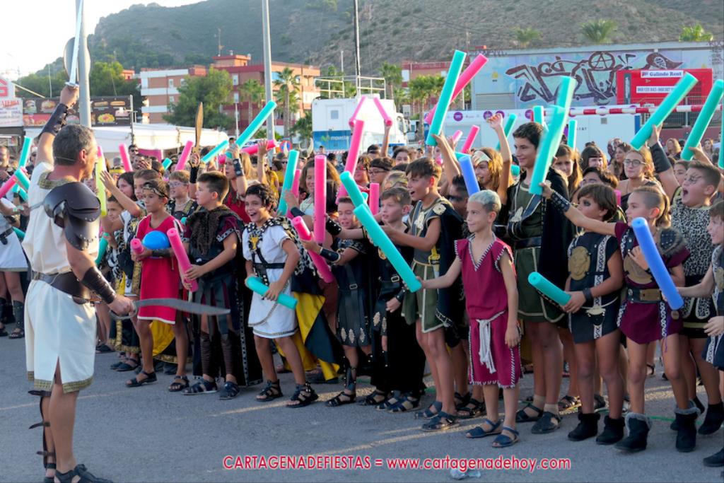 Un servidor conoce Carthagineses y Romanos desde su origen y ha sido testigo de cómo ha evolucionado la gran batalla entre ambos bandos desde que se inició en la escalera de Carlos III de la Muralla del Mar, para después pasar a la entonces explanada de tierra que estaba enfrente, donde el público rodeada en pie a los combatientes. Pues bien, ayer, la batalla infantil me recordó mucho aquellos momentos, pero cambiando a los guerreros y legionarios mayorcitos por zagalicos. En esta ocasión el campo de batalla era de asfalto ante la fachada del campamento, lo que era novedad con respecto a la edición del estreno en 2022. Además, se ha ganado en coordinación y estructura con movimientos claros y marcas en el suelo para que unos y otros mostrasen bien al espectador su rol en el combate.