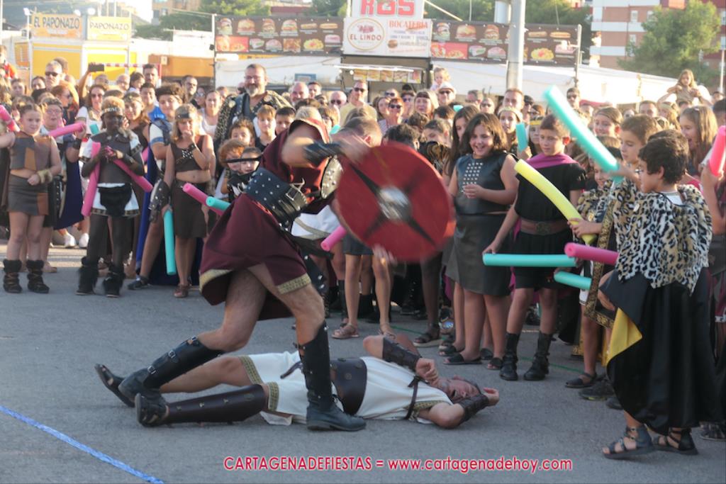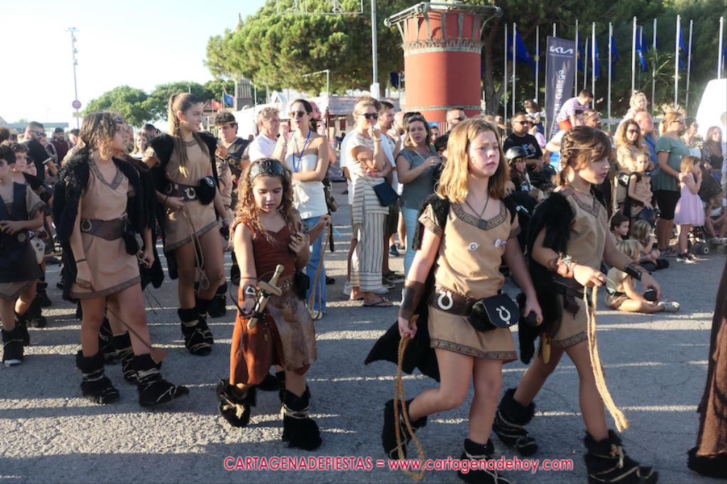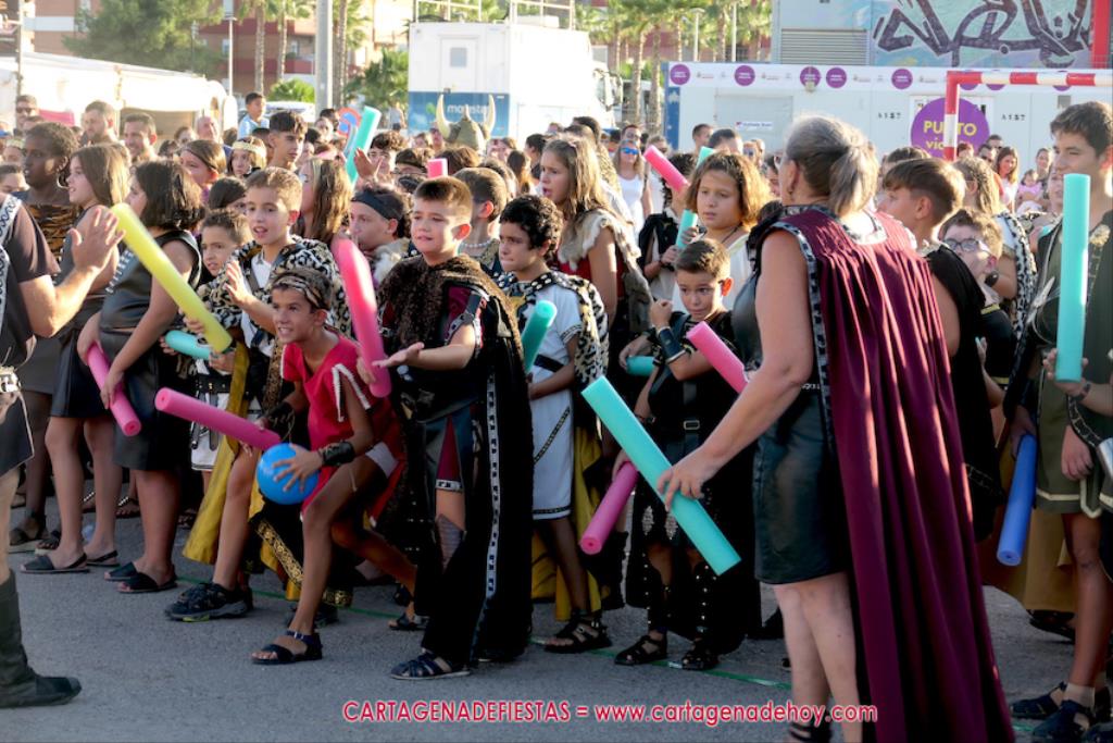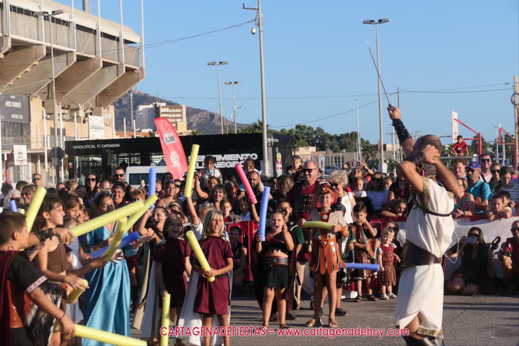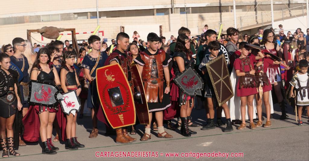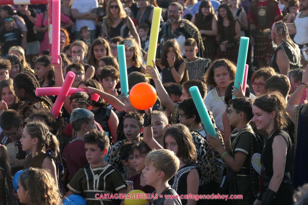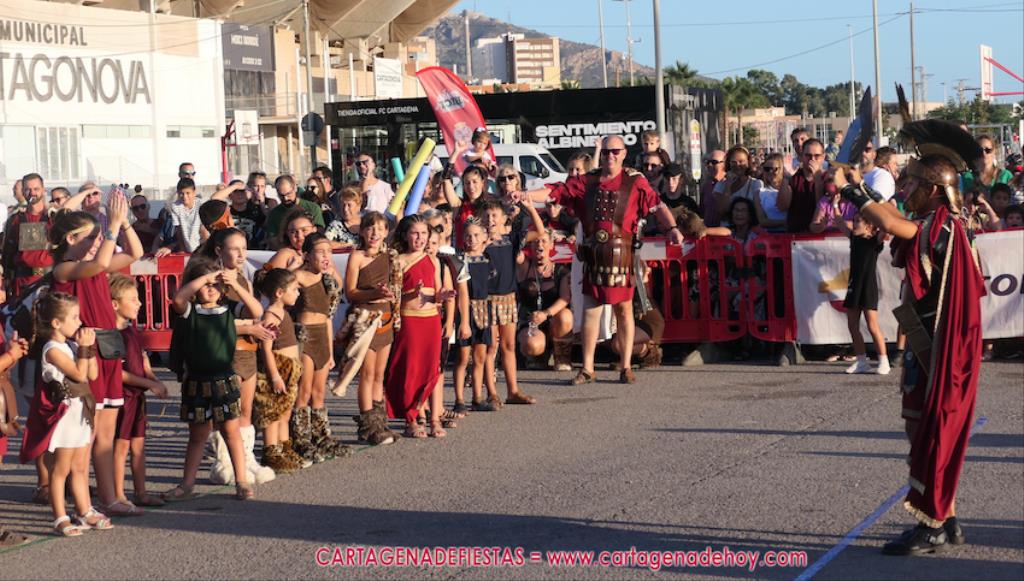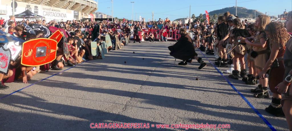 Un servidor conoce Carthagineses y Romanos desde su origen y ha sido testigo de cómo ha evolucionado la gran batalla entre ambos bandos desde que se inició en la escalera de Carlos III de la Muralla del Mar, para después pasar a la entonces explanada de tierra que estaba enfrente, donde el público rodeada en pie a los combatientes. Pues bien, ayer, la batalla infantil me recordó mucho aquellos momentos, pero cambiando a los guerreros y legionarios mayorcitos por zagalicos. En esta ocasión el campo de batalla era de asfalto ante la fachada del campamento, lo que era novedad con respecto a la edición del estreno en 2022. Además, se ha ganado en coordinación y estructura con movimientos claros y marcas en el suelo para que unos y otros mostrasen bien al espectador su rol en el combate.