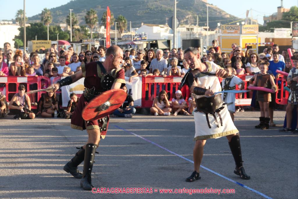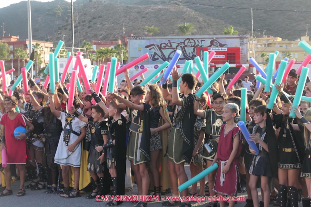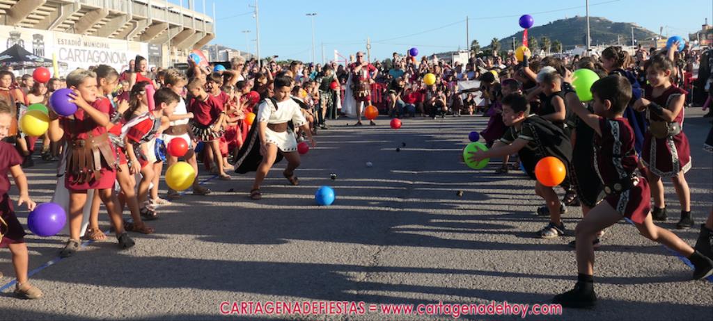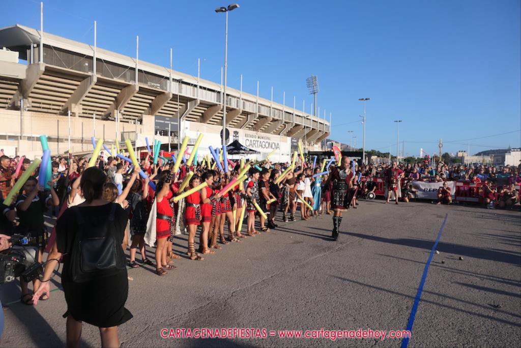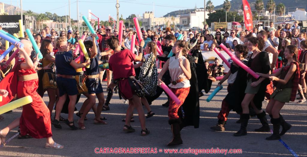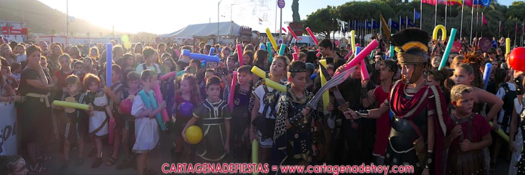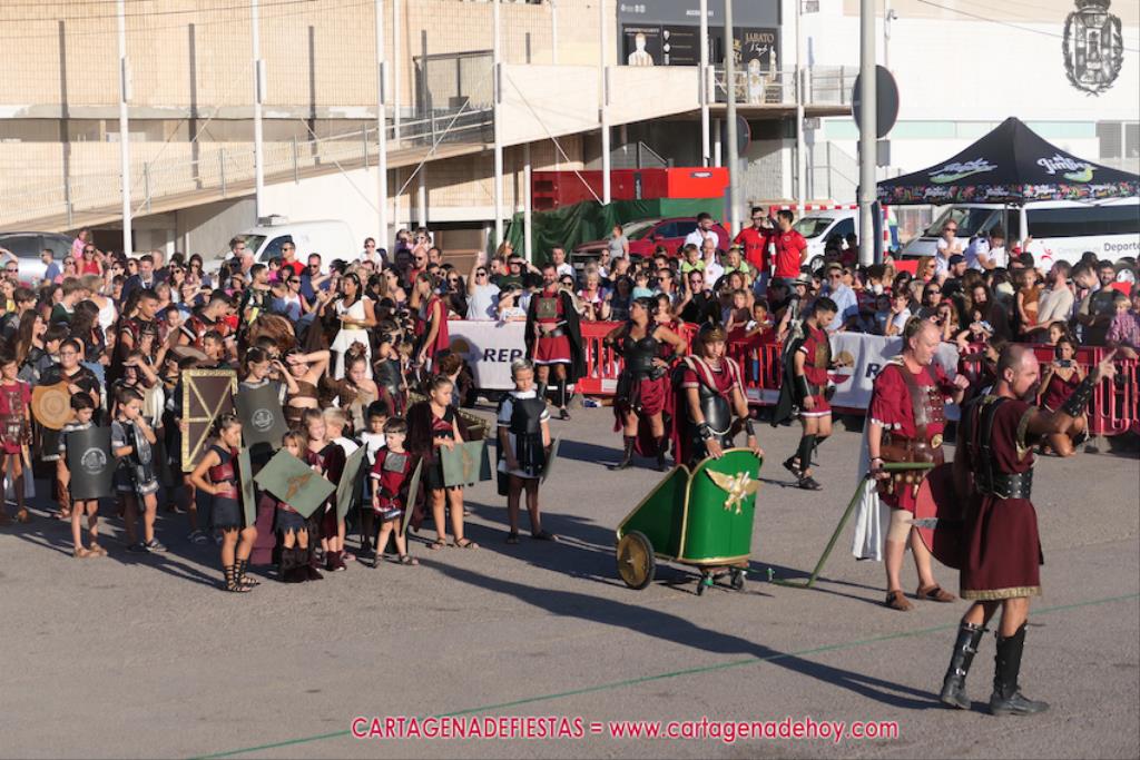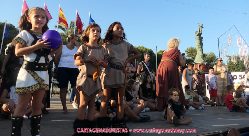 Un servidor conoce Carthagineses y Romanos desde su origen y ha sido testigo de cómo ha evolucionado la gran batalla entre ambos bandos desde que se inició en la escalera de Carlos III de la Muralla del Mar, para después pasar a la entonces explanada de tierra que estaba enfrente, donde el público rodeada en pie a los combatientes. Pues bien, ayer, la batalla infantil me recordó mucho aquellos momentos, pero cambiando a los guerreros y legionarios mayorcitos por zagalicos. En esta ocasión el campo de batalla era de asfalto ante la fachada del campamento, lo que era novedad con respecto a la edición del estreno en 2022. Además, se ha ganado en coordinación y estructura con movimientos claros y marcas en el suelo para que unos y otros mostrasen bien al espectador su rol en el combate.