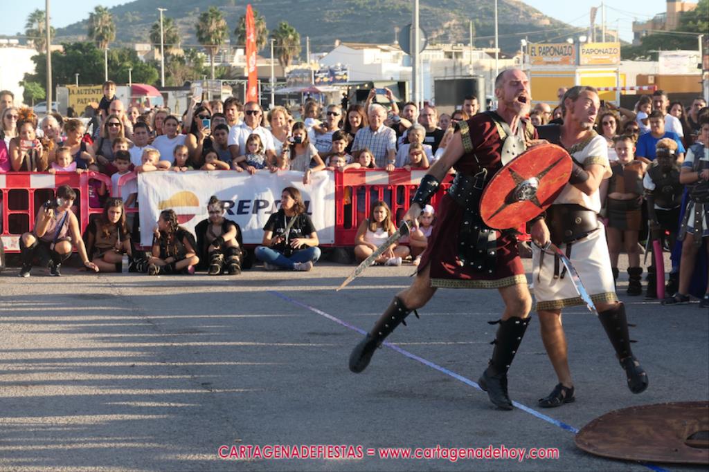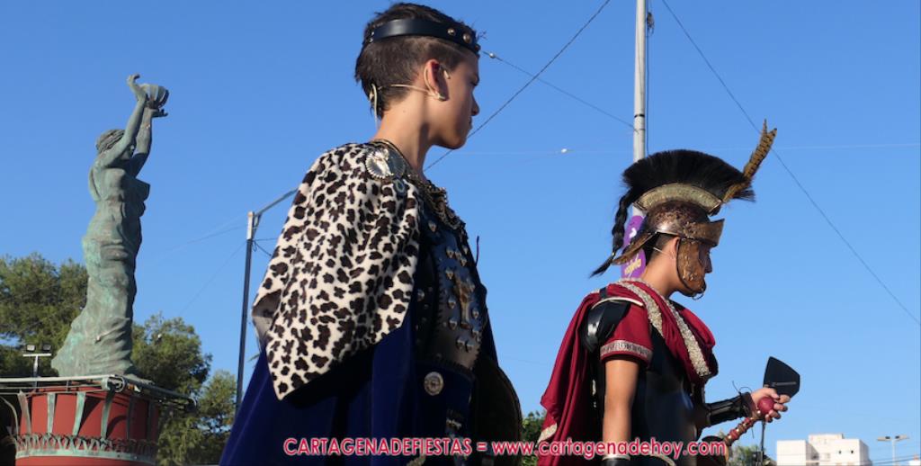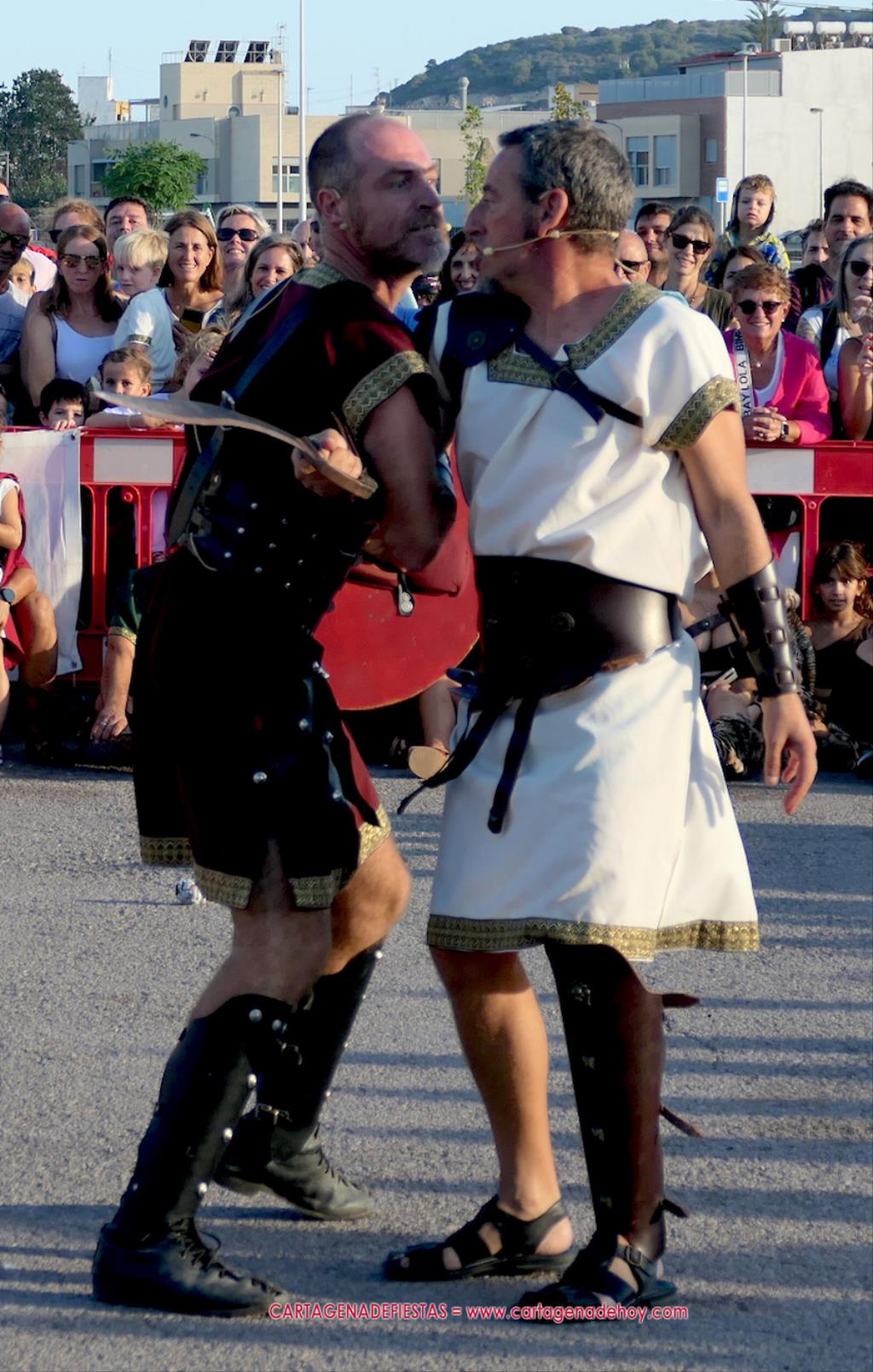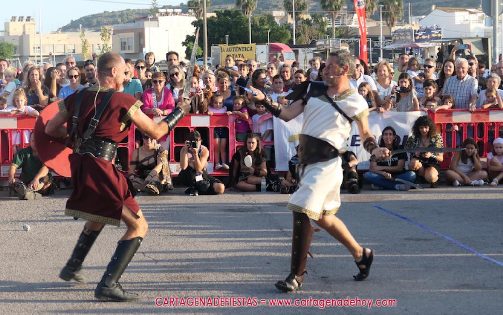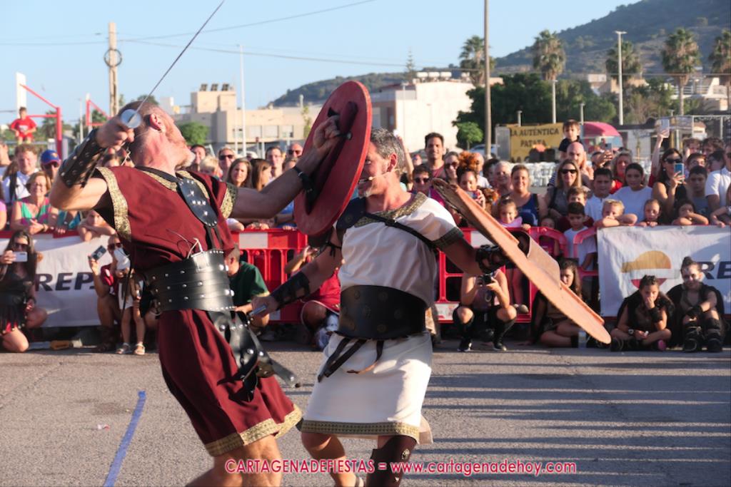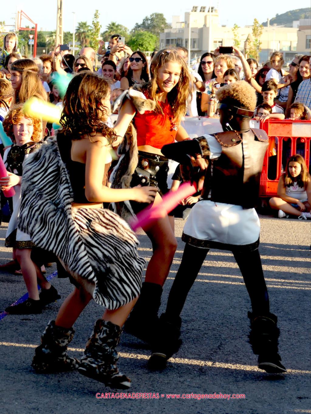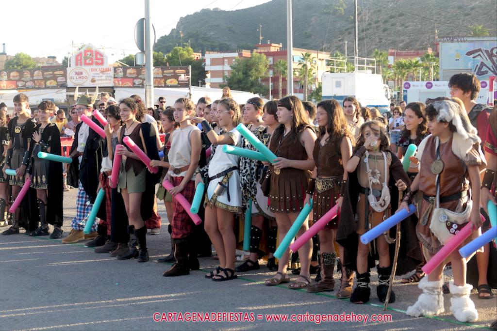 Un servidor conoce Carthagineses y Romanos desde su origen y ha sido testigo de cómo ha evolucionado la gran batalla entre ambos bandos desde que se inició en la escalera de Carlos III de la Muralla del Mar, para después pasar a la entonces explanada de tierra que estaba enfrente, donde el público rodeada en pie a los combatientes. Pues bien, ayer, la batalla infantil me recordó mucho aquellos momentos, pero cambiando a los guerreros y legionarios mayorcitos por zagalicos. En esta ocasión el campo de batalla era de asfalto ante la fachada del campamento, lo que era novedad con respecto a la edición del estreno en 2022. Además, se ha ganado en coordinación y estructura con movimientos claros y marcas en el suelo para que unos y otros mostrasen bien al espectador su rol en el combate.