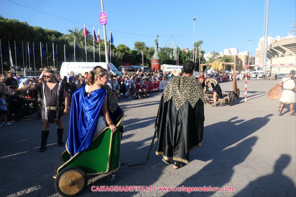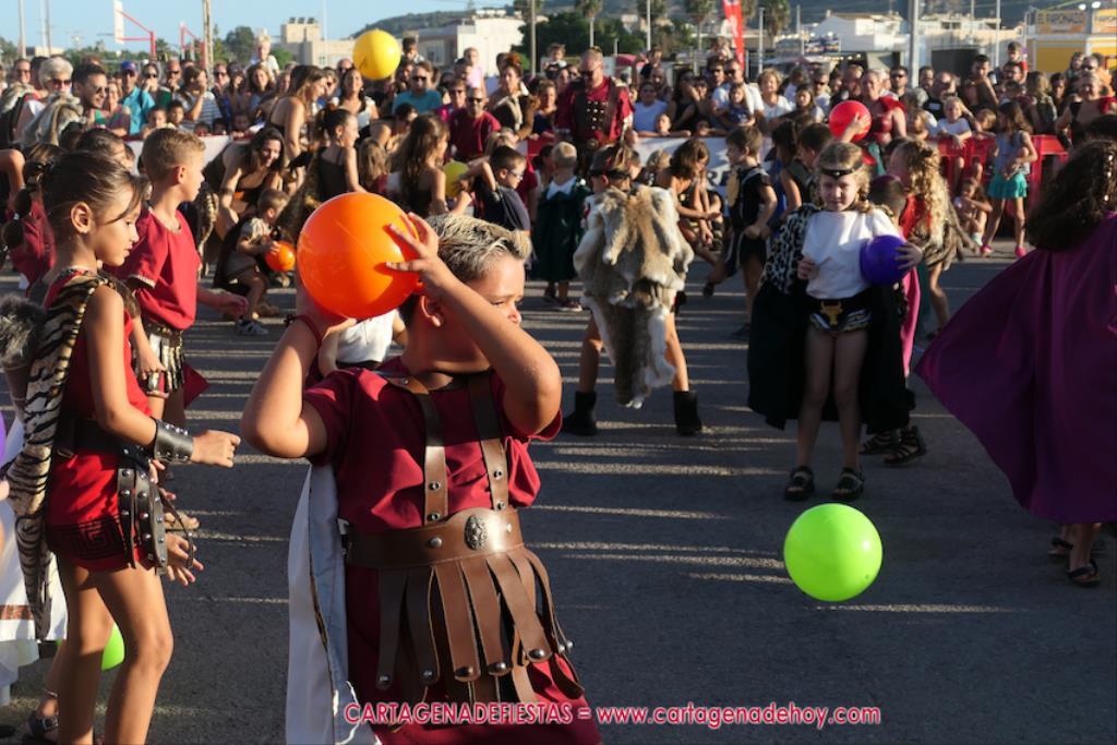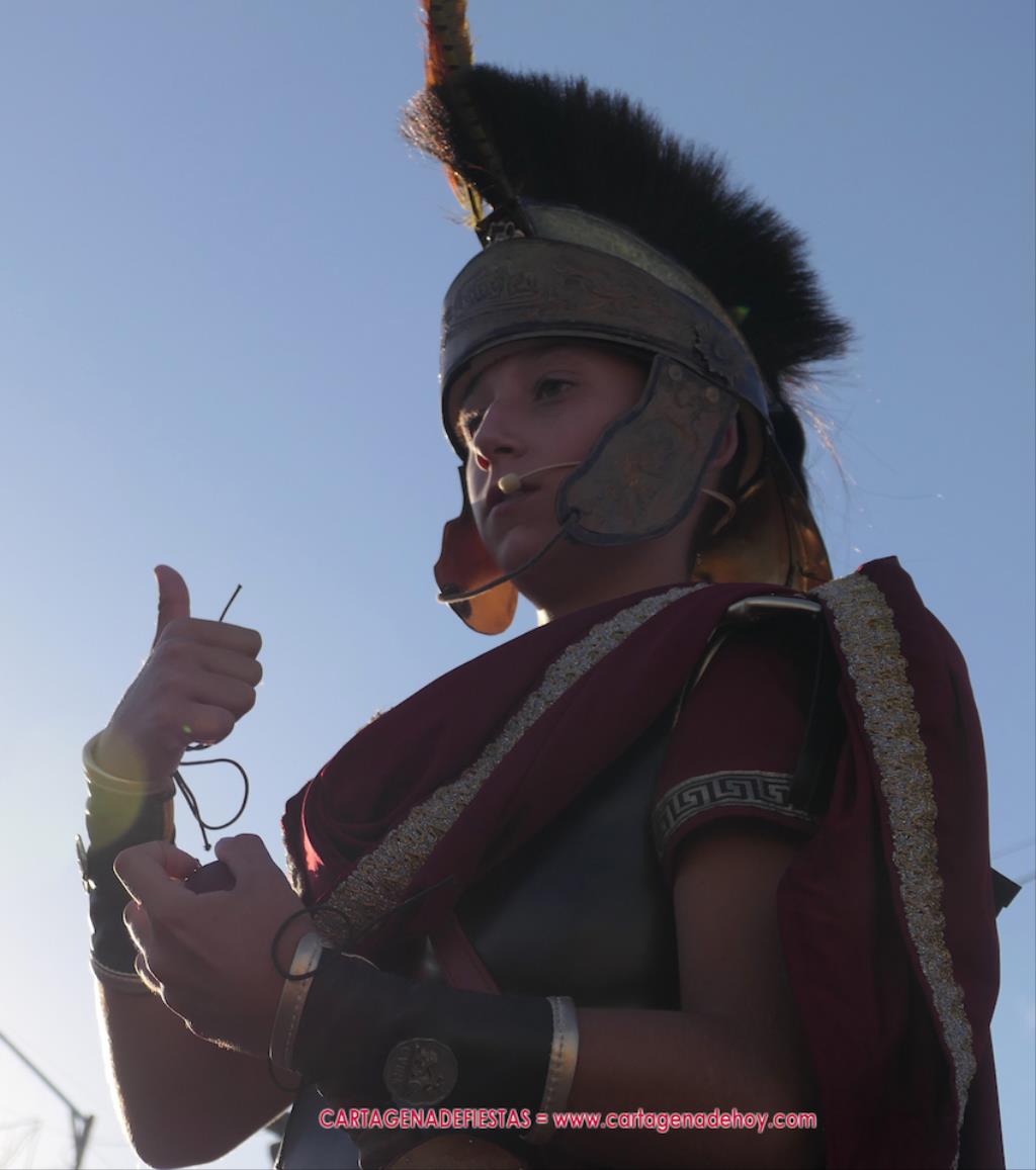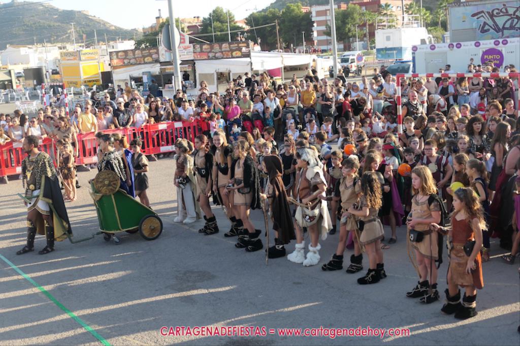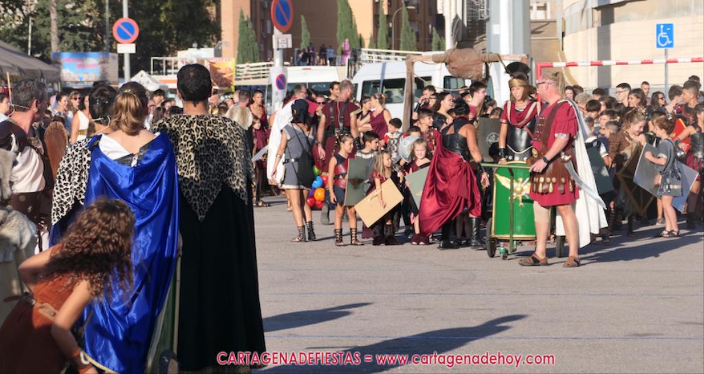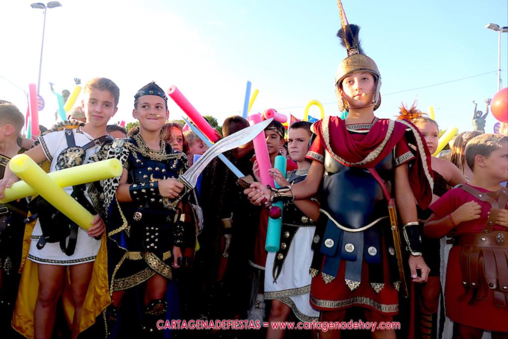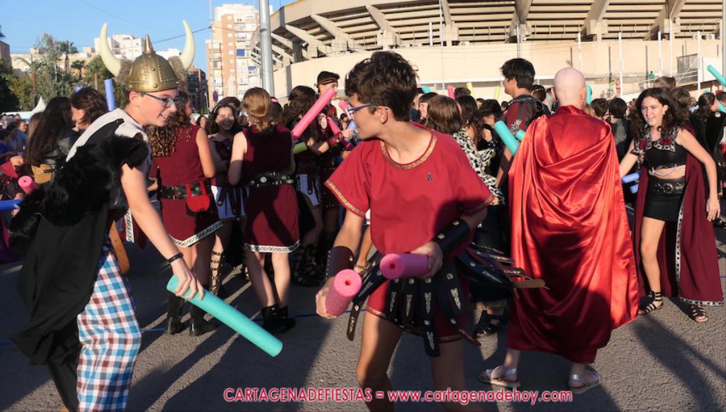 Un servidor conoce Carthagineses y Romanos desde su origen y ha sido testigo de cómo ha evolucionado la gran batalla entre ambos bandos desde que se inició en la escalera de Carlos III de la Muralla del Mar, para después pasar a la entonces explanada de tierra que estaba enfrente, donde el público rodeada en pie a los combatientes. Pues bien, ayer, la batalla infantil me recordó mucho aquellos momentos, pero cambiando a los guerreros y legionarios mayorcitos por zagalicos. En esta ocasión el campo de batalla era de asfalto ante la fachada del campamento, lo que era novedad con respecto a la edición del estreno en 2022. Además, se ha ganado en coordinación y estructura con movimientos claros y marcas en el suelo para que unos y otros mostrasen bien al espectador su rol en el combate.