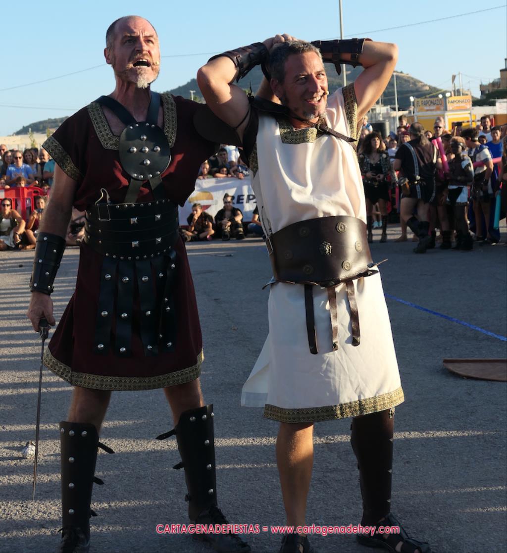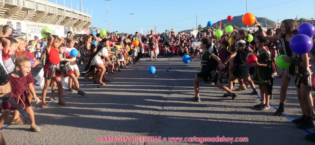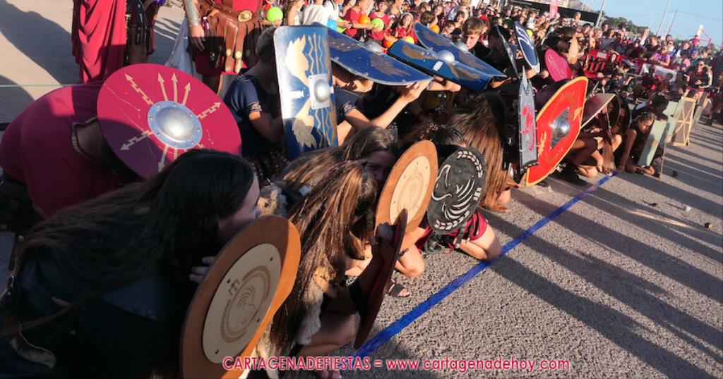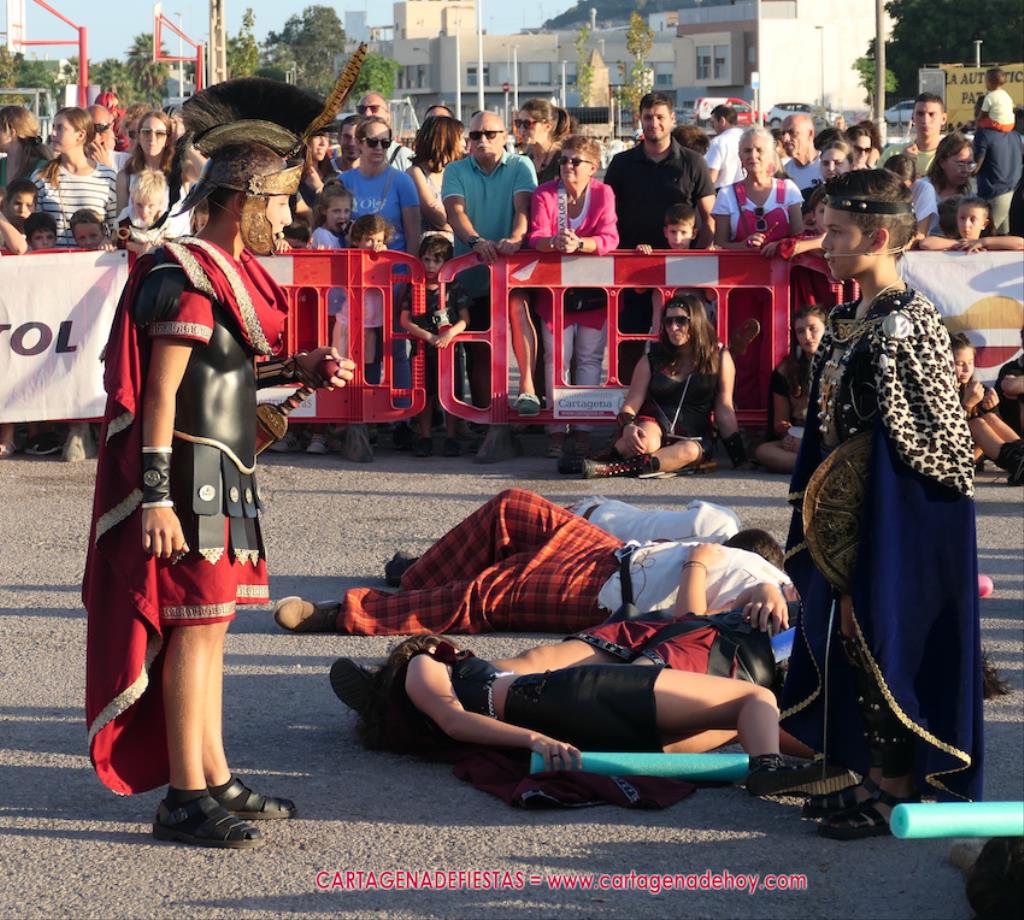 Y llega el desenlace. Cuando acaba quedan 'cadáveres' en el suelo que muestran el horror de la guerra. Entre ellos avanza Giscón para rendir la ciudad ante el general de 'las águilas'. Roma ha vencido. Después, al igual que los mayores, todos juntos se reúnen para aplaudir al público. Se nos pasaba decir que la batalla llegó después de un desfile infantil de Carthagineses y Romanos en el que unos cuatrocientos canteranos de las fiestas cruzó la ciudad hasta llegar al campamento, en este caso, al campo de batalla de la guerra del mañana.