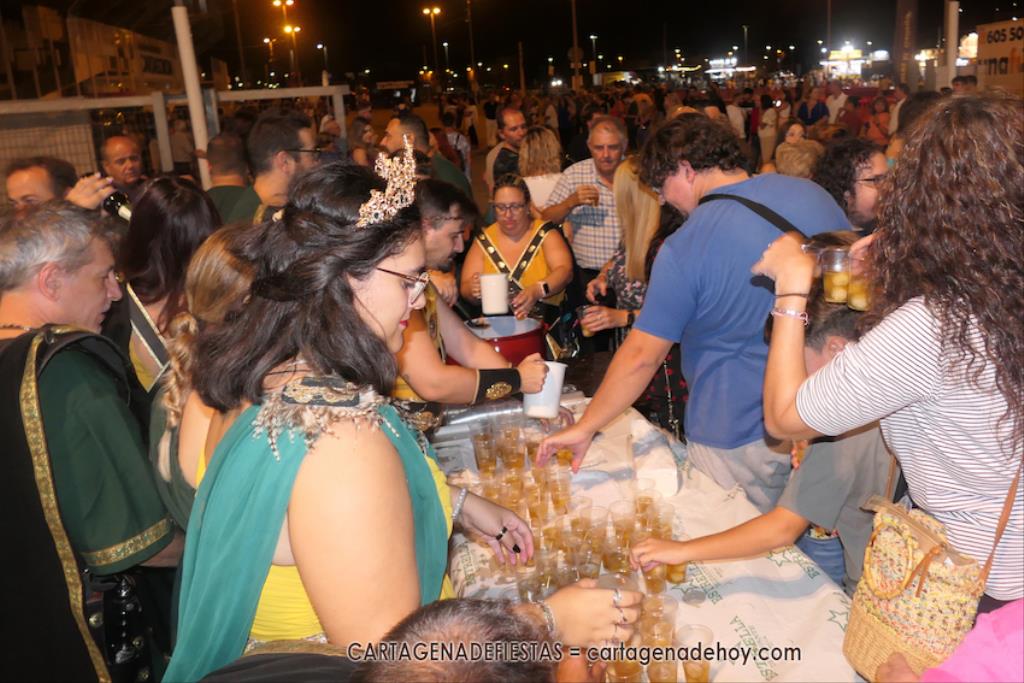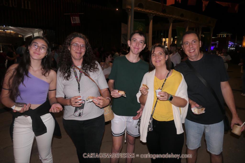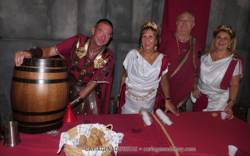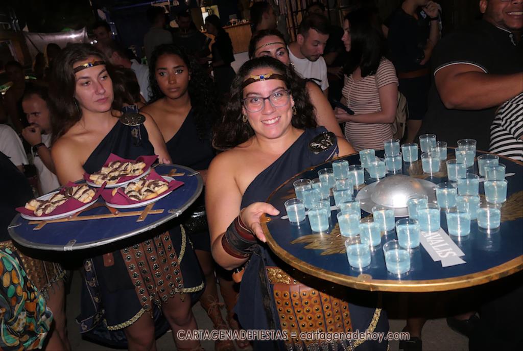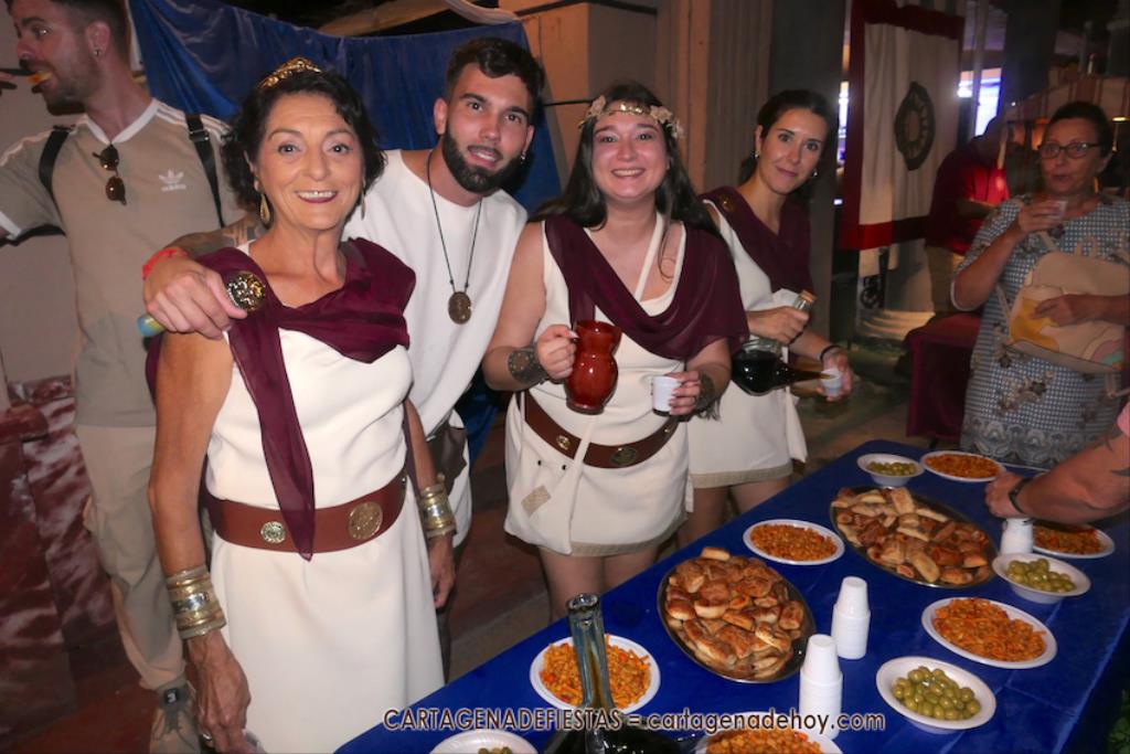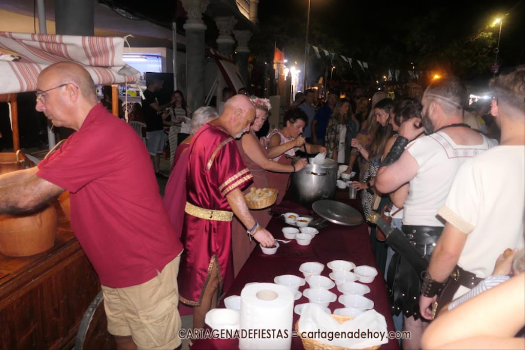 Bullas con musu, caldo con pelotas, pan preñao, aceitunas, saladitos variados, frutos secos, pan con sobrasada, chorizos a la sidra, ‘pichicas’, sopa con ajo, michirones, sangre carthaginesa, tostadas de queso, morcillas, ensalada de beicon, fuá y queso con mermelada, callos, tortilla, vino… Menudo menú para cenar en la calle romana de Carthagineses y Romanos. Fueron casi todos los productos que (casi) todas las legiones obsequiaron a festeros y visitantes, en una edición en la que no ha habido ayuda extra y el gasto ha salido íntegrante del pecunio de cada grupo. La novedad estuvo en la Legio II Navalis. Volvieron a distribuir su pócima ‘Oleaje’, utilizando los escudos como bandejas, pero en el asunto del condumio aparcaron los tradicionales caracoles para repartir ‘marineras’, con lo que este menú de época ya tiene un sabor surgido de esta tierra y su mar. Por cierto, ¿hubo postre? La respuesta es afirmativa y estaba en los profiteroles de la Legion IV.
