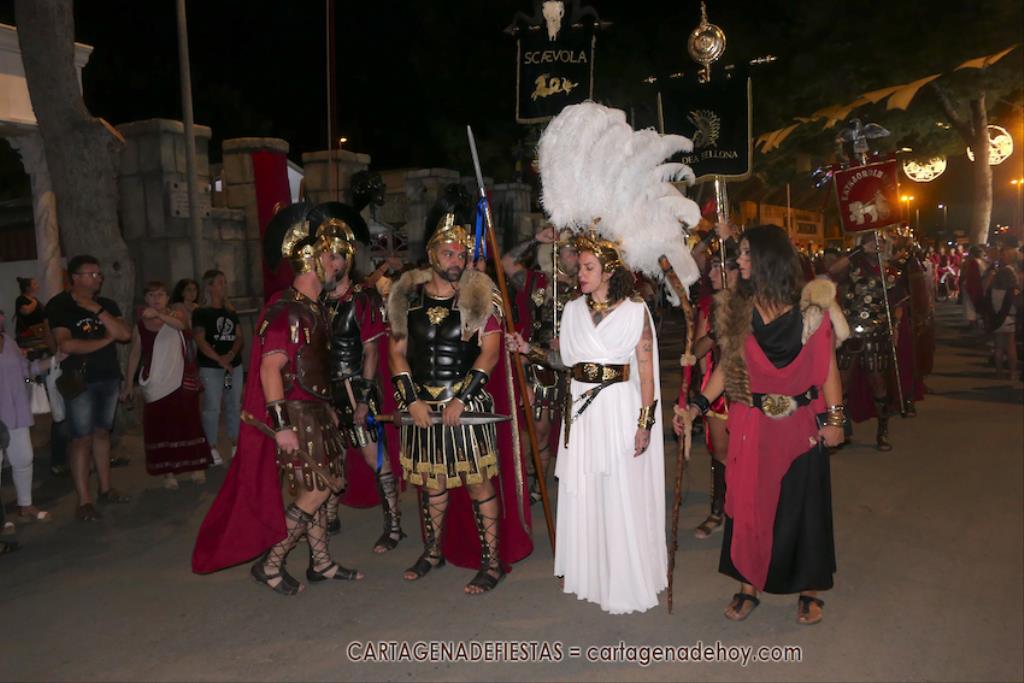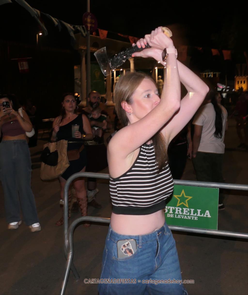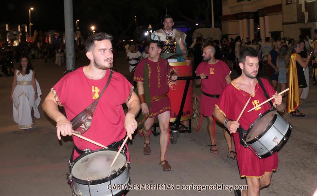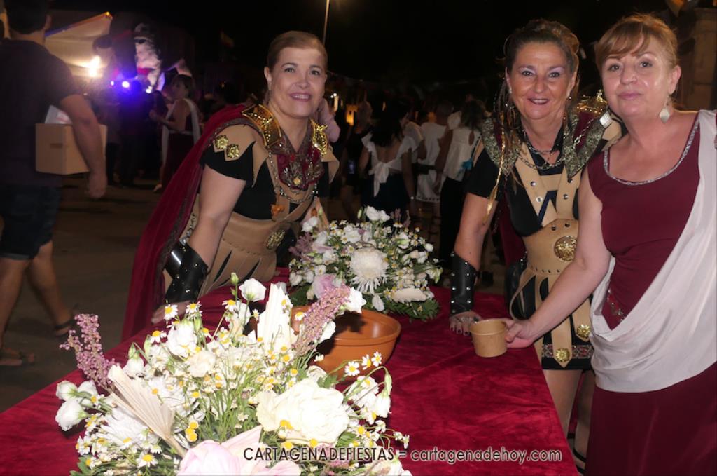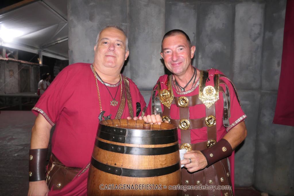 Bullas con musu, caldo con pelotas, pan preñao, aceitunas, saladitos variados, frutos secos, pan con sobrasada, chorizos a la sidra, ‘pichicas’, sopa con ajo, michirones, sangre carthaginesa, tostadas de queso, morcillas, ensalada de beicon, fuá y queso con mermelada, callos, tortilla, vino… Menudo menú para cenar en la calle romana de Carthagineses y Romanos. Fueron casi todos los productos que (casi) todas las legiones obsequiaron a festeros y visitantes, en una edición en la que no ha habido ayuda extra y el gasto ha salido íntegrante del pecunio de cada grupo. La novedad estuvo en la Legio II Navalis. Volvieron a distribuir su pócima ‘Oleaje’, utilizando los escudos como bandejas, pero en el asunto del condumio aparcaron los tradicionales caracoles para repartir ‘marineras’, con lo que este menú de época ya tiene un sabor surgido de esta tierra y su mar. Por cierto, ¿hubo postre? La respuesta es afirmativa y estaba en los profiteroles de la Legion IV.
