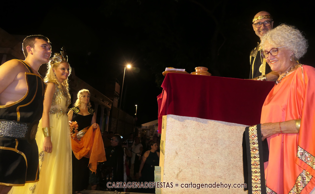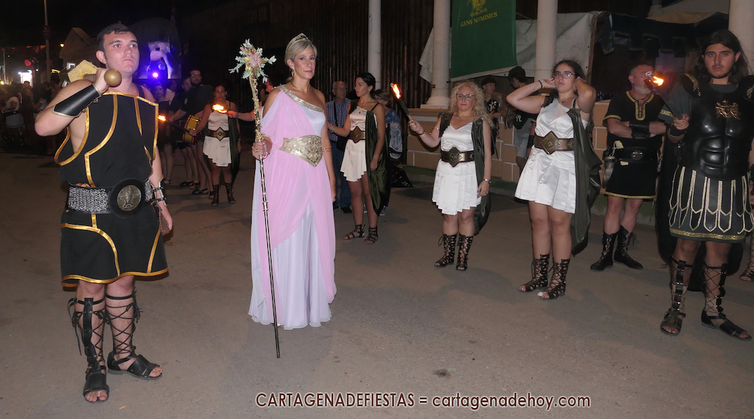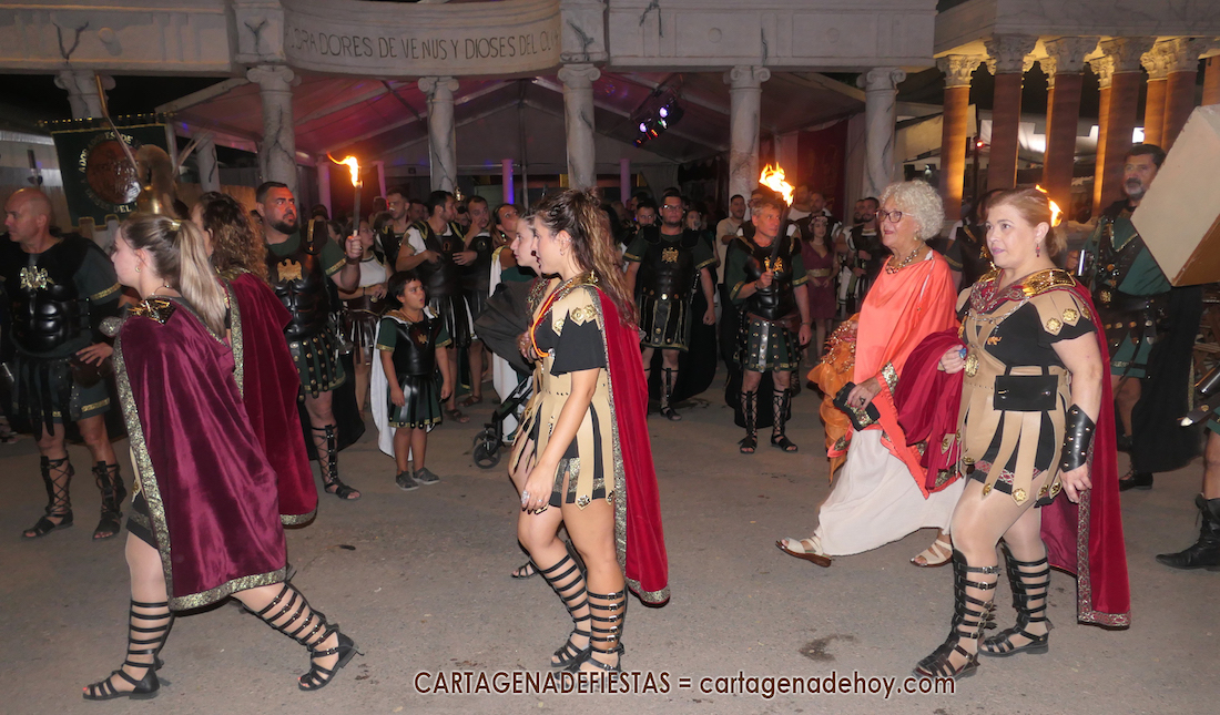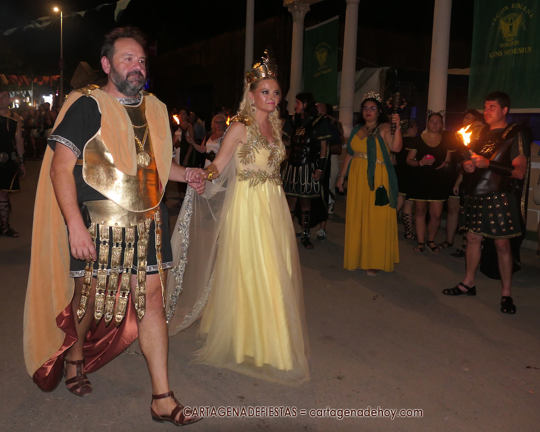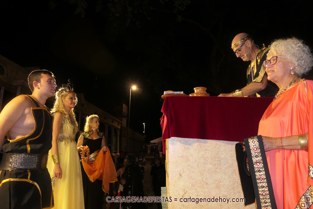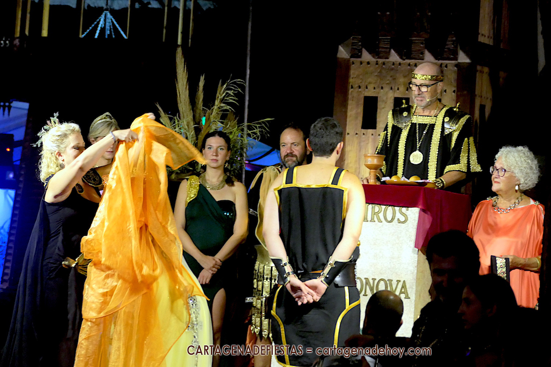 Personajes de las legiones de 'Adoradores de Venus y dioses del Olimpo' y de 'Vigiles de Carthago Nova' son los encargados de representar a ambas divinidades y sobra decir que no se busca al integrante más feo para el papel del dios del fuego, sino que son voluntarios de la legión los que acepta representarlo. La boda con Venus se ha convertido cada edición en un acontecimiento que moviliza a tres grupos romanos, los dos mentados antes más Triunviros de Cartagonova, pues son los pioneros de las bodas en esta calle y su 'flamine dial' es el que lleva a cabo y dirige el acto matrimonial ante el altar, al que ambos han llegado tras cruzar un pasillo formado por compañeros de las diferentes legiones. Después, como cualquier boda que se precie, hay tarta y fiesta, que este año ha tocado celebrar en el recinto de 'Vigiles'.