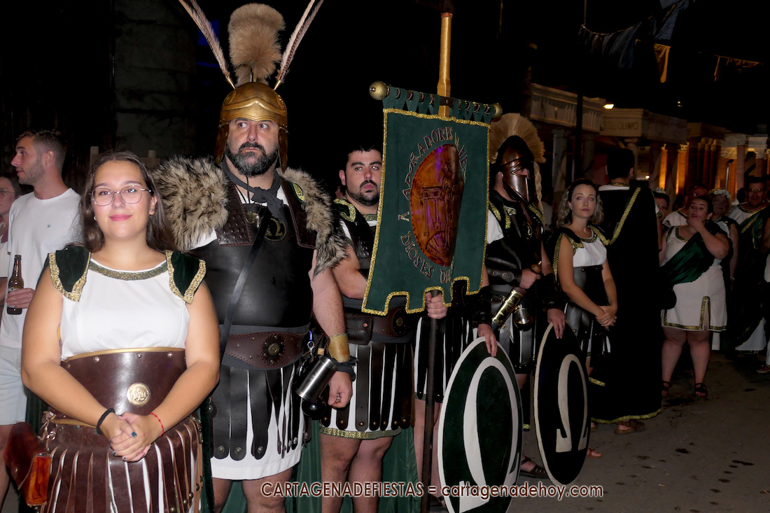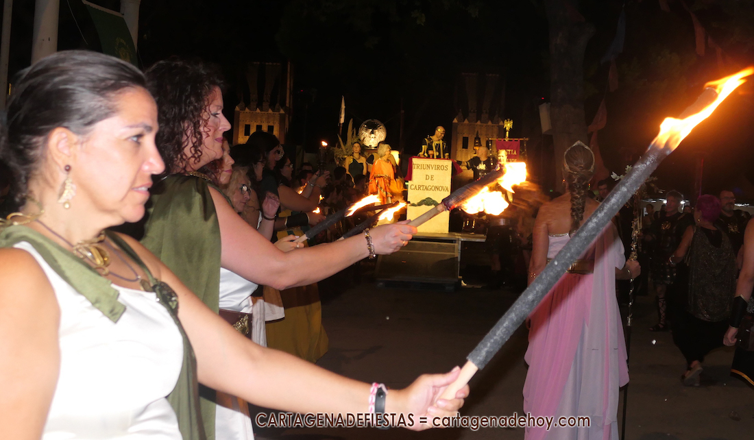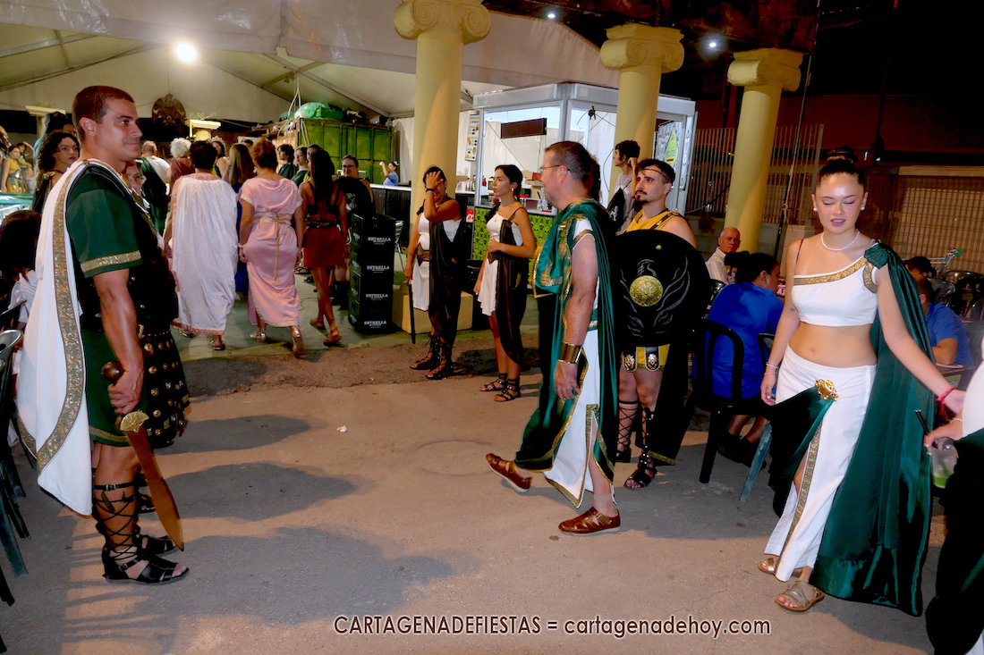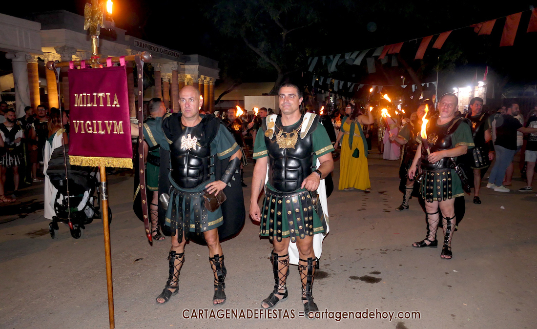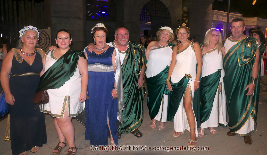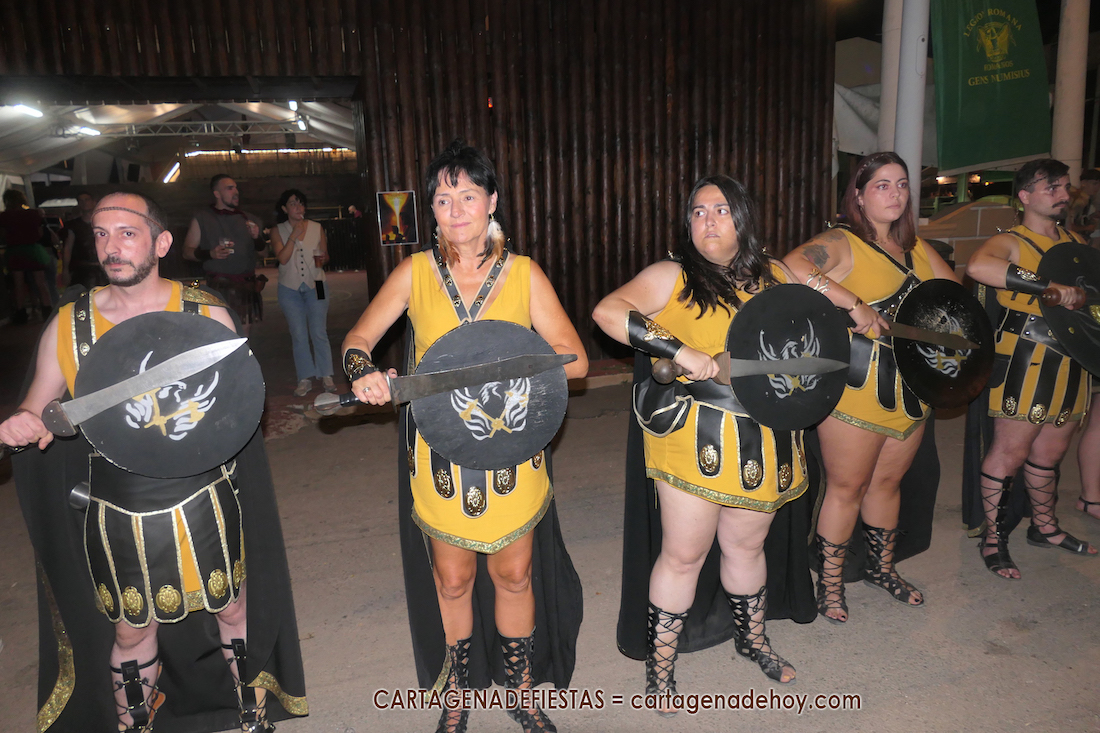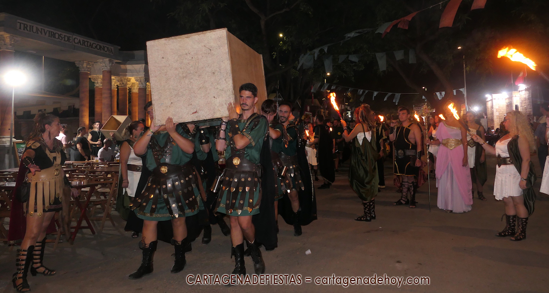 Personajes de las legiones de 'Adoradores de Venus y dioses del Olimpo' y de 'Vigiles de Carthago Nova' son los encargados de representar a ambas divinidades y sobra decir que no se busca al integrante más feo para el papel del dios del fuego, sino que son voluntarios de la legión los que acepta representarlo. La boda con Venus se ha convertido cada edición en un acontecimiento que moviliza a tres grupos romanos, los dos mentados antes más Triunviros de Cartagonova, pues son los pioneros de las bodas en esta calle y su 'flamine dial' es el que lleva a cabo y dirige el acto matrimonial ante el altar, al que ambos han llegado tras cruzar un pasillo formado por compañeros de las diferentes legiones. Después, como cualquier boda que se precie, hay tarta y fiesta, que este año ha tocado celebrar en el recinto de 'Vigiles'.