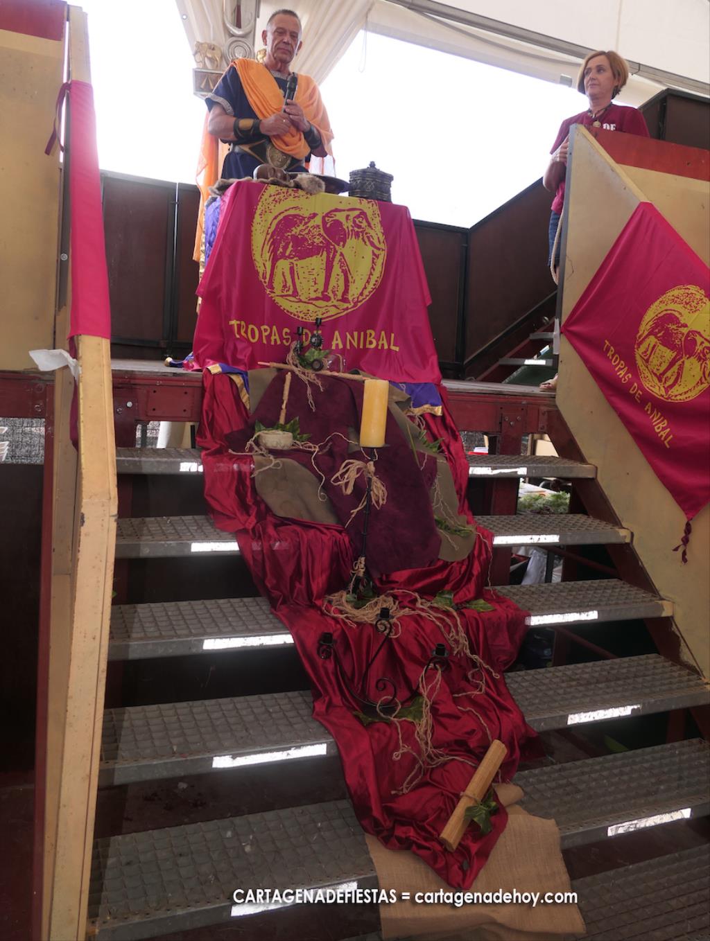 Más veteranos en estas tareas son los de Tropas de Aníbal, que cuenta con Antonio Cano, el gran sacerdote del Consejo Carthaginés, como 'bautizador oficial'. Los pequeños reciben el agua purificada y se unen sus manos con un cordón sagrado en señal de su unión al linaje púnico. Estas bienvenidas están abiertas a otras otras, como vimos el pasado domingo con 3 pequeños de Caballeros e Isis de Carthago y 4 de Honderos Baleares, quienes recibieron sus diploma acreditativos. El acto culminó con los nuevos de Tropas de Aníbal, sumándose las princesas de la tropa este año, Nedea y Blanca, al acto que se desarrolla en una posición elevada del recinto.