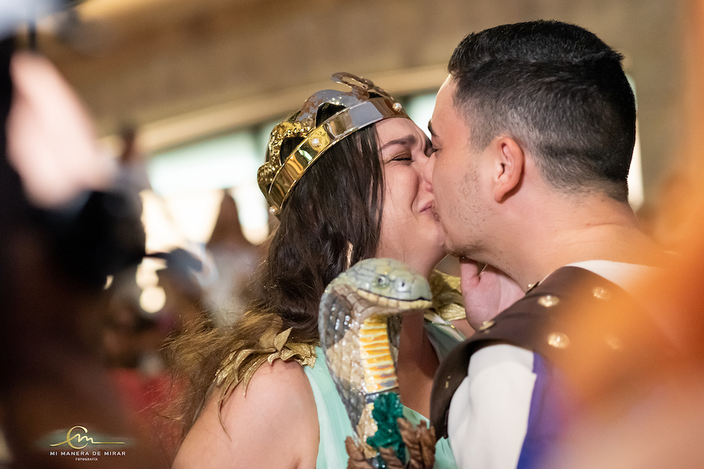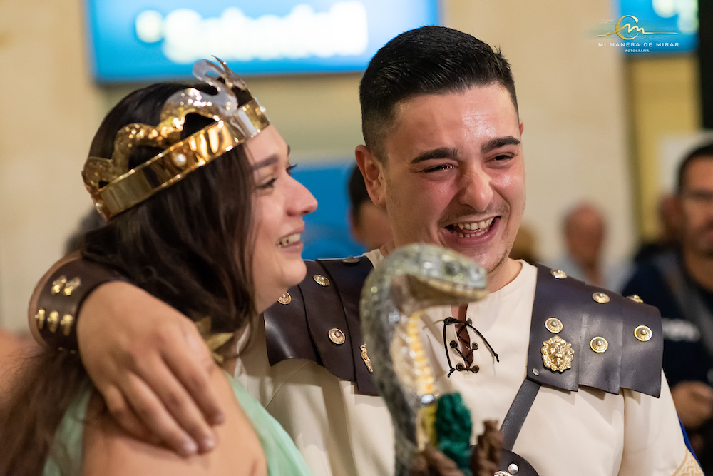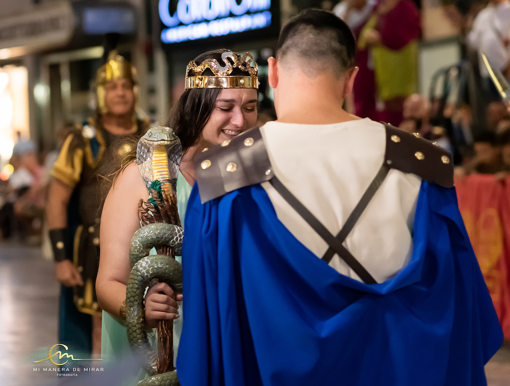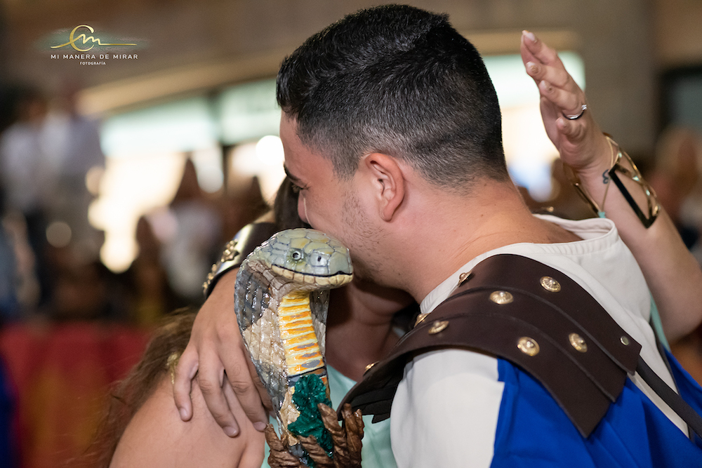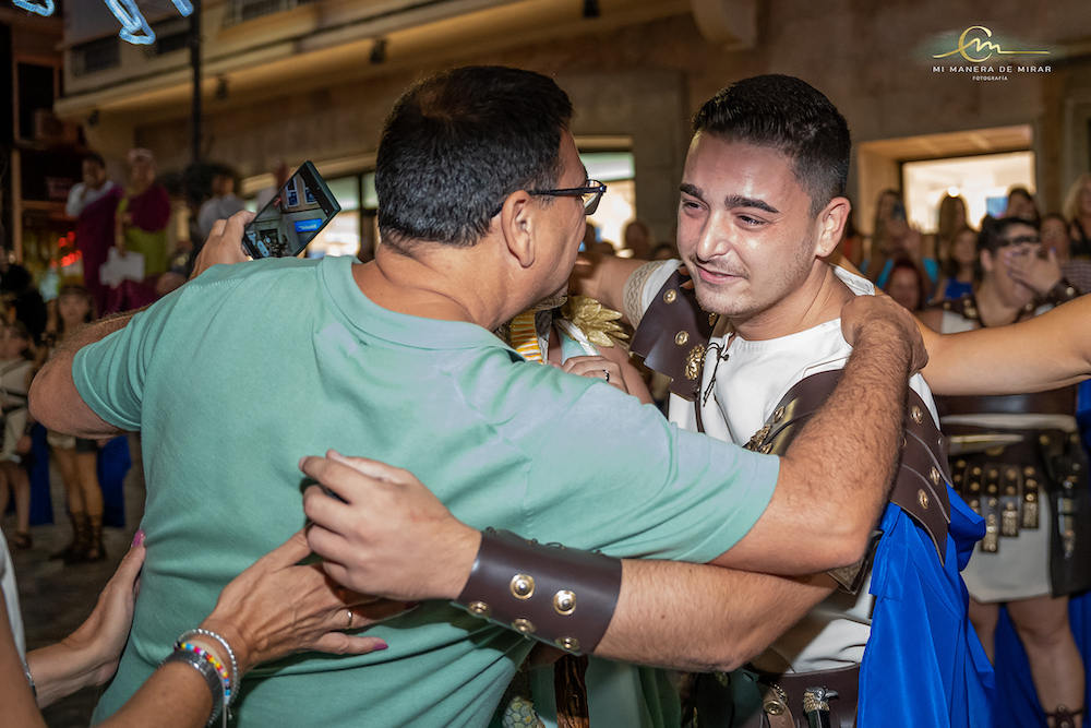 Desfile general de Carthagineses y Romanos. Es la legión de Ara Pacis la que transita por la Puerta de Murcia, en concreto, ante la tribuna. En ese momento, un alto y una petición. Sergio se dirige a María José y la pide en matrimonio. Respuesta afirmativa, besos, emoción y felicitaciones de allegados que están en el entorno. '¡Habemus boda en Carthagono Nova!'.