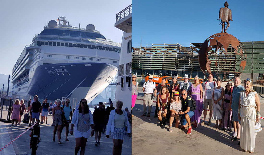 Desembarco de uno de los cruceros y los festeros posando con turistas junto al monumento dedicado a Juan Sebastián Elcano