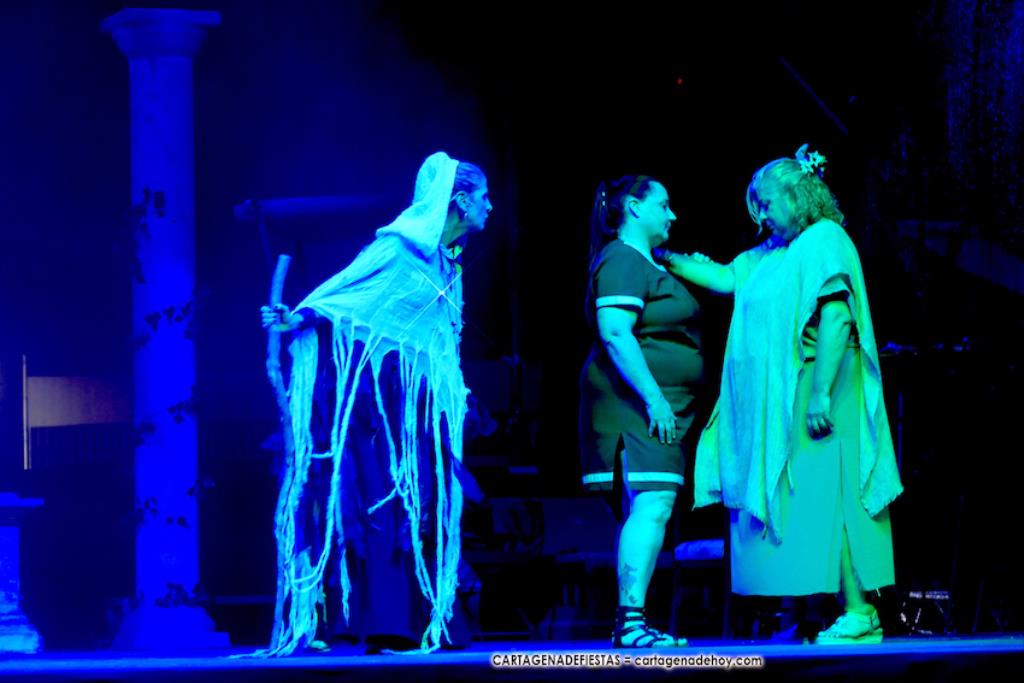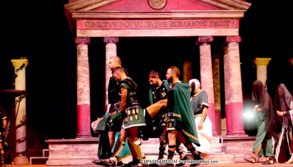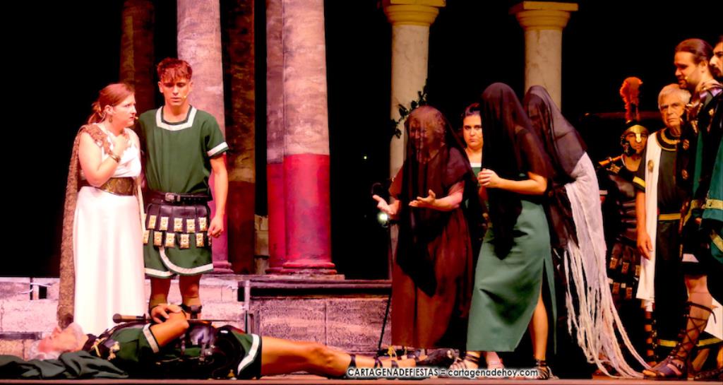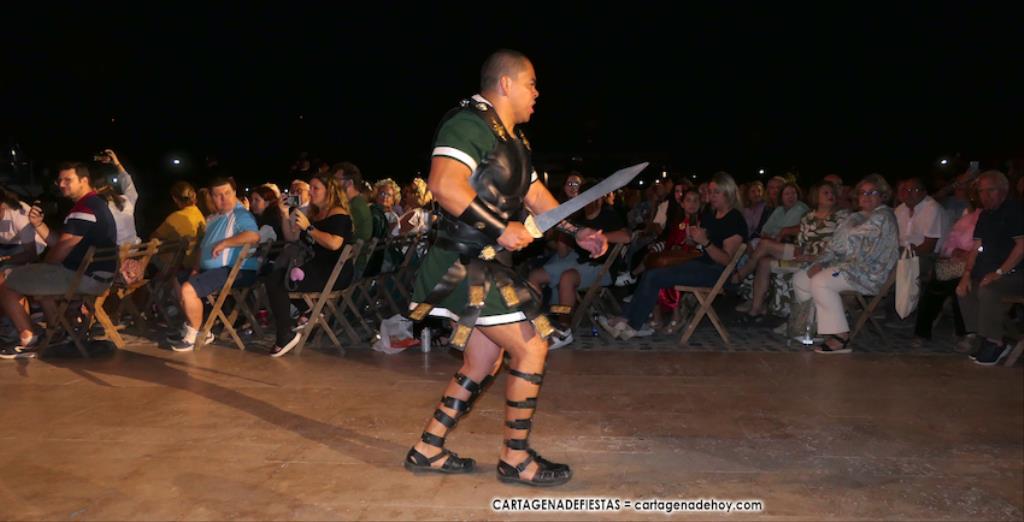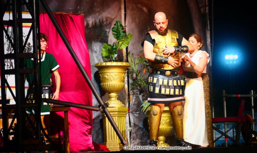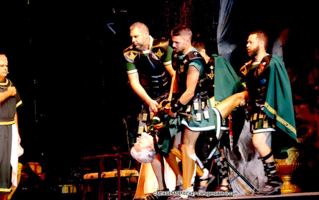 La IA ya está en las históricas fiestas de Cartagena. Su primer acto de presencia (s.e.u.o.), lo ha hecho a través de la representación de la 'Destrucción de Sagunto' con la rockera canción que acompañó al saludo de los actores tras acabar la puesta en escena, que en esta ocasión tuvo, por primera vez también, a Juanjo Núñez con la 'batuta' de dirección, además de interpretar a Valerio (antes Teucro), que este año fue el último legionario en morir.