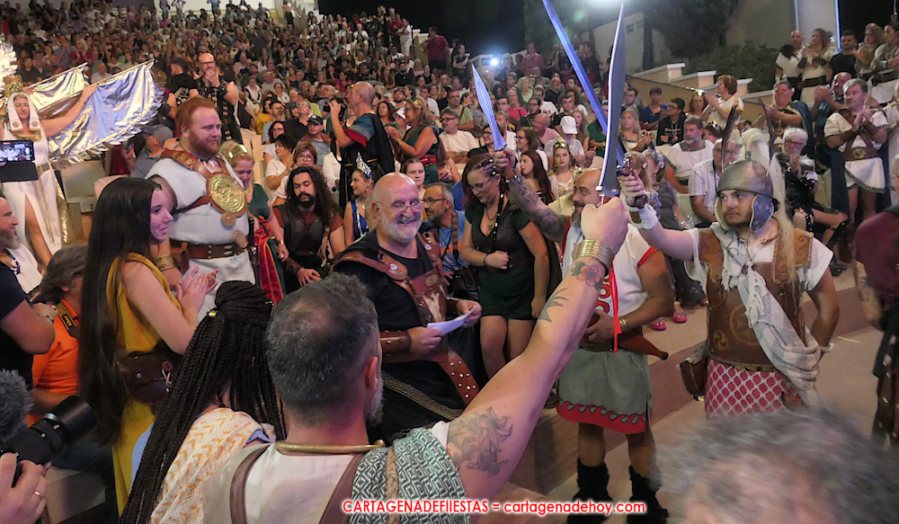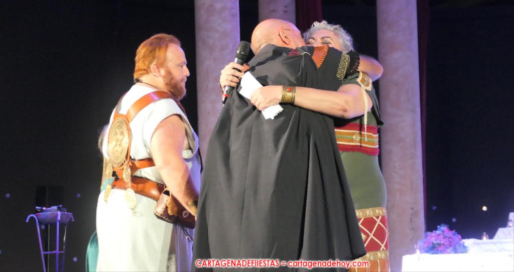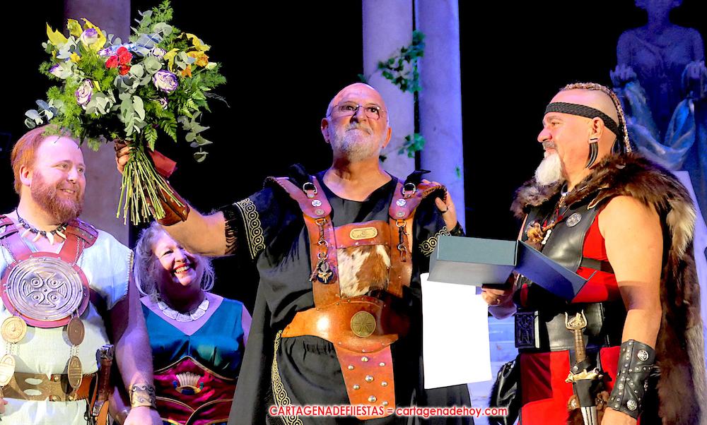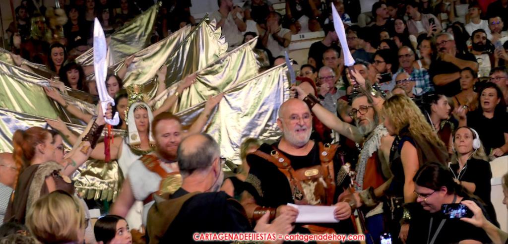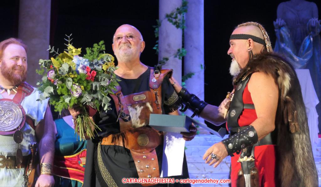 ‘Chipas’ ha expresado que en sus 35 años de andadura festera ha creado multitud de amigos “que han acabado siendo familia” y que cada paseo que ha dado con el dios Bes o cada golpe de tambor “han refrendado mi cariño hacia estas fiestas. La pasión como festero es uno de los pilares de mi vida y pienso que ser festero va más allá, es llevar un profundo sentimiento y un compromiso con nuestra tierra, es un acto de amor hacia Cartagena”, ha expresado cuando le dejaba la emoción. Acompañado por su esposa, Encarnita, e hijo. A la primera le mostró tanto amor como gratitud y al referirse a su descendiente lo hizo a través de la tropa de Caballería Lusitana, quienes hace una década “se dirigían a nosotros como ‘venerables’ y que están construyendo su propio camino”. Sus dedicatorias también tuvieron como destinatarios a los recordados María Dolores Reinaldos y Benito García, además de las nuevas generaciones festeras.
