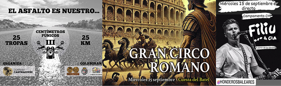A las once de esta mañana arrancan las motos de 'Centímetros púnicos' en un día que tendrá el retorno del circo romano como gran acontecimiento. Después, gran festín de viandas y brebajes en el campamento en una noche en la que, entre otros, actúan 'Filiú' y 'Los intocables'. Además, se inaugura el Mercado de Época y hay otra visita de ancianos. También es nuevo el 'Cónclave de Iberia' que tendrá lugar en la medianoche.