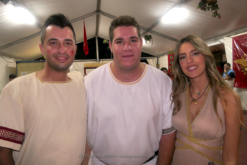 La actividad en el recinto de la gran aldea ya ha celebrado la cena del nombramiento de Tomás Martínez Pagán como 'Legionario de honor', las animadas olimpiadas entre los miembros de la legión y el ya popular bingo erótico. En la foto inferior, con un recién llegado en el centro, se observa a los personajes de Marco Juno Solano, que encarna Eulogio Jiménez Fuente, y la diosa Ceres, que representea Sonia Agüera Acosta. Este año ha quedado vacante el de Lucio Escipión, hermano de Publio, principal personaje romano de las fiestas y que es de donde toma su nombre este grupo fundado en el 'Annus I', en 1990.
