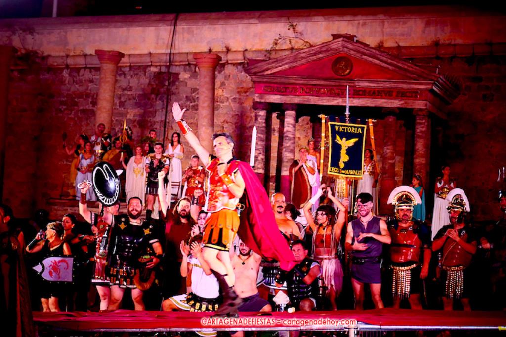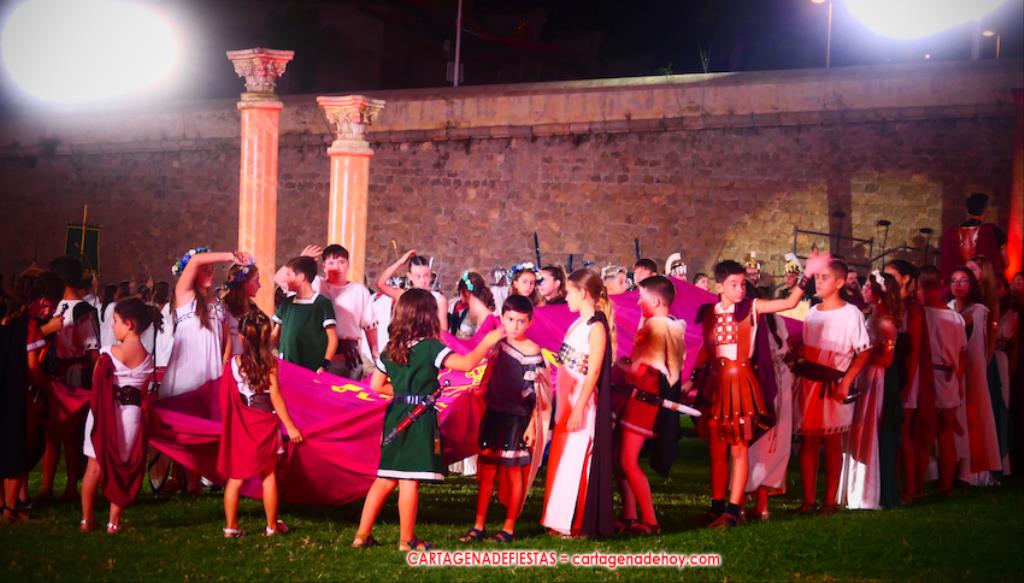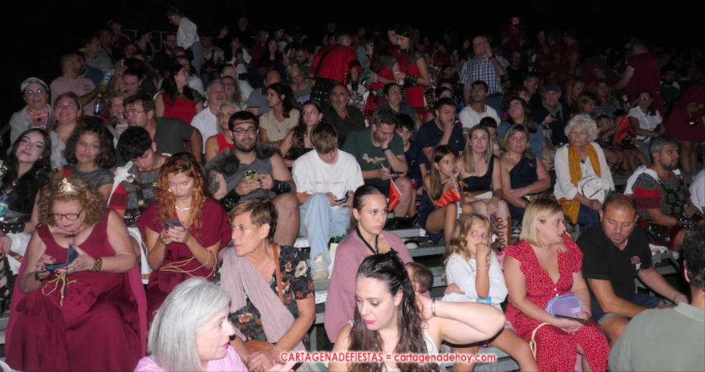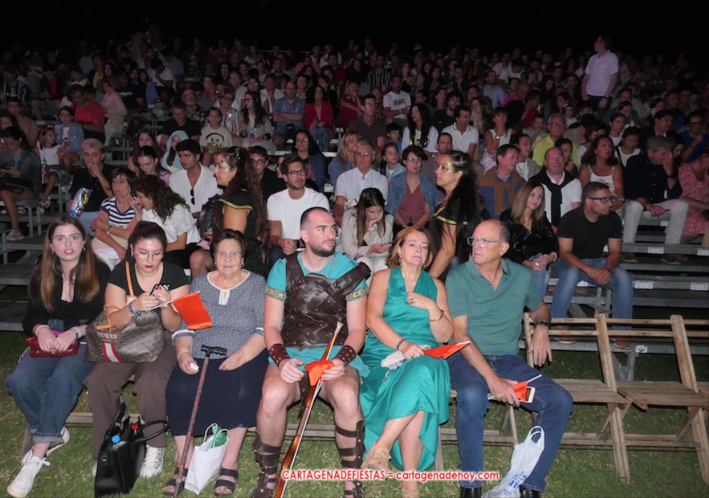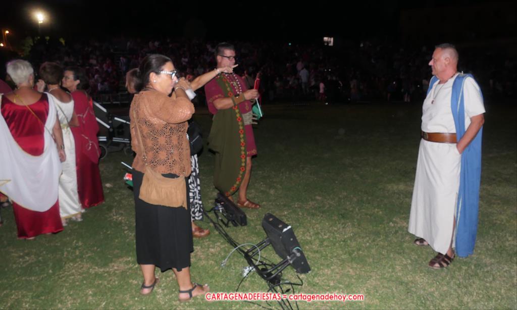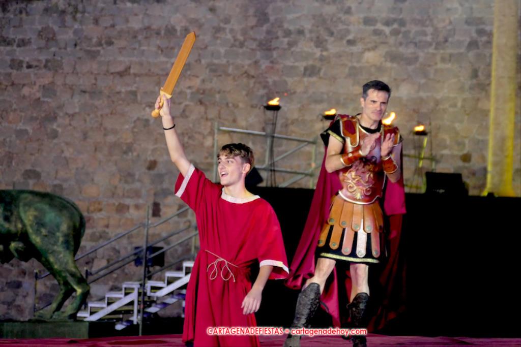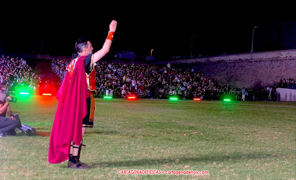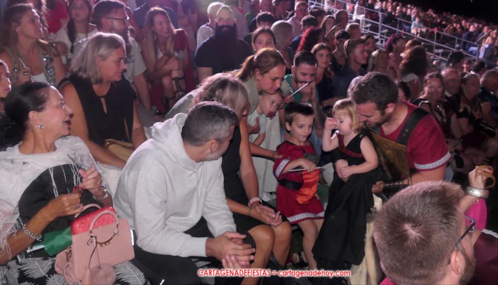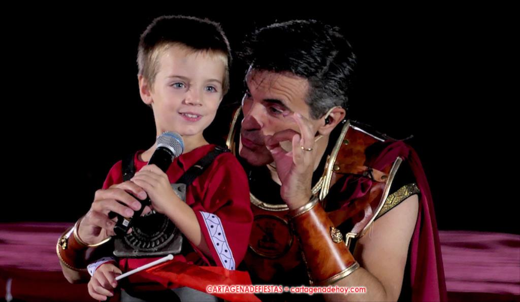 Todavía queda algo de la crónica, el presentador. Me gustó cómo llevó la presentación Luis Larrodera. Se nota que tiene recursos para salir de cualquier situación (cuando se perdió una bandera) y para arrancar sonrisas con chascarrillos o un chiste, como el que lanzó: ¿Por qué los romanos no llevan tirantes? Porque son más de centuriones. Autobautizado como 'Achus Pijus Magnífico', auspició una gran 'ola' con retorno y utilizó una improvisada entrevista a Escipión y Emilia Paula para divulgar tesoros de nuestra gastronomía: michirones, caldero y asiático. Luego, es de suponer que en un apartado pactado, se dirigió a 'la gobernardora' (la alcaldesa) y al 'emperador' (presidente del gobierno regional), diciéndole a López Miras si había venido "bien o en tren", lo que arrancó muchos aplausos por el olvido ferroviario que tiene esta tierra. "A orillas del Mediterráneo hay un pueblo que no quiere ser más que los demás, pero tampoco menos", expresó. Larrodena tenía libertad para interactuar con el público y en una de sus iniciativas aportó al espectáculo el momento de mayor ternura y simpatía. Sacó de las primeras filas al pequeño festero Nacho, de Rehenes de Carthago, quien, con cinco años de edad, cautivó a todos.
