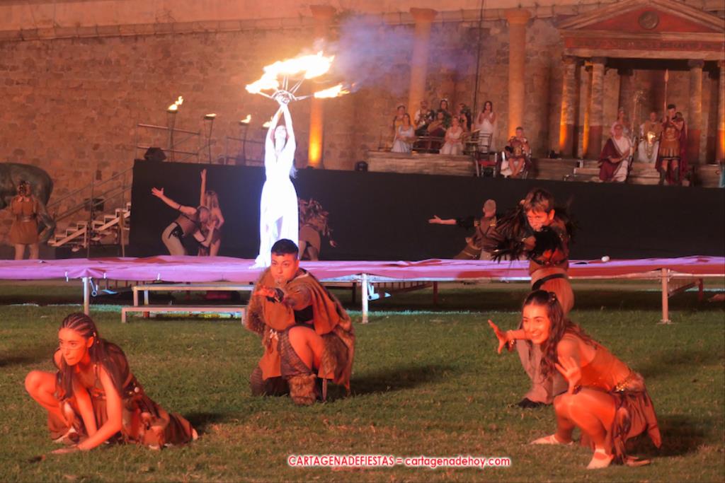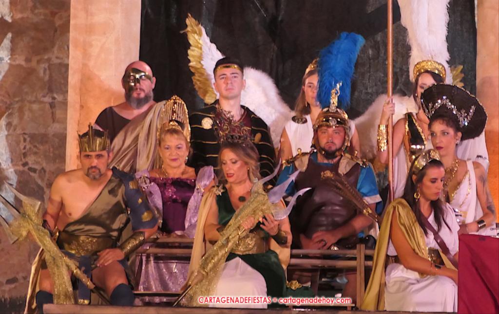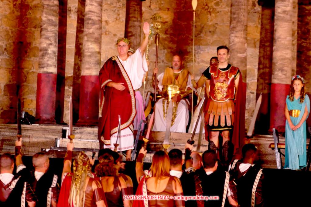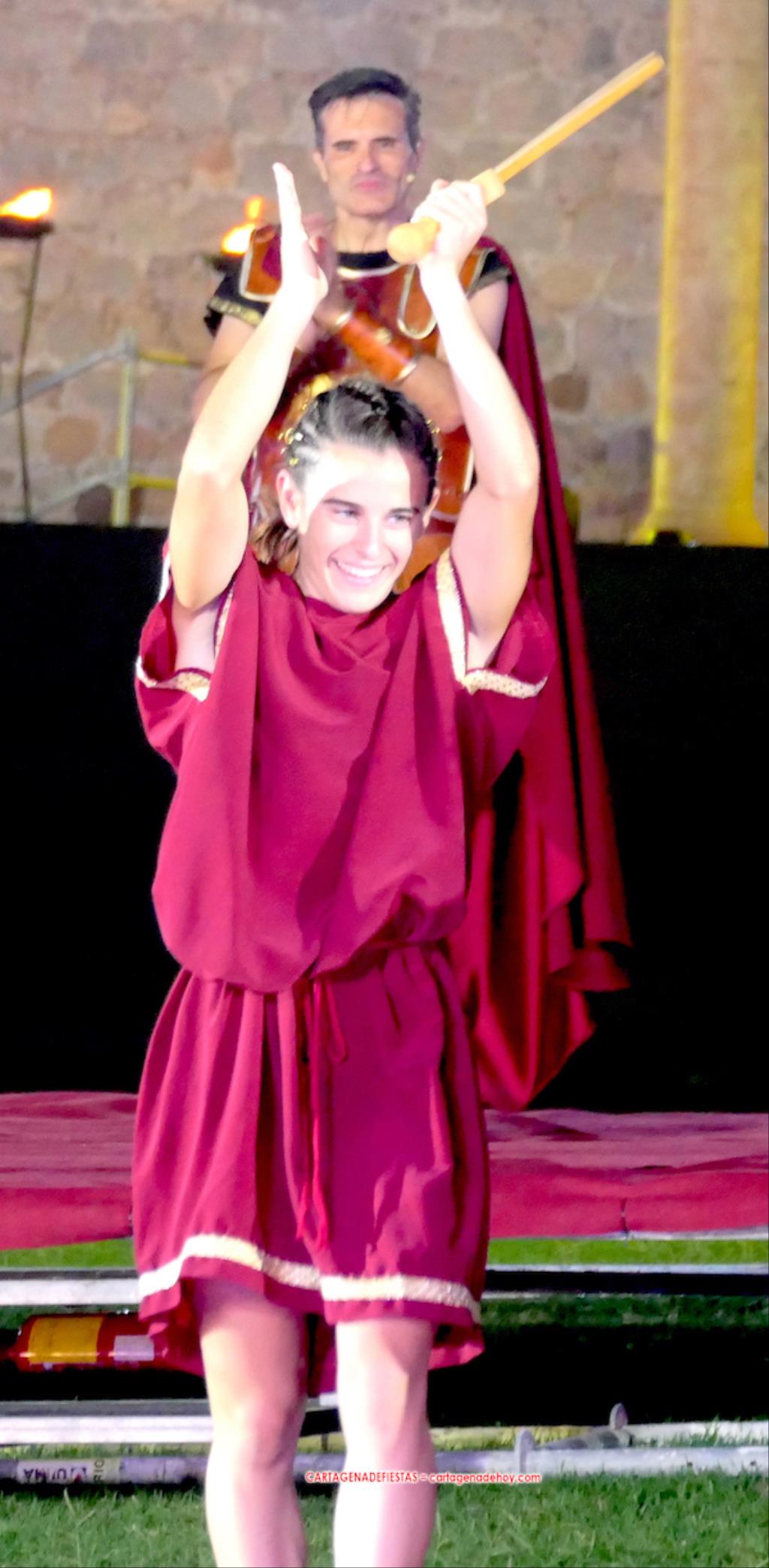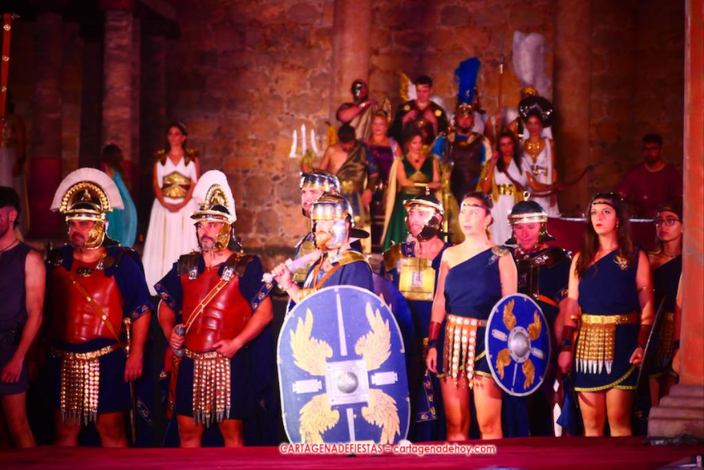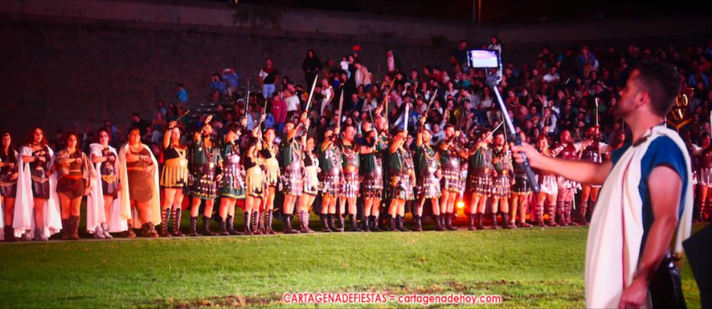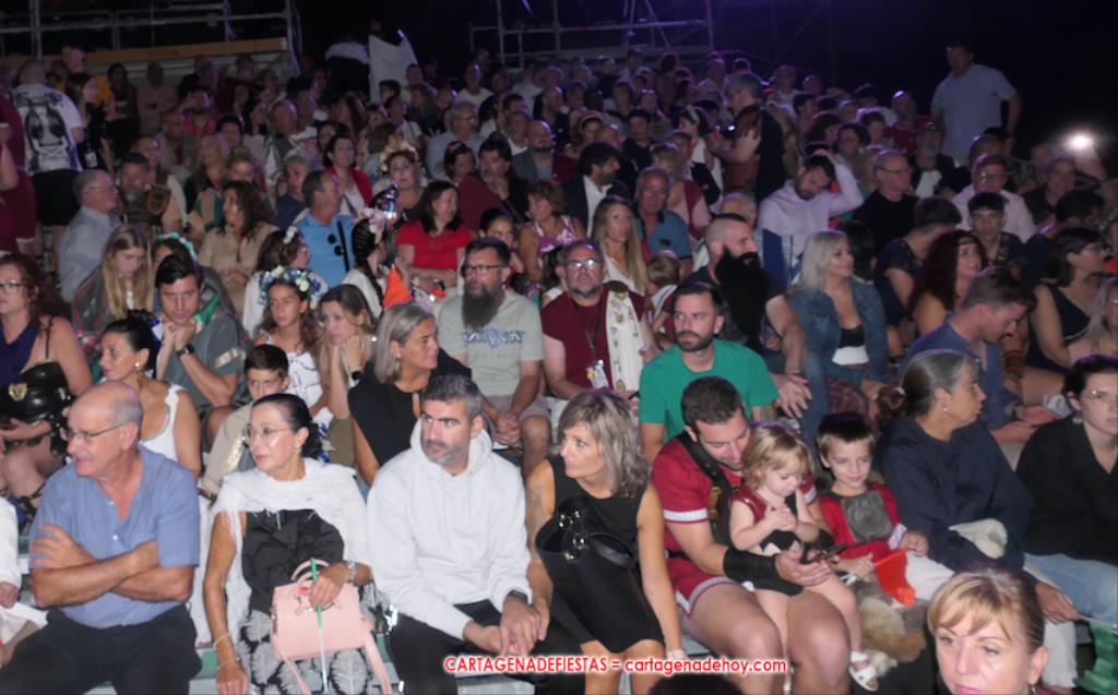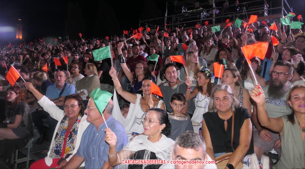 Todavía queda algo de la crónica, el presentador. Me gustó cómo llevó la presentación Luis Larrodera. Se nota que tiene recursos para salir de cualquier situación (cuando se perdió una bandera) y para arrancar sonrisas con chascarrillos o un chiste, como el que lanzó: ¿Por qué los romanos no llevan tirantes? Porque son más de centuriones. Autobautizado como 'Achus Pijus Magnífico', auspició una gran 'ola' con retorno y utilizó una improvisada entrevista a Escipión y Emilia Paula para divulgar tesoros de nuestra gastronomía: michirones, caldero y asiático. Luego, es de suponer que en un apartado pactado, se dirigió a 'la gobernardora' (la alcaldesa) y al 'emperador' (presidente del gobierno regional), diciéndole a López Miras si había venido "bien o en tren", lo que arrancó muchos aplausos por el olvido ferroviario que tiene esta tierra. "A orillas del Mediterráneo hay un pueblo que no quiere ser más que los demás, pero tampoco menos", expresó. Larrodena tenía libertad para interactuar con el público y en una de sus iniciativas aportó al espectáculo el momento de mayor ternura y simpatía. Sacó de las primeras filas al pequeño festero Nacho, de Rehenes de Carthago, quien, con cinco años de edad, cautivó a todos.