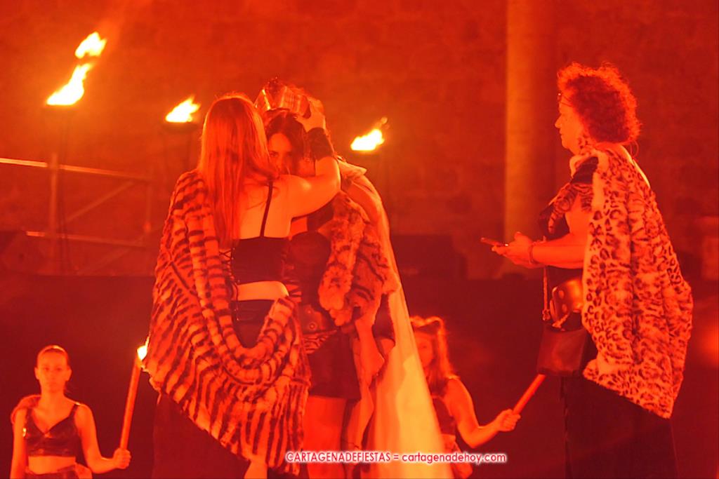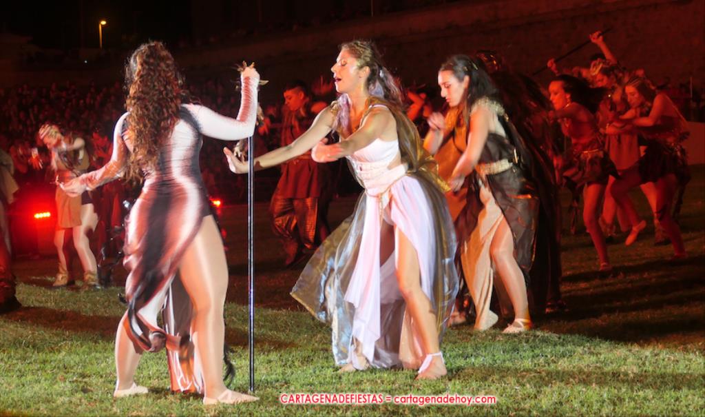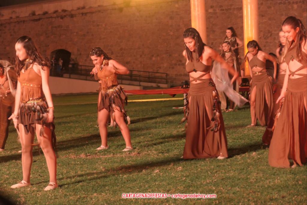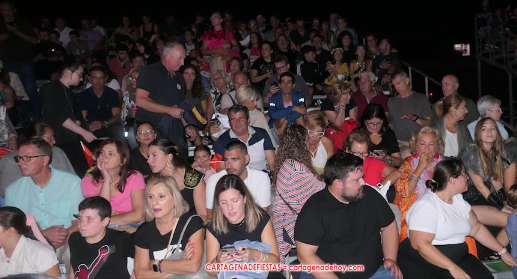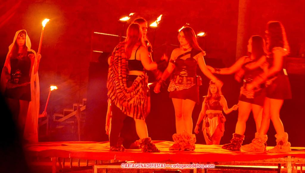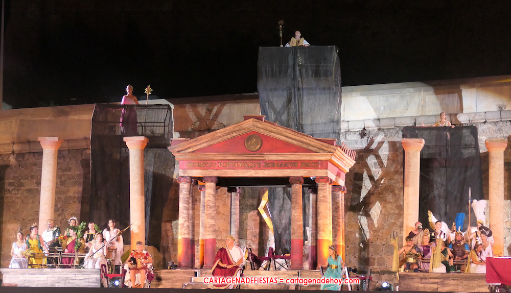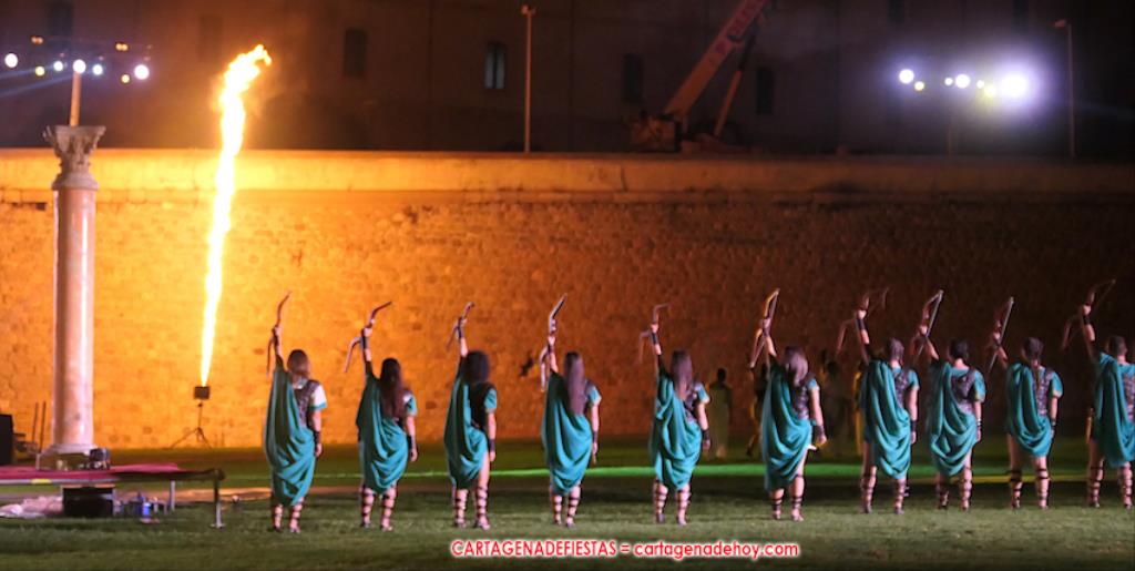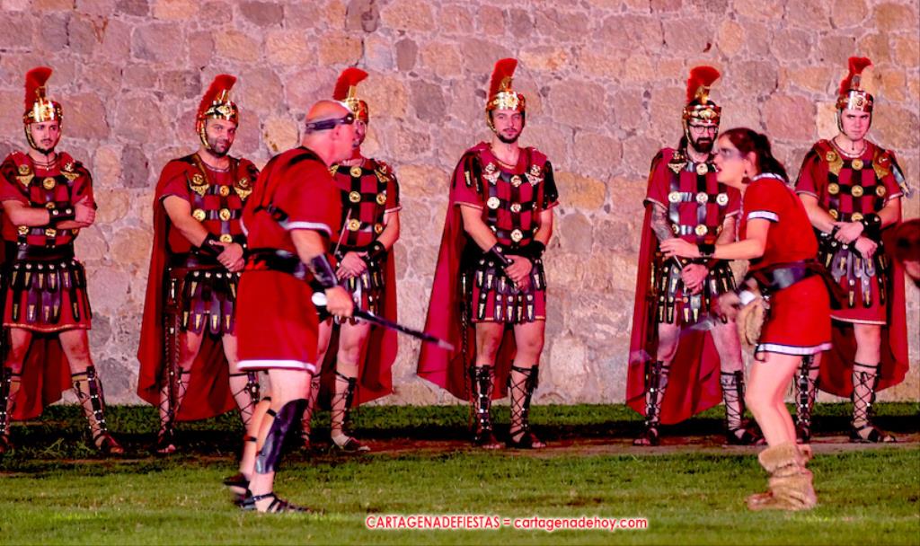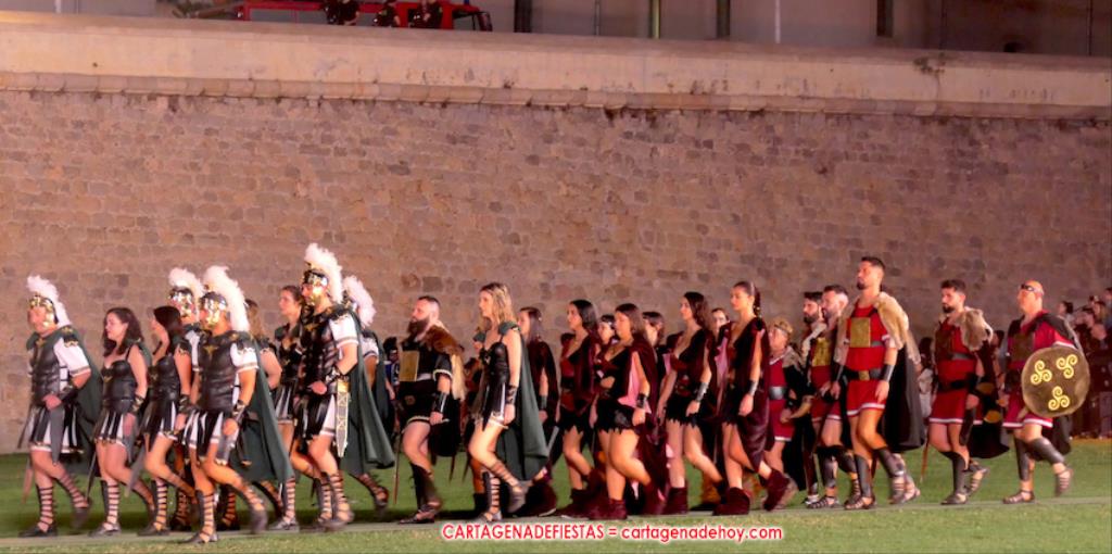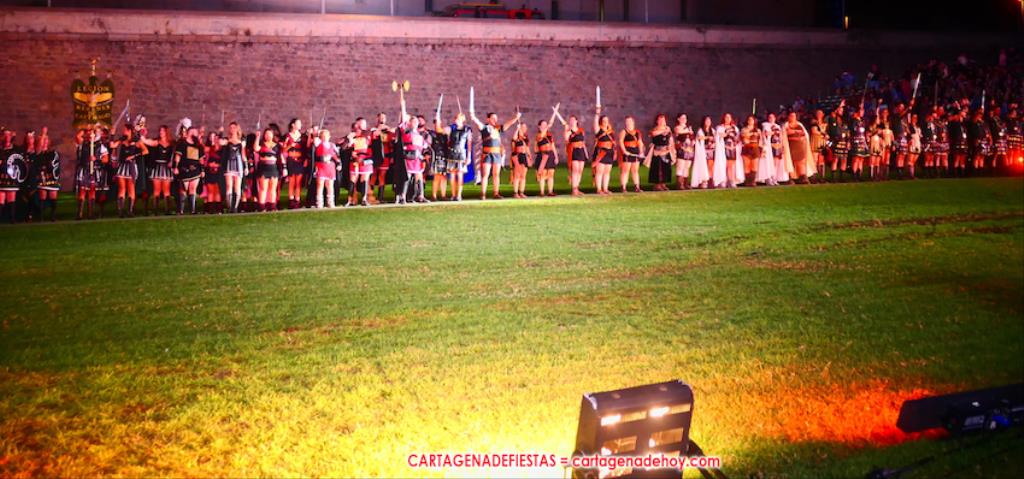 Todavía queda algo de la crónica, el presentador. Me gustó cómo llevó la presentación Luis Larrodera. Se nota que tiene recursos para salir de cualquier situación (cuando se perdió una bandera) y para arrancar sonrisas con chascarrillos o un chiste, como el que lanzó: ¿Por qué los romanos no llevan tirantes? Porque son más de centuriones. Autobautizado como 'Achus Pijus Magnífico', auspició una gran 'ola' con retorno y utilizó una improvisada entrevista a Escipión y Emilia Paula para divulgar tesoros de nuestra gastronomía: michirones, caldero y asiático. Luego, es de suponer que en un apartado pactado, se dirigió a 'la gobernardora' (la alcaldesa) y al 'emperador' (presidente del gobierno regional), diciéndole a López Miras si había venido "bien o en tren", lo que arrancó muchos aplausos por el olvido ferroviario que tiene esta tierra. "A orillas del Mediterráneo hay un pueblo que no quiere ser más que los demás, pero tampoco menos", expresó. Larrodena tenía libertad para interactuar con el público y en una de sus iniciativas aportó al espectáculo el momento de mayor ternura y simpatía. Sacó de las primeras filas al pequeño festero Nacho, de Rehenes de Carthago, quien, con cinco años de edad, cautivó a todos.