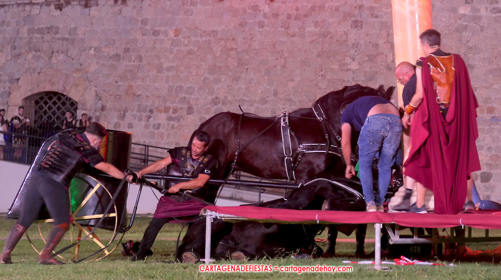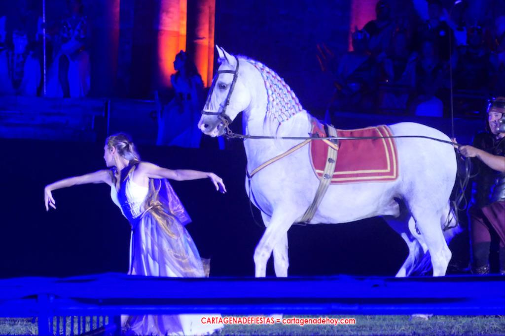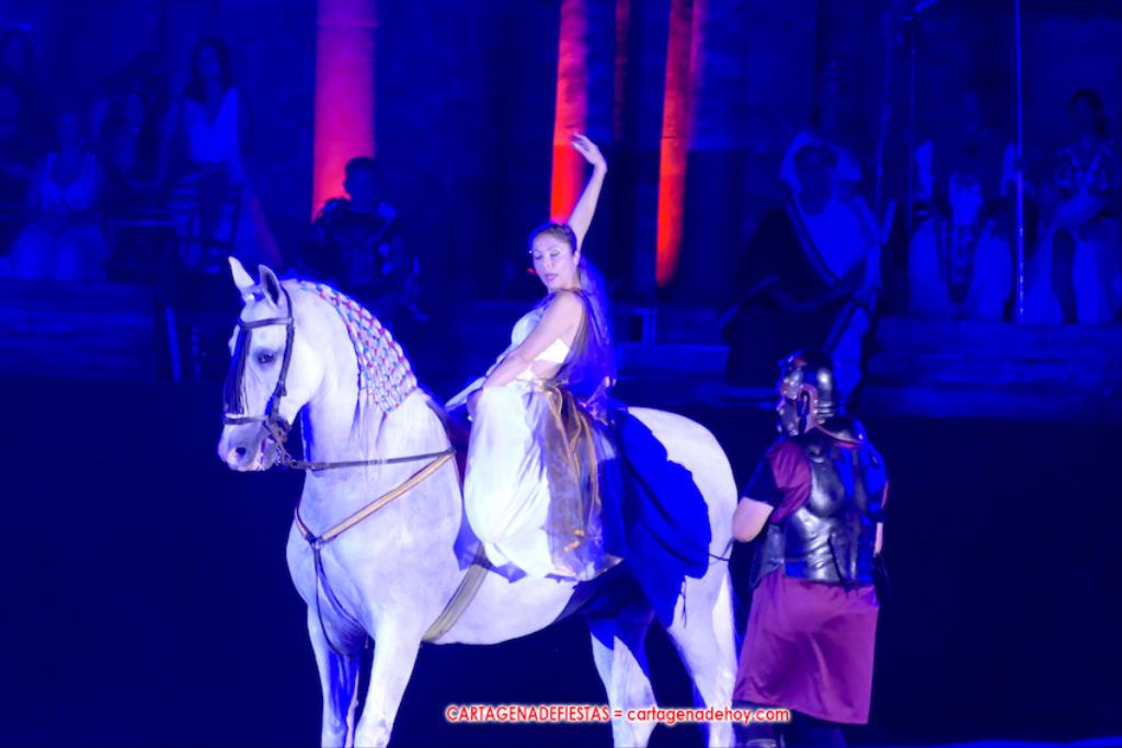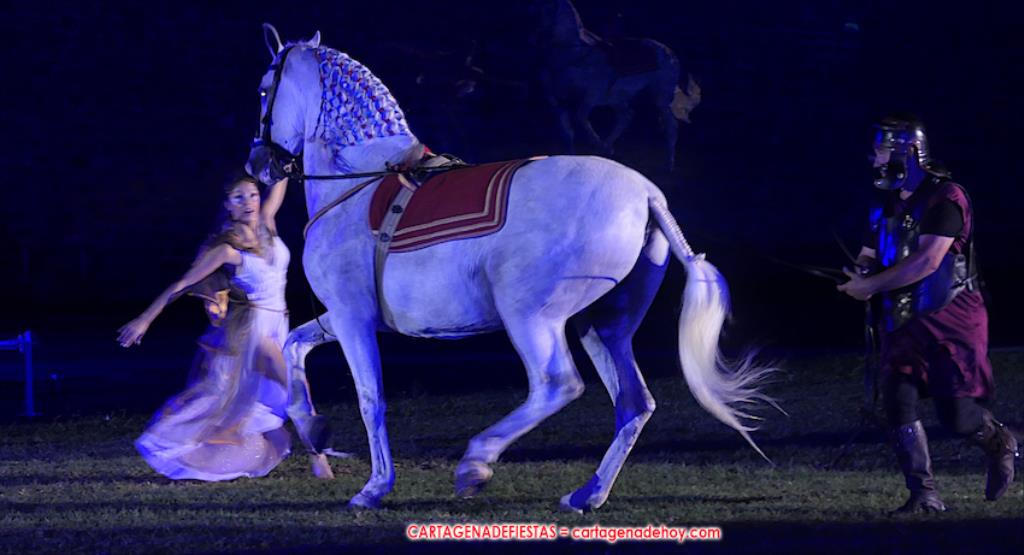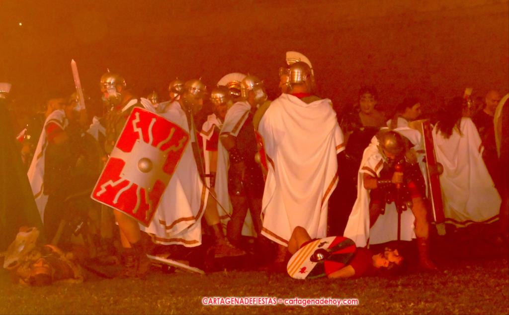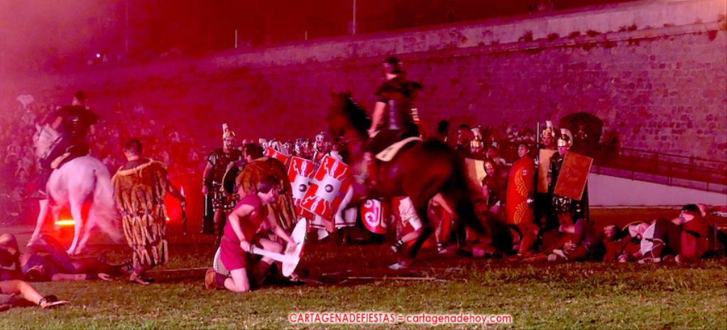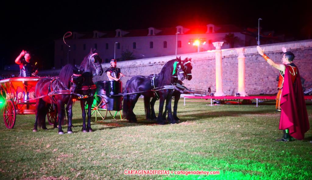 IV. POTESTAS MILITARIS. En este capítulo tuvo lugar la entrada de Escipión y Emilia Paula (con rostro de ir temerosa) en una cuádriga tirada por el cartagenero Agustín Solano (su cuadra cubrio el capítulo equino del Circo). En este momento se había cumplido una hora de ameno espectáculo. A continuación entraron doscientos festeros de las 25 legiones a golpe de tambor y con saludas al cónsul, para a continuación tener lugar una batalla, cuya mejor imagen dejaron los jinetes a caballo.