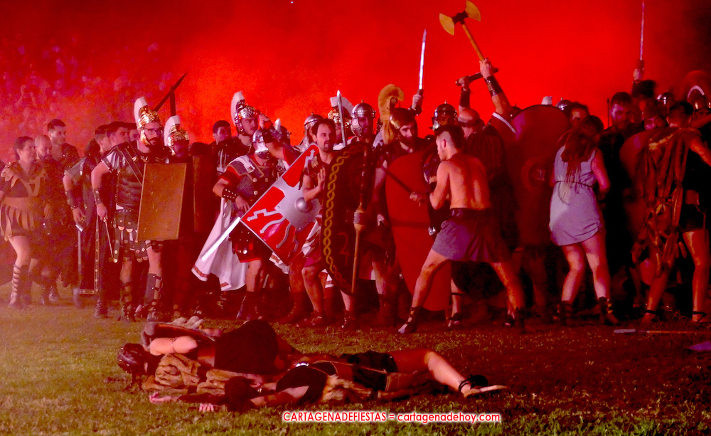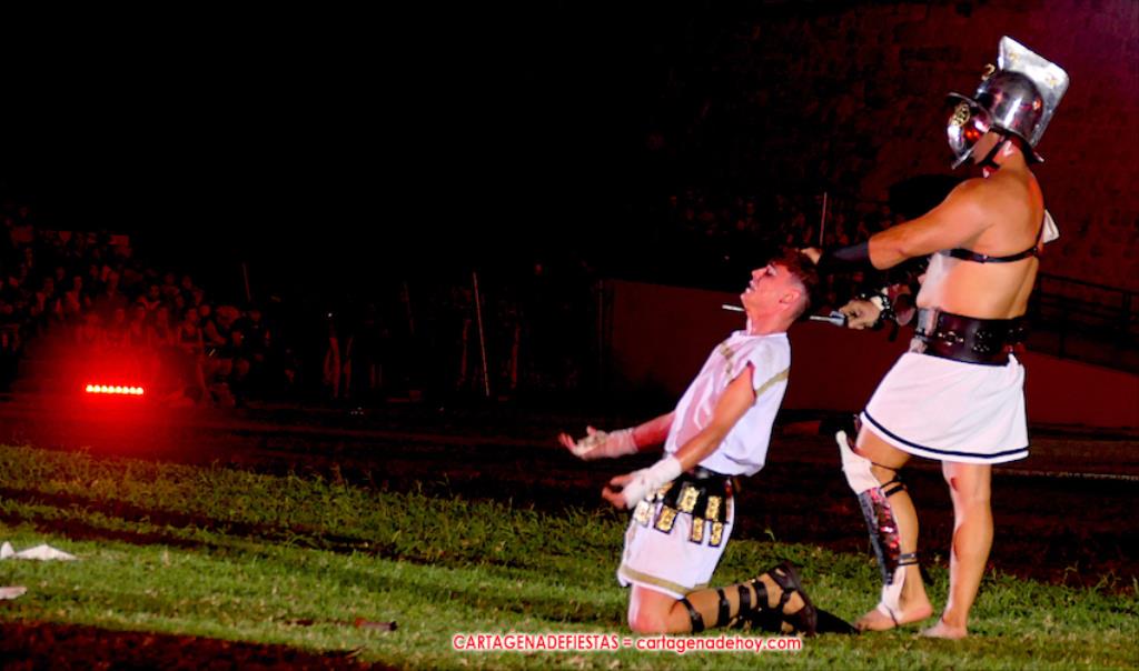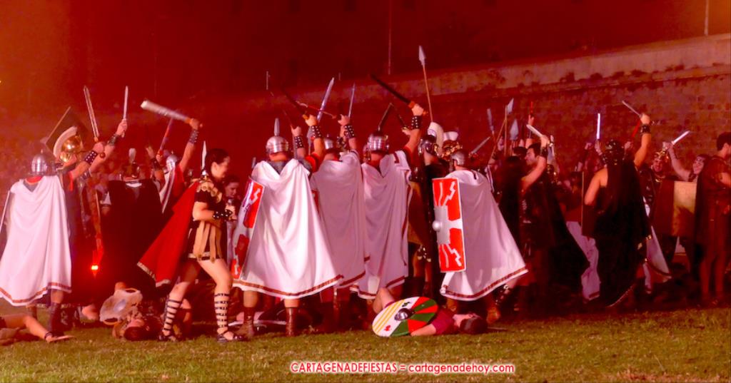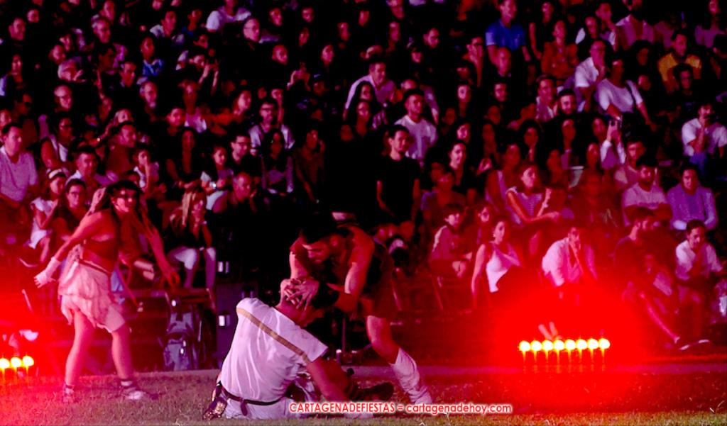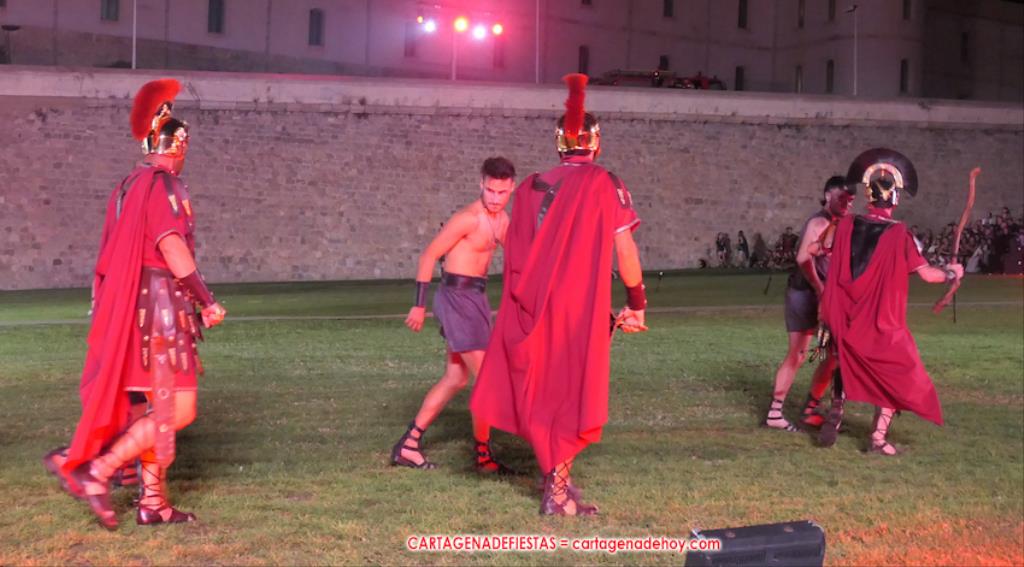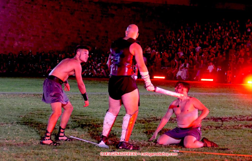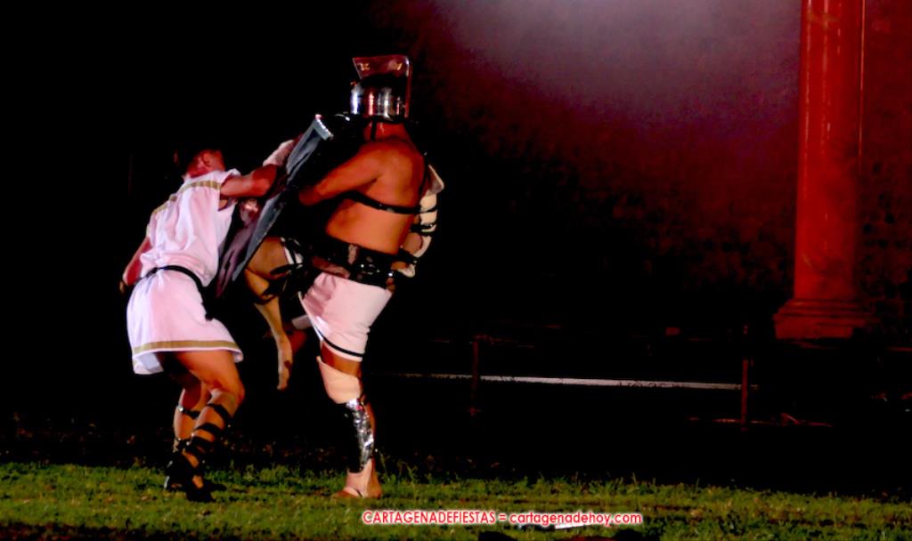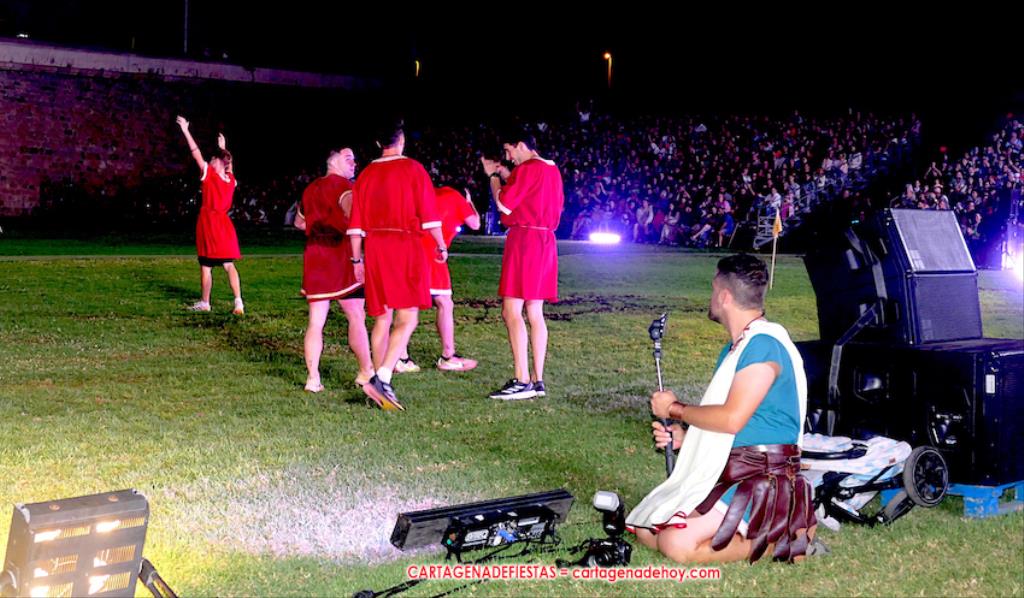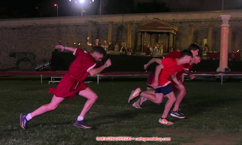 V. ROMA AT ETERNA. Turno para la competición con dos carreras, entre cuyos participantes (todos atletas del UCAM Cartagena) estaban dos promesas del atletismo cartagenero, ahora en edad sub-20, Eva Ibarra y Jaime Mendoza. La carrera que ganó ella arrancó numerosos aplausos por la velocidad que cogió. A su conclusión llegaron legionarios con esclavos, quienes lucharon entre sí en el circo. Los vencedores se enfrentaron después a los afamados gladiadorses. '¡Pugnate!'. Triunfó Atilius, pero el publico instó al cónsul a salvar la vida (vita) del esclavo que se metió en la final. Después, el gladiador le entregó la espada de madera de la libertad.