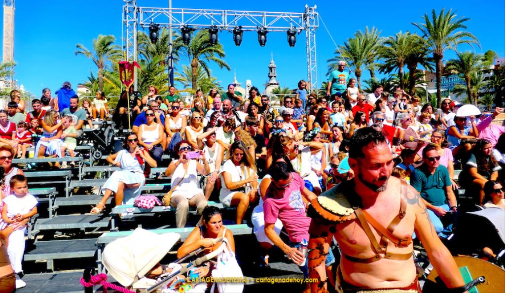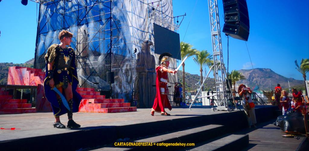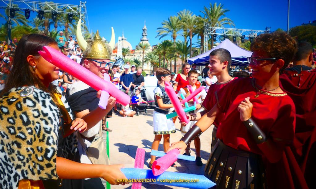 La brisa del mar ha envuelto este año la batalla infantil de Carthagineses y Romanos en el puerto de Cartagena, donde numerosos chavales de tropas y legiones han disfrutado con la representación y combate de la toma de la ciudad de Qart-Hadast.