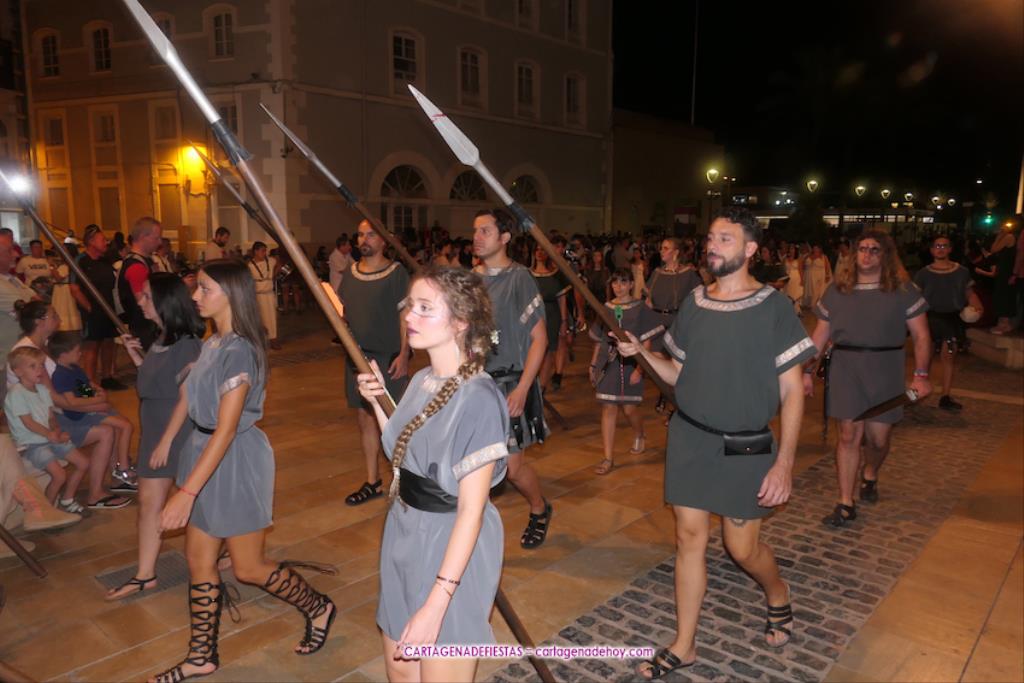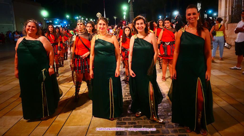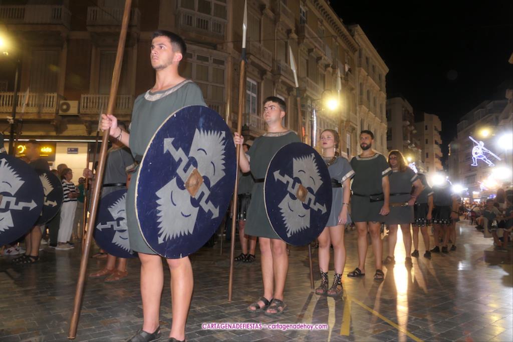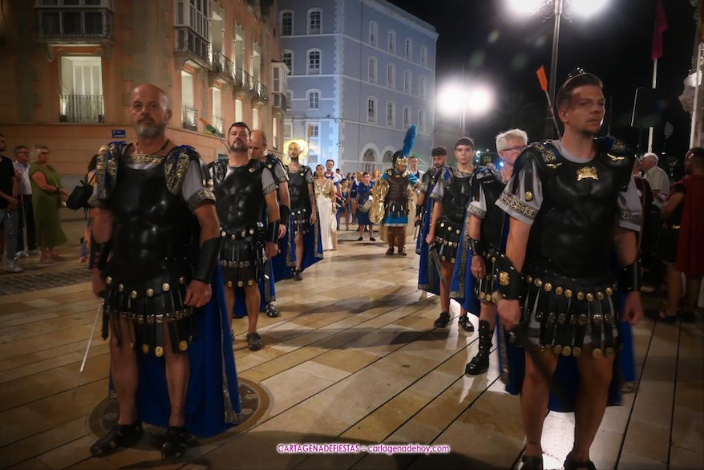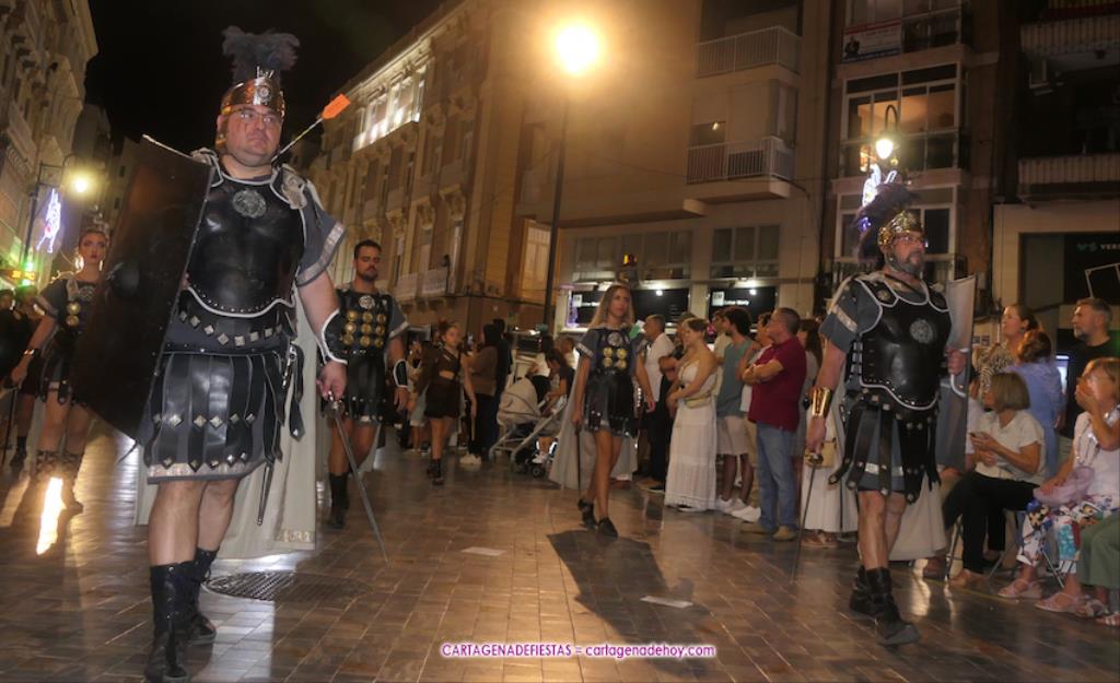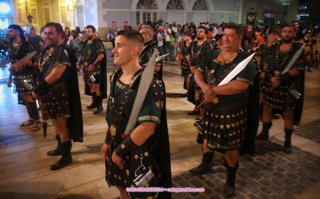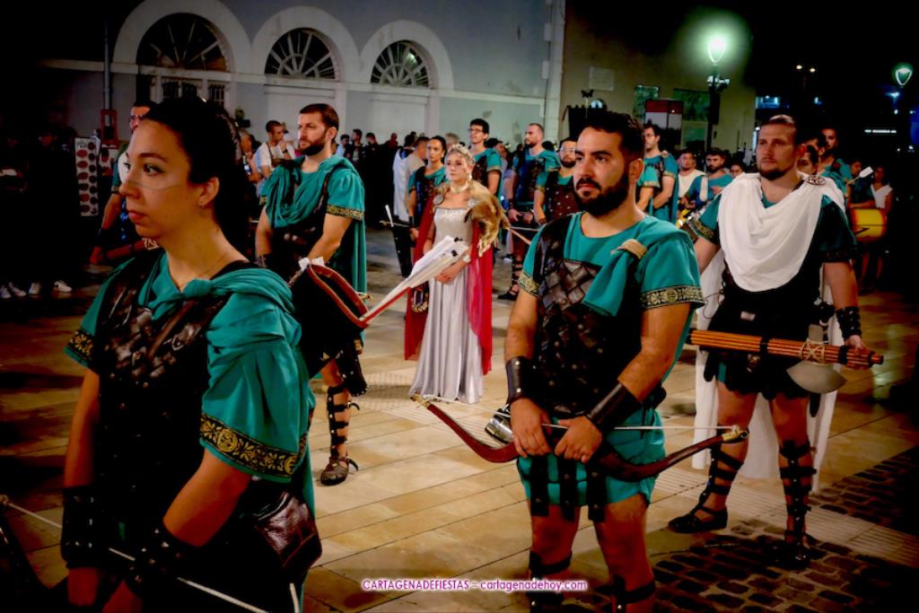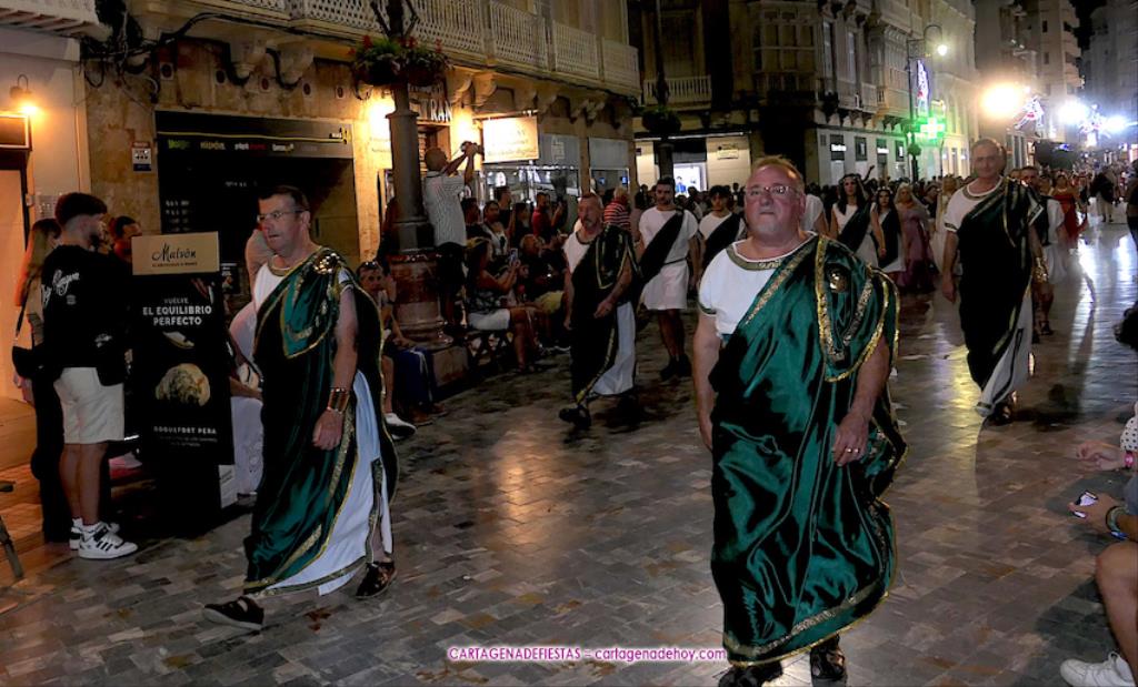 Unas dos mil personas protagonizaron el ‘Desfile de la victoria’ del Senado en las Fiestas de Carthagineses y Romanos, que comenzó en la plaza del Ayuntamiento y expiró en el campamento festero. Por cierto, si en otros artículos hemos reseñado importantes retrasos que han tenido algunos actos de estas fiestas, apuntar que tanto las representaciones de las coronas murales, liberación de rehenes y proclamación de la Ley de Roma fueron (casi) puntuales, saliendo de inmediato el gran desfile, lo que evitó espacios sin actividad para el espectador.