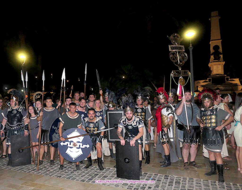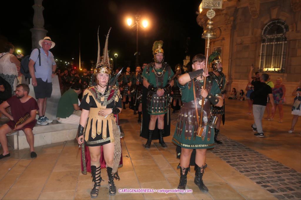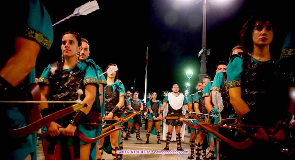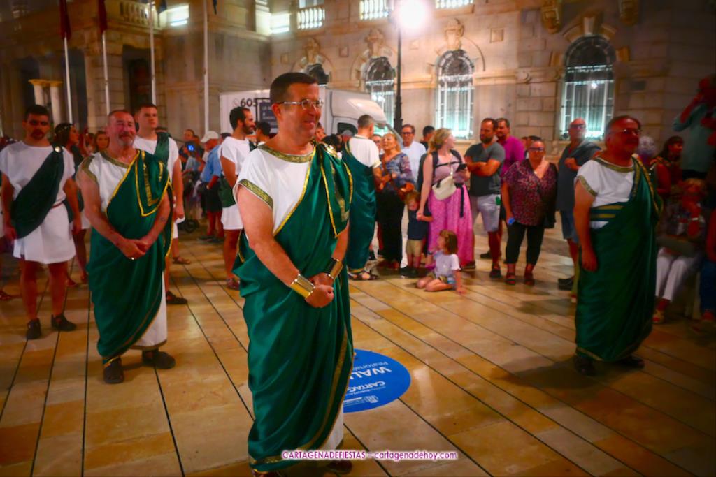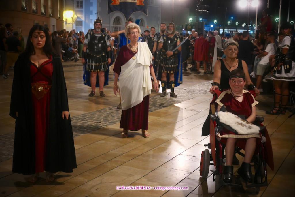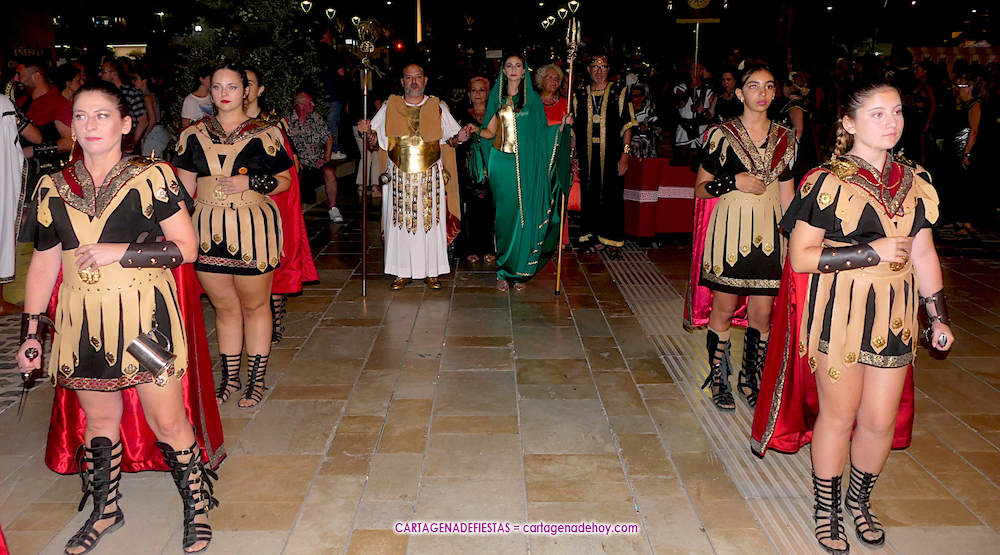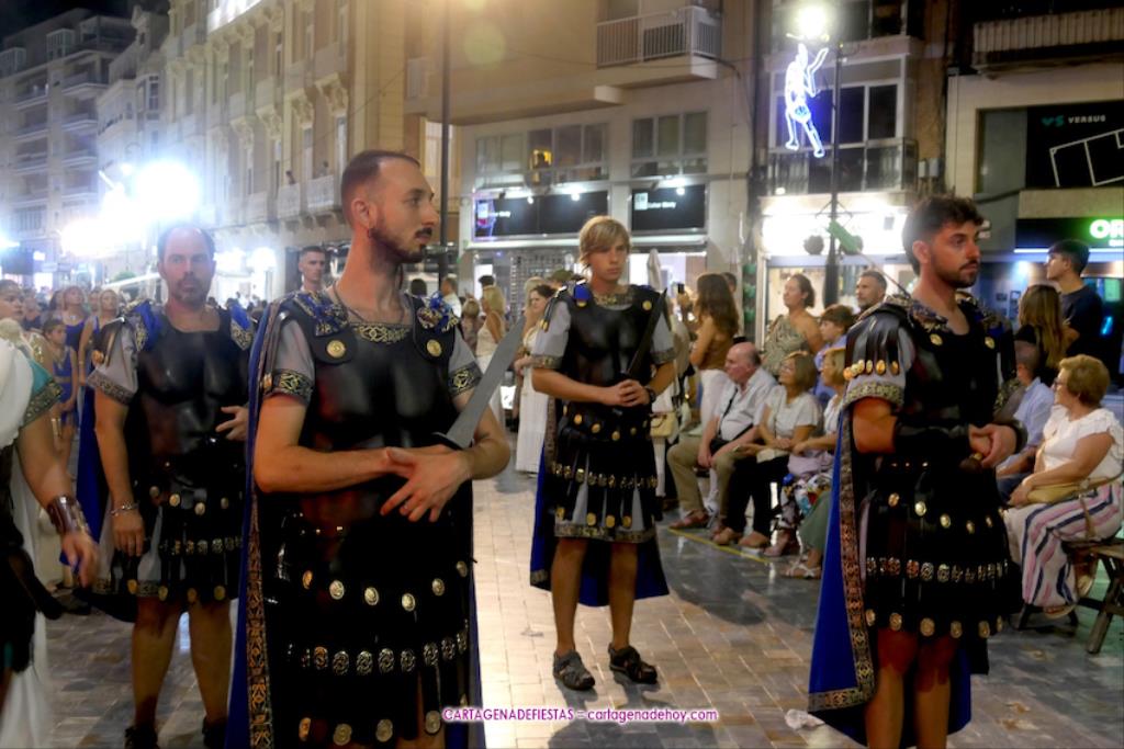 Unas dos mil personas protagonizaron el ‘Desfile de la victoria’ del Senado en las Fiestas de Carthagineses y Romanos, que comenzó en la plaza del Ayuntamiento y expiró en el campamento festero. Por cierto, si en otros artículos hemos reseñado importantes retrasos que han tenido algunos actos de estas fiestas, apuntar que tanto las representaciones de las coronas murales, liberación de rehenes y proclamación de la Ley de Roma fueron (casi) puntuales, saliendo de inmediato el gran desfile, lo que evitó espacios sin actividad para el espectador.