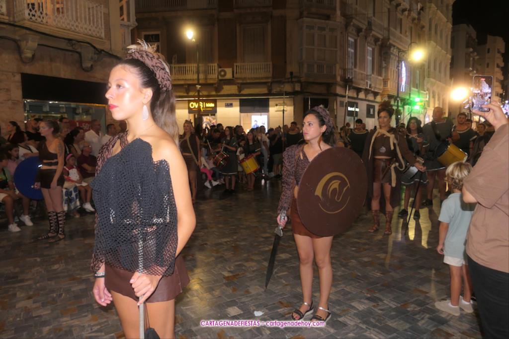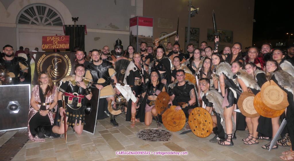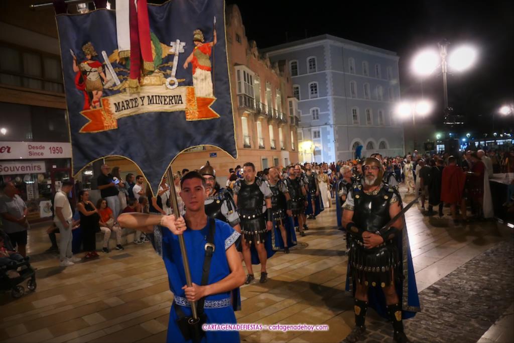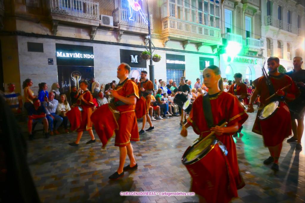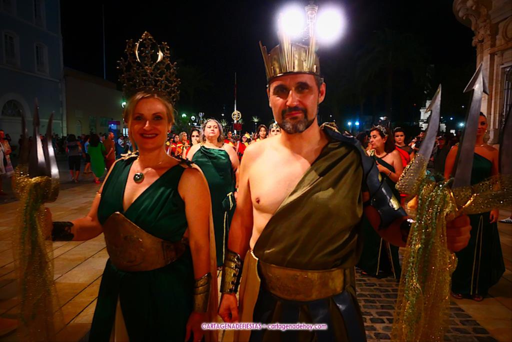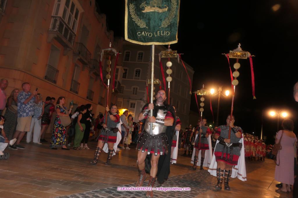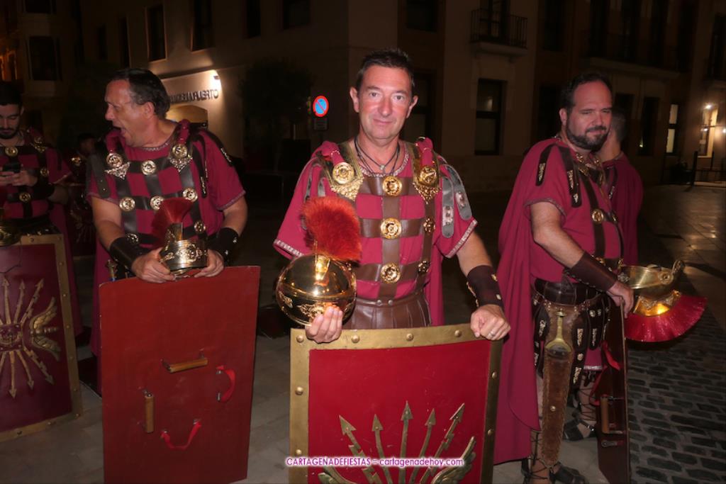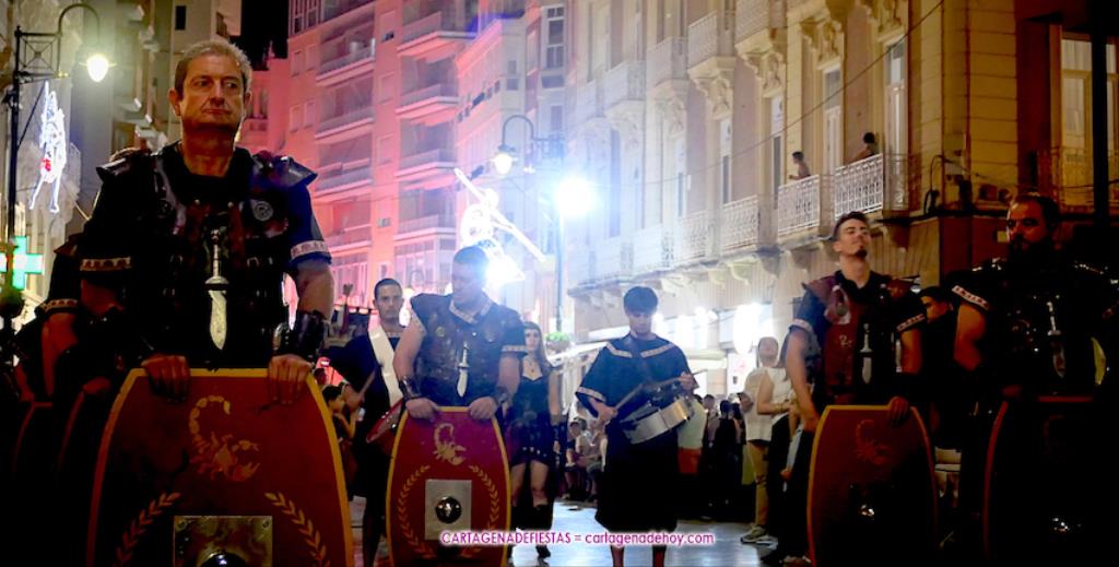 Unas dos mil personas protagonizaron el ‘Desfile de la victoria’ del Senado en las Fiestas de Carthagineses y Romanos, que comenzó en la plaza del Ayuntamiento y expiró en el campamento festero. Por cierto, si en otros artículos hemos reseñado importantes retrasos que han tenido algunos actos de estas fiestas, apuntar que tanto las representaciones de las coronas murales, liberación de rehenes y proclamación de la Ley de Roma fueron (casi) puntuales, saliendo de inmediato el gran desfile, lo que evitó espacios sin actividad para el espectador.