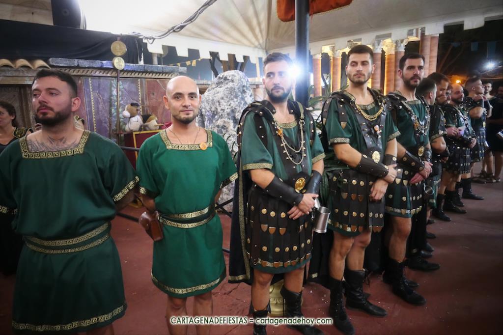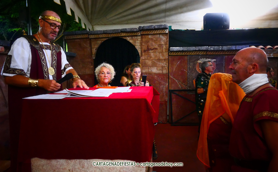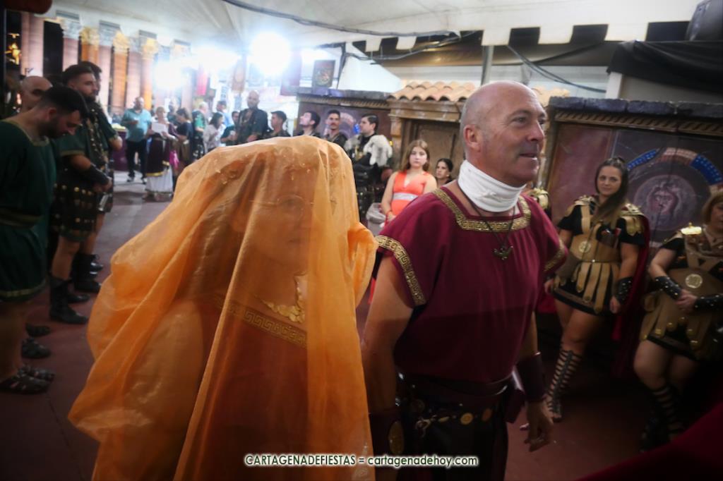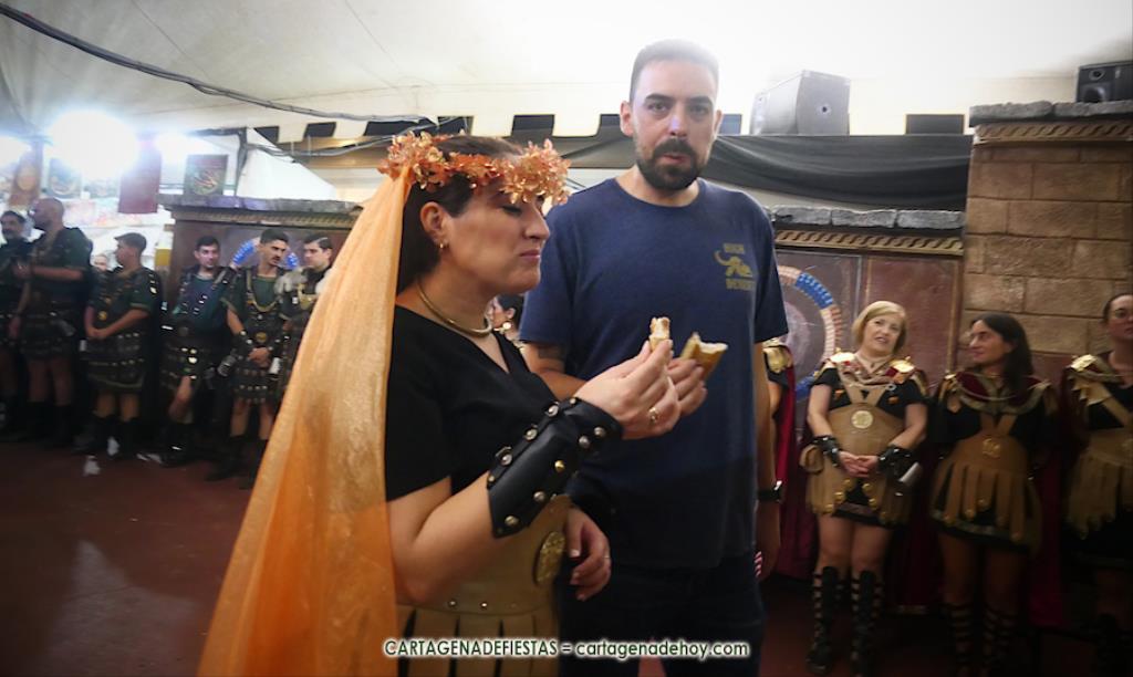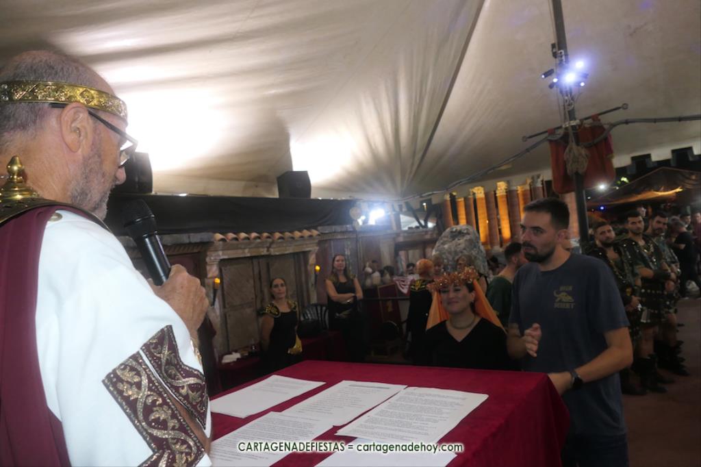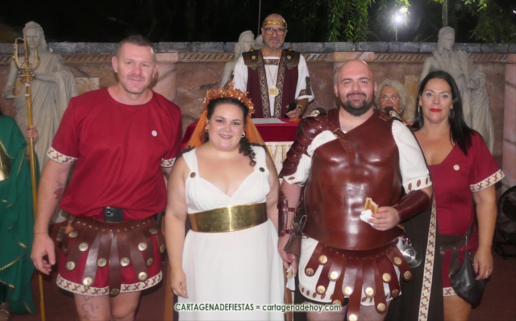 La legión de Triunviros de Cartagonova arropa este tradicional acto de campamento, llevando todos el uniforme de gala y formando un pasillo a los novios. Destaca que Pedro Vidal anunció que este es su último año como 'casamentero romano' después de más de veinte años, siendo el enlace entre los dioses Venus y Vulcano, que tuvo lugar tras las bodas que recogemos en este artículo, su despedida como gran 'Flamine Dial'.