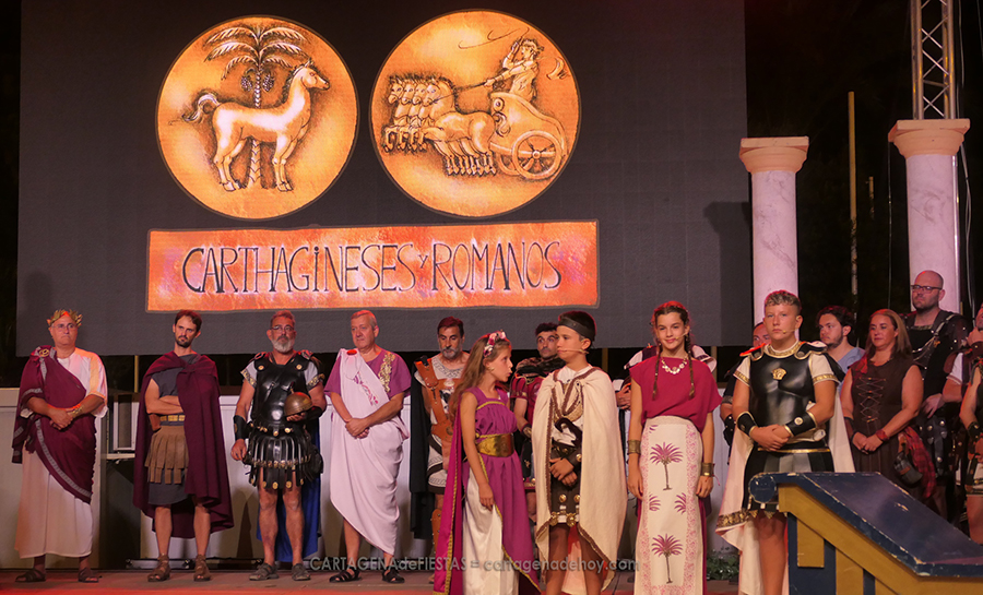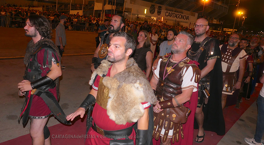 El acto de cierre de esta edición de Carthagineses y Romanos relevó en el escenario a los dioses, como era habitual en ediciones anteriores, por los 50 presidentes de tropas y legiones, piezas fundamentales también en el engranaje festero.
