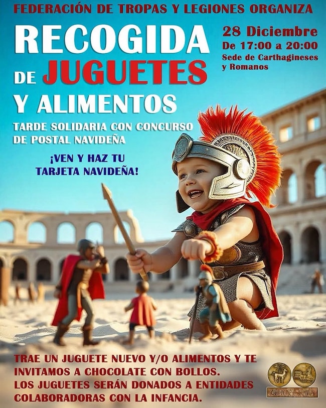La federación de los grupos de las fiestas Carthagineses y Romanos organiza este sábado por la tarde, en la sede de la calle Serreta, un animado encuentro navideño con los chavales en el que se recogerán juguetes y alimentos para familias con escasos recursos y se invitará a los donantes con chocolate con bollos, además de celebrar un concurso de postales navideñas.