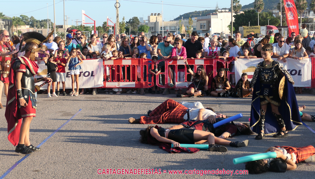 Cientos de chavales carthagineses y romanos ofrecen una estupenda batalla por la toma de Qart-Hadast demostrando que hay cantera para el futuro festero. En la foto, Magón Giscón avanza entre los 'cadáveres' hacia Escipión para rendir la ciudad.