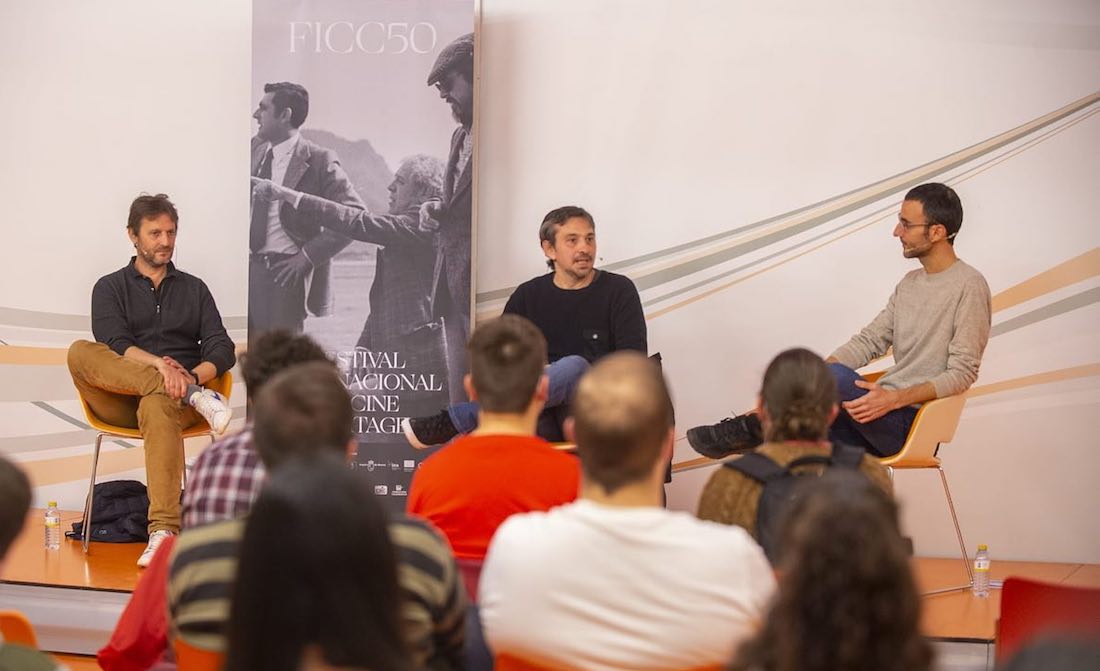 El Festival Internacional de Cine de Cartagena proyecta hoy dos largometrajes aclamados por la crítica internacional: ‘Playground’ y ‘Las ilusiones perdidas’, basada en la novela de Balzac. Además continúa la sección oficial de cortometrajes ‘Murcine’ y ‘Europa.doc’ con un documental sobre la vida de Fernando Fernán Gómez y su compañera Emma Cohen. En la imagen se observa la tertulia que ayer mantuvieron David Macián y Daniel Castro bajo la moderación de Raúl Cornejo.