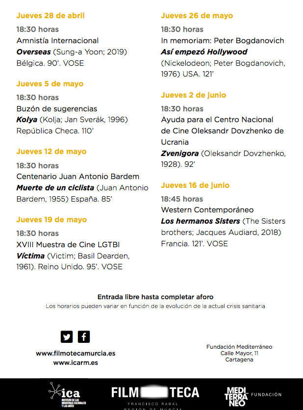 La Filmoteca Regional de Cartagena publica su programación para los meses de abril a junio