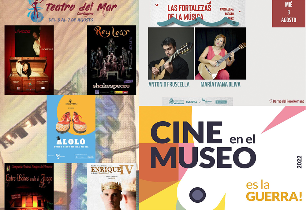 El auditorio 'Paco Martín' del Parque Torres, el Barrio del Foro Romano y el Museo Arqueológico Municipal acogerán desde hoy obras teatrales, conciertos y proyecciones, respectivamente, con el festival Teatro del Mar y los ciclos de Las Fortalezas de la Música y el cine de verano antibélico ‘Es la guerra!’. Todos ellos están impulsados y organizados por la concejalía de Cultura del Ayuntamiento de Cartagena.