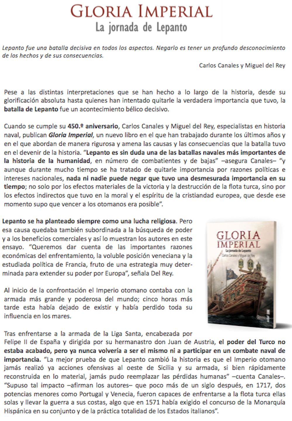 Pese a las distintas interpretaciones que se han hecho a lo largo de la historia, desde su glorificación absoluta hasta quienes han intentado quitarle la verdadera importancia que tuvo, la batalla de Lepanto fue un acontecimiento bélico decisivo. Cuando se conmemora su 450.º aniversario, Carlos Canales y Miguel del Rey publican Gloria Imperial, un nuevo libro en el que han trabajado durante los últimos años y en el que abordan las causas y las consecuencias que el combate naval tuvo en el devenir de la historia.