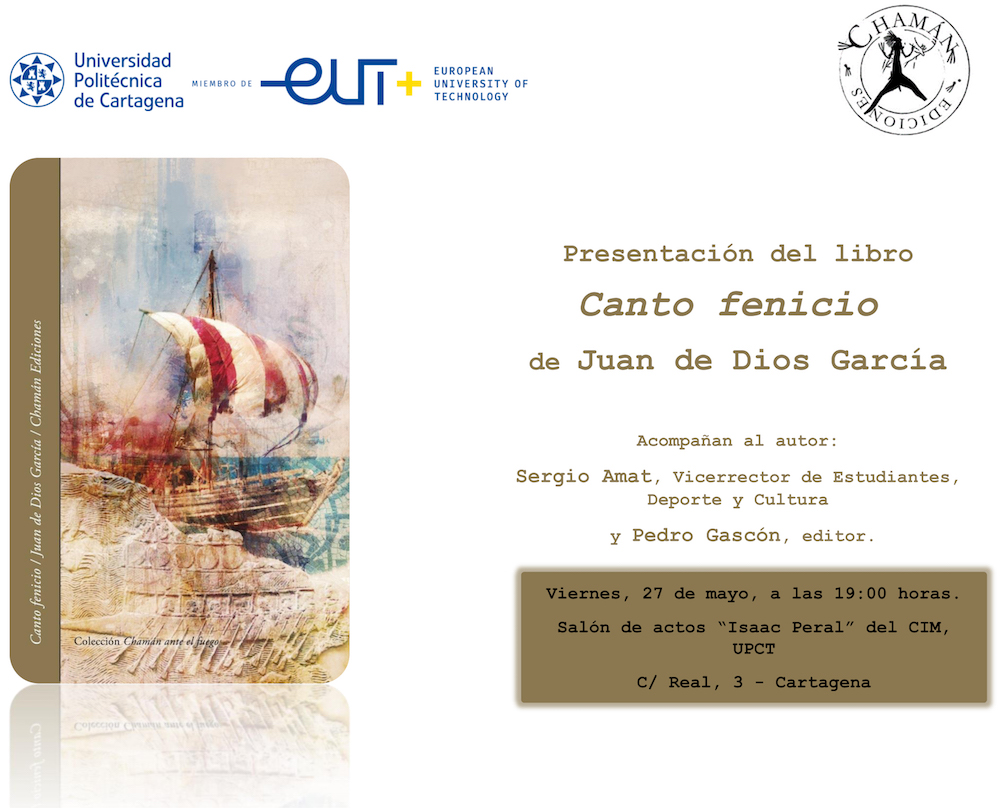 La obra de Juan de Dios García se dará a conocer el 27 de mayo, a las 19 horas, en el salón de actos ‘Isaac Peral’ de la Facultad de Ciencias de la Empresa de la UPCT. Acompañarán al autor Sergio Amat (vicerrector de Estudiantes, Deportes y Cultura) y Pedro Gascón (editor de Chamán). Entrada libre para los interesados.