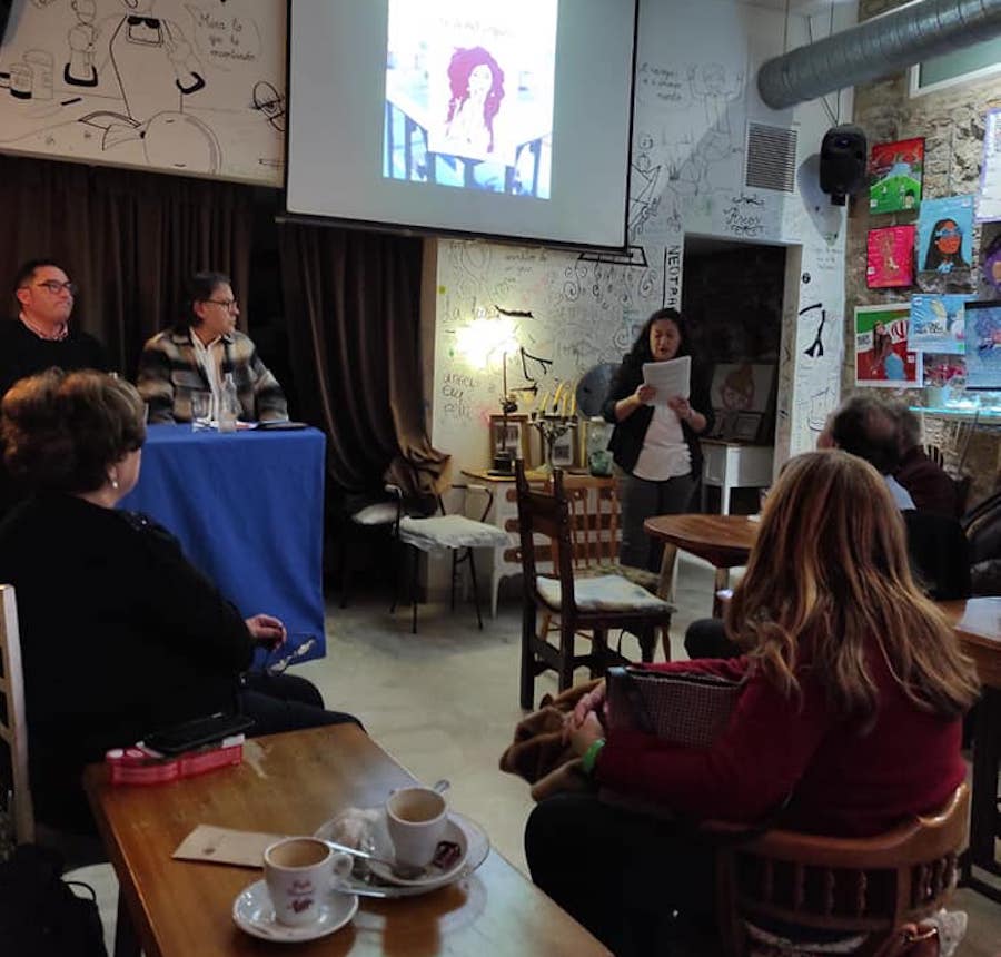 El escritor nativo de La Palma mantuvo un encuentro literario en una cafetería del casco histórico, que resultó muy animado. Contó con José Sánchez Conesa, del equipo de cronistas oficiales de Cartagena, como moderador del acto, siendo Sara Martín quien puso voz a los fragmentos de novelas, relatos y poemas del escritor. Se sorteó el libro 'Poemas de amor y lucha' entre los asistentes.
