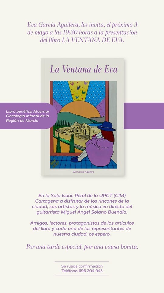 Es el título del libro escrito por Eva García Aguilera, que será presentado el 3 de mayo (19.30 horas) en la sala Isaac Peral de la UPCT y cuya recaudación será a beneficio de Afacmur (Asociación de Familiares de Niños con Cáncer de la Región de Murcia). El acto contará con la música en directo del guitarrista Miguel Ángel Solano Buendía.